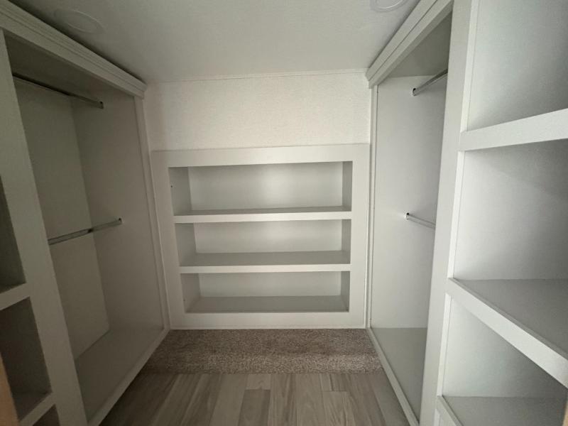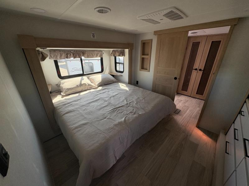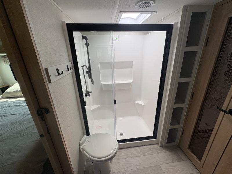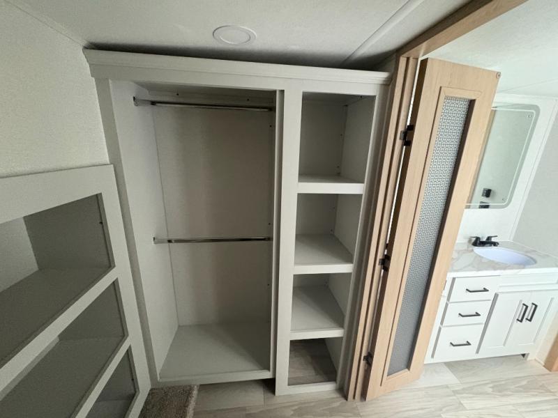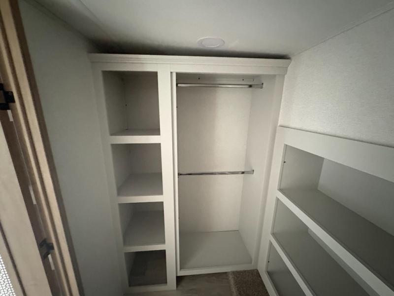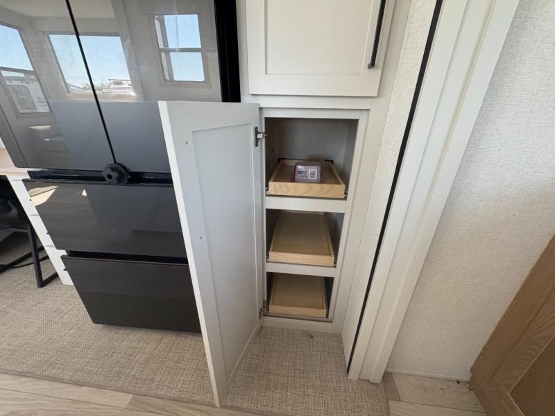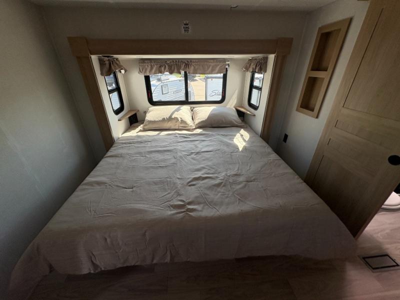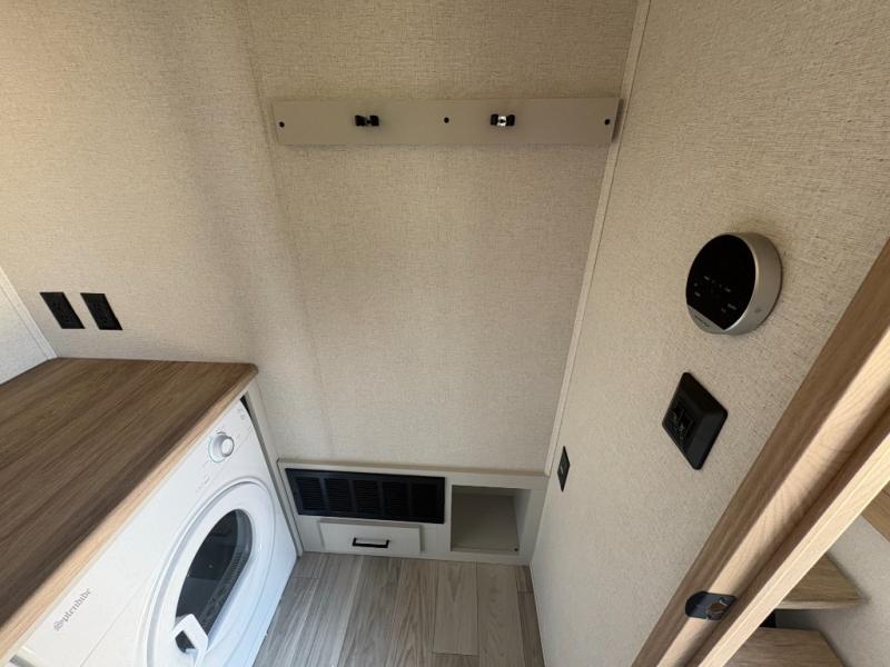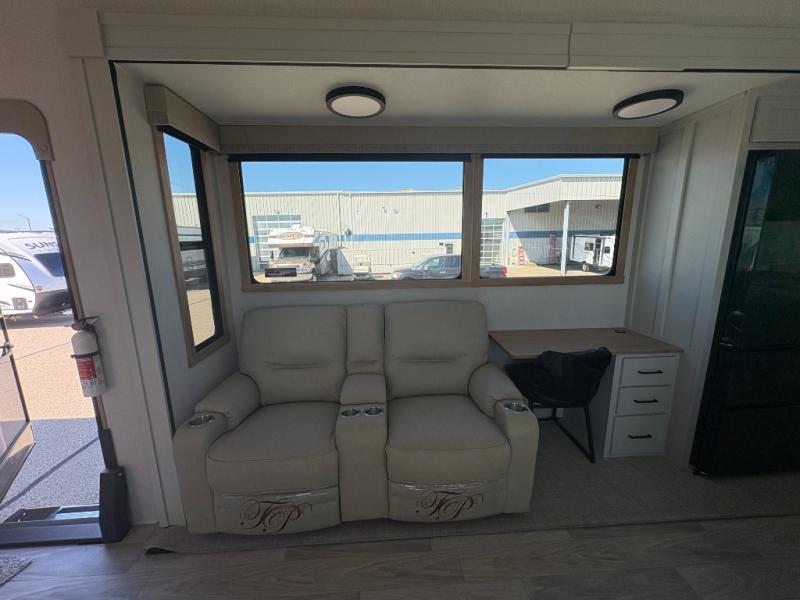 If you're looking to go full-time RVing, this fifth wheel is packed with convenient features! The master bedroom includes a king bed slide out with USB ports on either side of the bed so you both can charge your phones, and there is a dresser for your folded clothes. You will love the front bathroom with dual bath sinks, a shower with a seat, plus a walk-in closet with shelves! There is a unique middle utility room with washer and dryer prep and a counter that will make a perfect laundry room, or you can utilize this space for storage! Head to the main living area to relax on the theater seating or hide-a-bed sofa, and if you have guests stay over, they can sleep here. There is also an entertainment center with a 50" flat screen TV, but you might just leave that off if you're working at the desk with a chair that is provided. We've saved the best part for last; the kitchen! Here, you'll find ample counter space to prep home-cooked meals, a three burner range with a 24" oven, plus a large counter with barstools where you can enjoy breakfast at each morning. Choosing this fifth wheel is a no-brainer!
