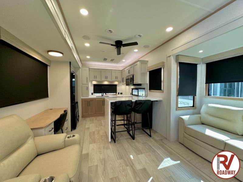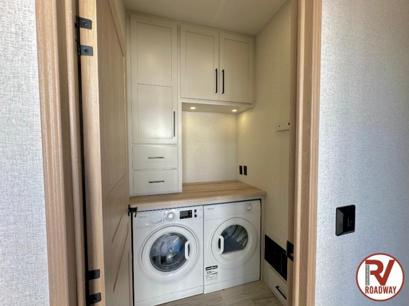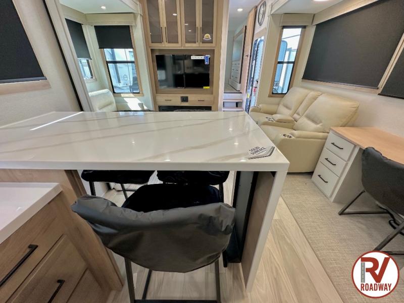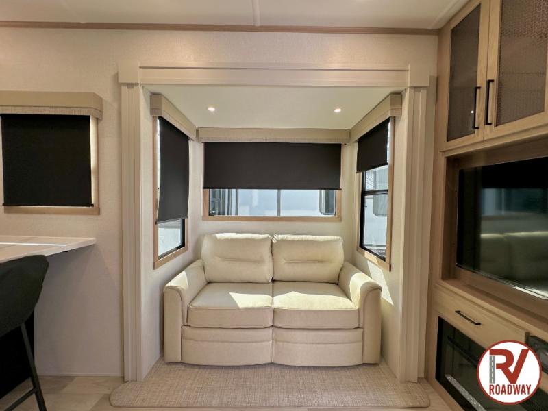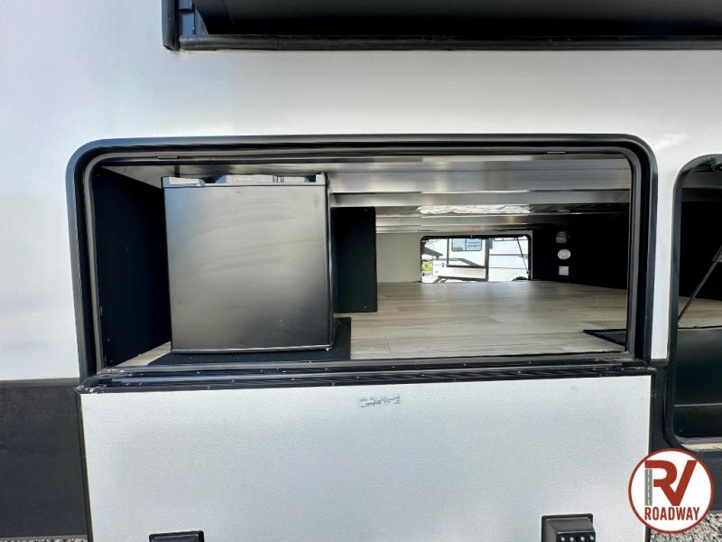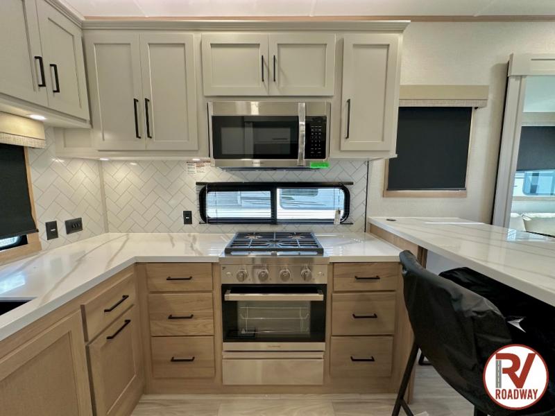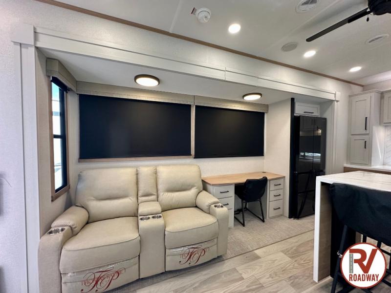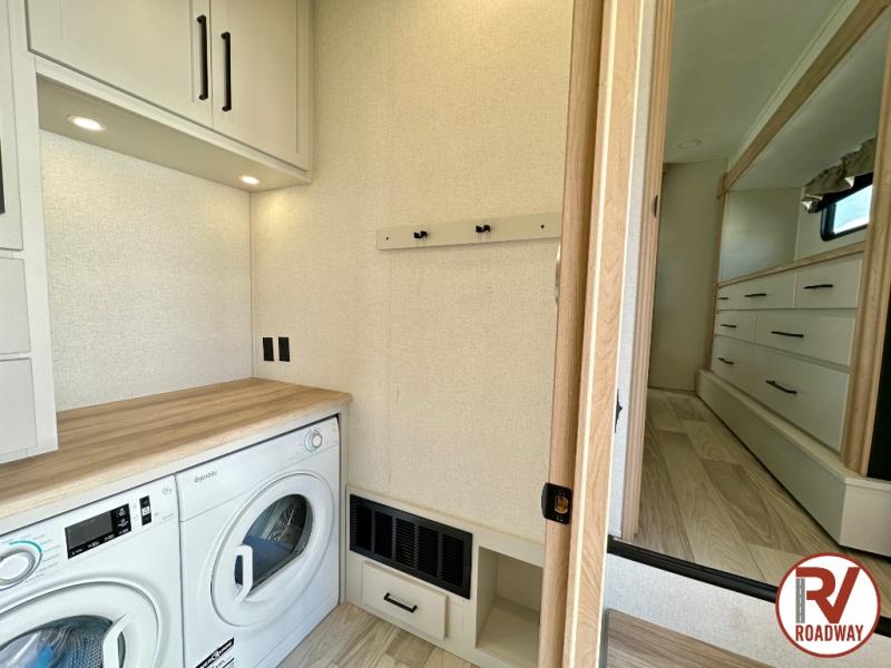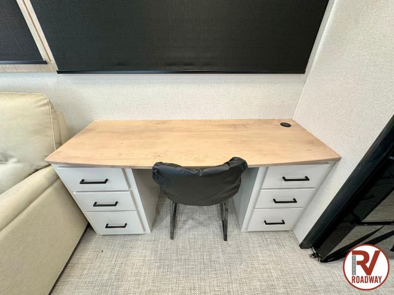 If you're looking to go full-time RVing, this fifth wheel is packed with convenient features! The master bedroom includes a king bed slide out with USB ports on either side of the bed so you both can charge your phones, and there is a dresser for your folded clothes. You will love the front bathroom with dual bath sinks, a shower with a seat, plus a walk-in closet with shelves! There is a unique middle utility room with washer and dryer prep and a counter that will make a perfect laundry room, or you can utilize this space for storage! Head to the main living area to relax on the theater seating or hide-a-bed sofa, and if you have guests stay over, they can sleep here. There is also an entertainment center with a 50" flat screen TV, but you might just leave that off if you're working at the desk with a chair that is provided. We've saved the best part for last; the kitchen! Here, you'll find ample counter space to prep home-cooked meals, a three burner range with a 24" oven, plus a large counter with barstools where you can enjoy breakfast at each morning. Choosing this fifth wheel is a no-brainer!