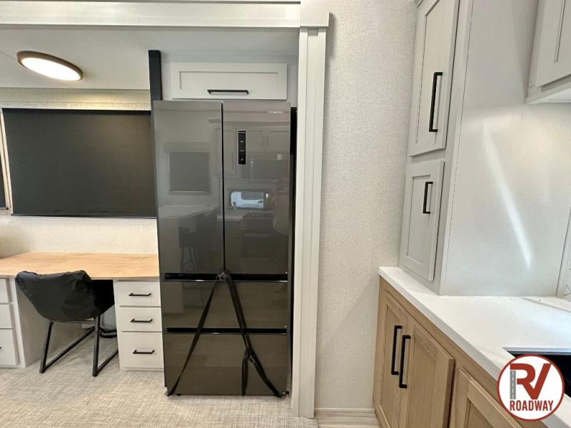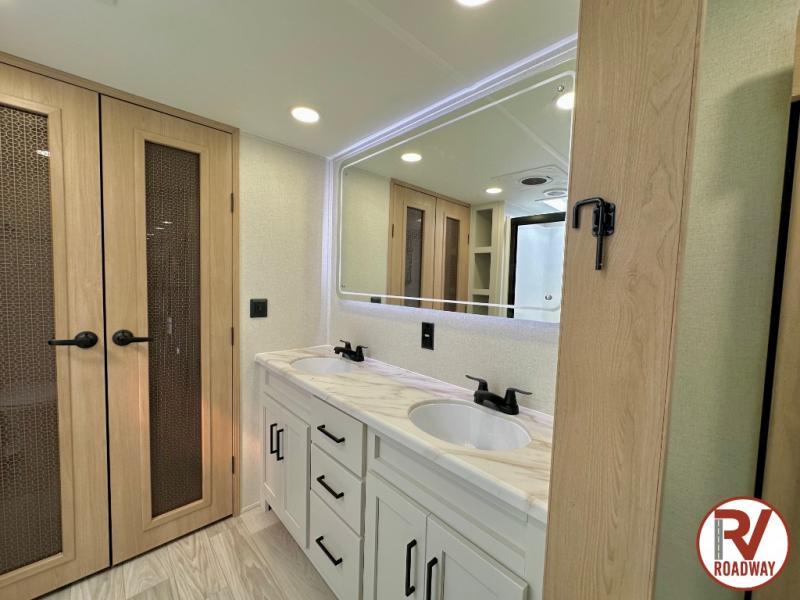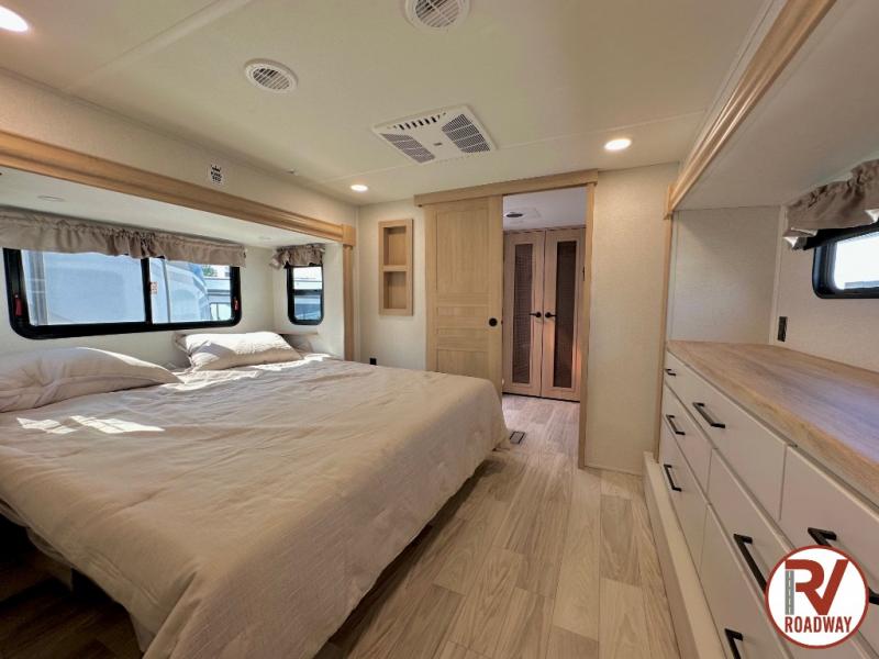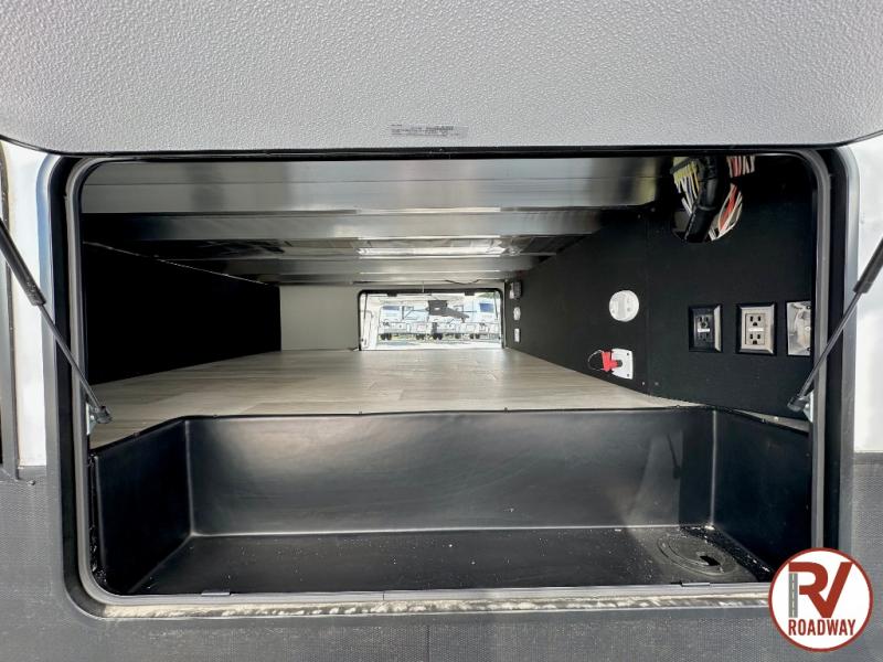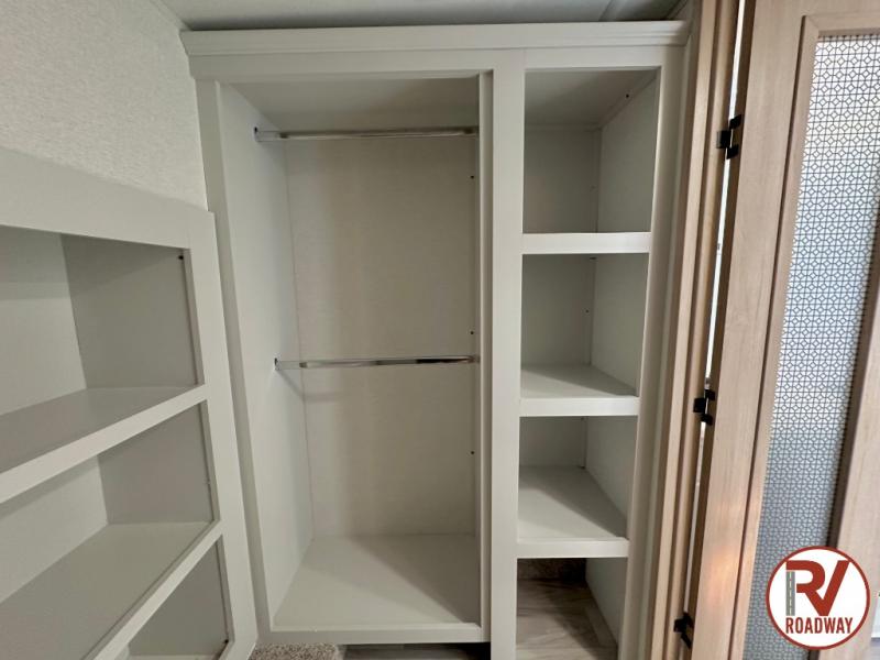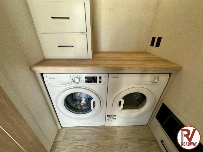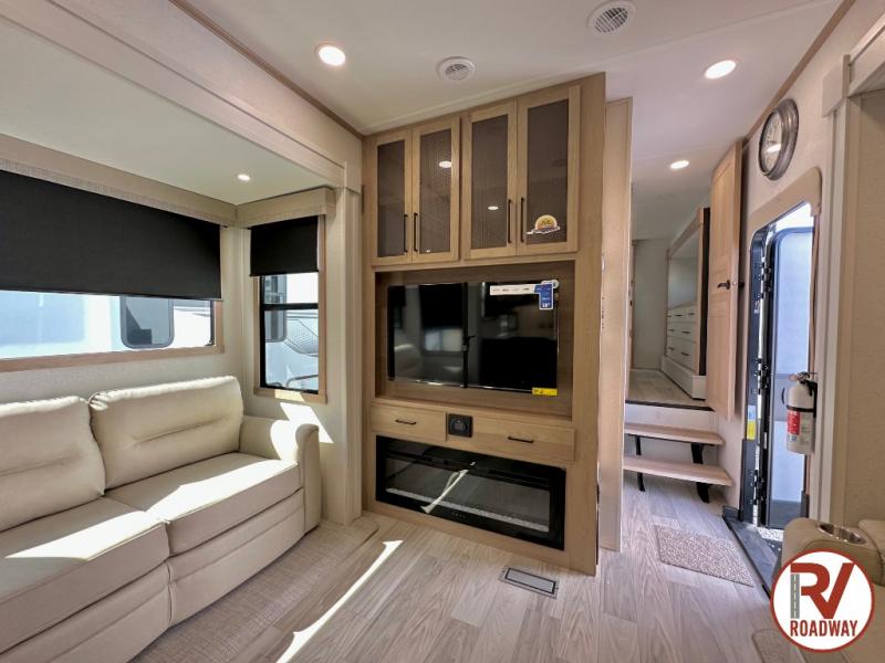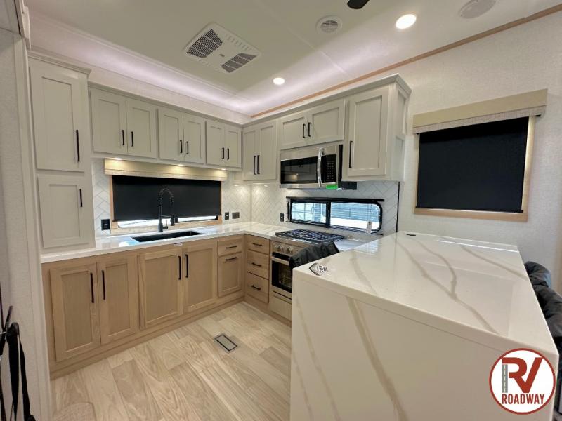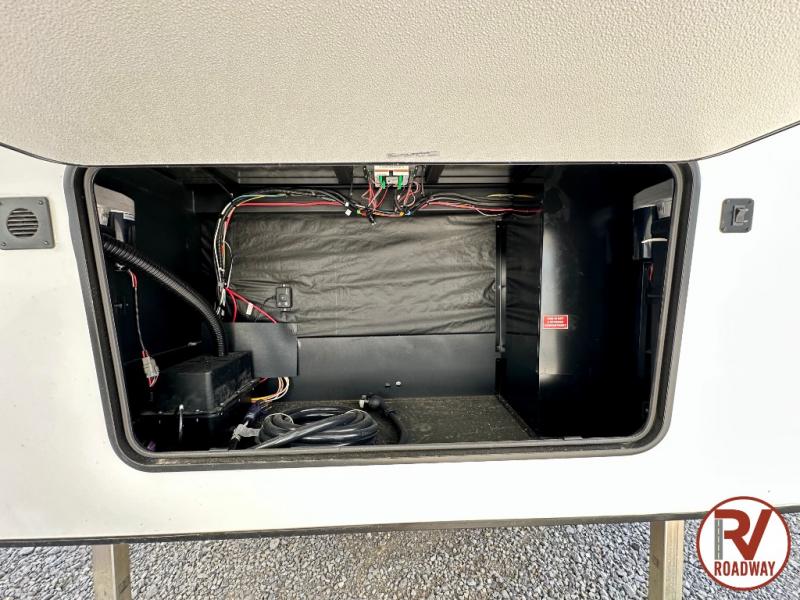 If you're looking to go full-time RVing, this fifth wheel is packed with convenient features! The master bedroom includes a king bed slide out with USB ports on either side of the bed so you both can charge your phones, and there is a dresser for your folded clothes. You will love the front bathroom with dual bath sinks, a shower with a seat, plus a walk-in closet with shelves! There is a unique middle utility room with washer and dryer prep and a counter that will make a perfect laundry room, or you can utilize this space for storage! Head to the main living area to relax on the theater seating or hide-a-bed sofa, and if you have guests stay over, they can sleep here. There is also an entertainment center with a 50" flat screen TV, but you might just leave that off if you're working at the desk with a chair that is provided. We've saved the best part for last; the kitchen! Here, you'll find ample counter space to prep home-cooked meals, a three burner range with a 24" oven, plus a large counter with barstools where you can enjoy breakfast at each morning. Choosing this fifth wheel is a no-brainer!