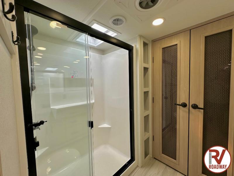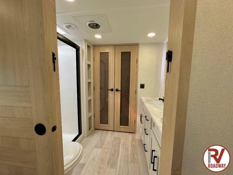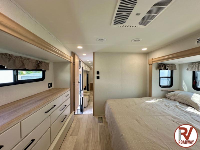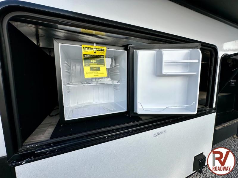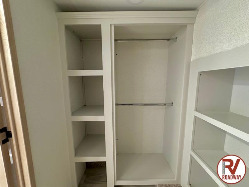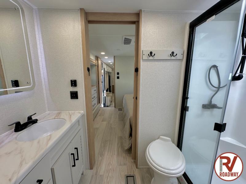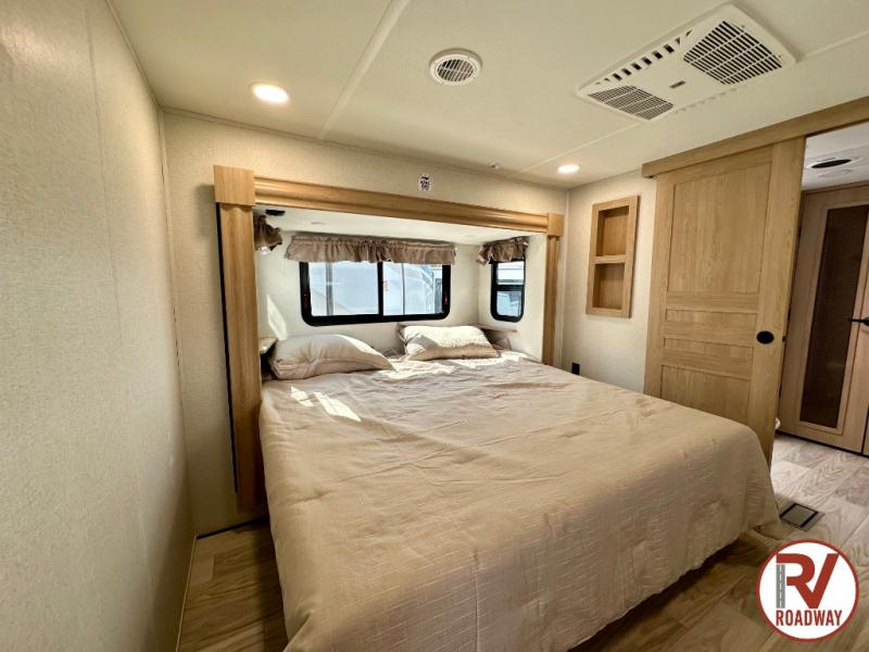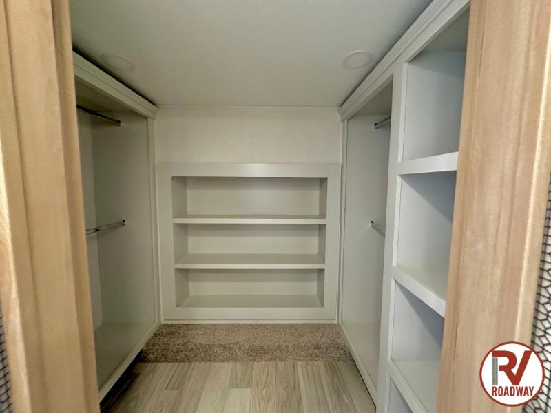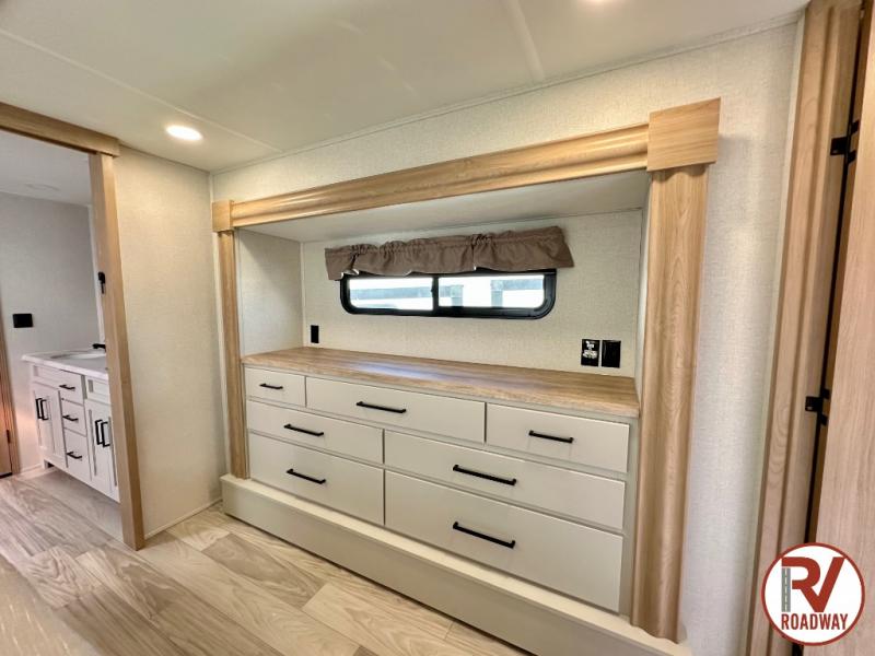 If you're looking to go full-time RVing, this fifth wheel is packed with convenient features! The master bedroom includes a king bed slide out with USB ports on either side of the bed so you both can charge your phones, and there is a dresser for your folded clothes. You will love the front bathroom with dual bath sinks, a shower with a seat, plus a walk-in closet with shelves! There is a unique middle utility room with washer and dryer prep and a counter that will make a perfect laundry room, or you can utilize this space for storage! Head to the main living area to relax on the theater seating or hide-a-bed sofa, and if you have guests stay over, they can sleep here. There is also an entertainment center with a 50" flat screen TV, but you might just leave that off if you're working at the desk with a chair that is provided. We've saved the best part for last; the kitchen! Here, you'll find ample counter space to prep home-cooked meals, a three burner range with a 24" oven, plus a large counter with barstools where you can enjoy breakfast at each morning. Choosing this fifth wheel is a no-brainer!
