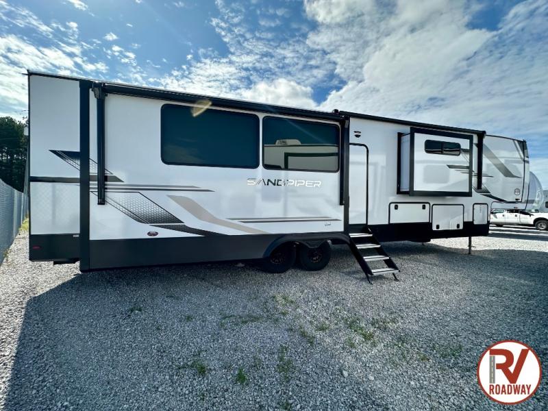 You will find the perfect balance of size, space, features, and luxury with any one of these Forest River Sandpiper fifth wheels! They are constructed with a welded aluminum framed vacuum bonded laminated superstructure, a cambered powder coated frame with rust prohibitor, and a fully enclosed underbelly for added protection against the elements. The large tinted windows come with a 80/20 UV prohibitor or you can choose the optional dual pane windows. Some hassle-free amenities include a 60k BTU on-demand water heater, full coach water filter system, tire pressure monitor system, and an electric leveling system! Inside, you'll enjoy stainless steel appliances, solid surface countertops, Beachside Sundance linoleum, recessed residential lighting, and many more comforts!