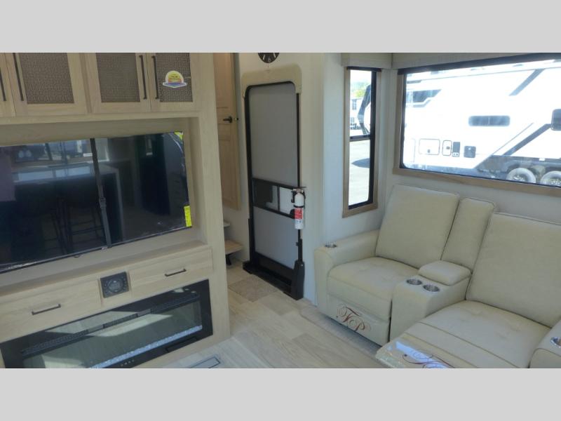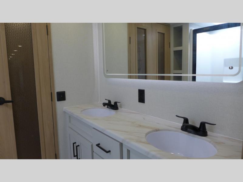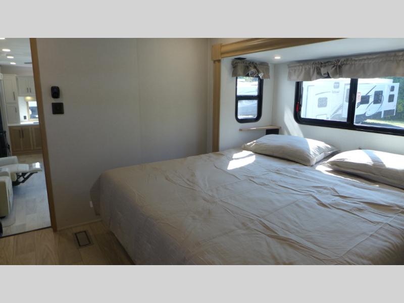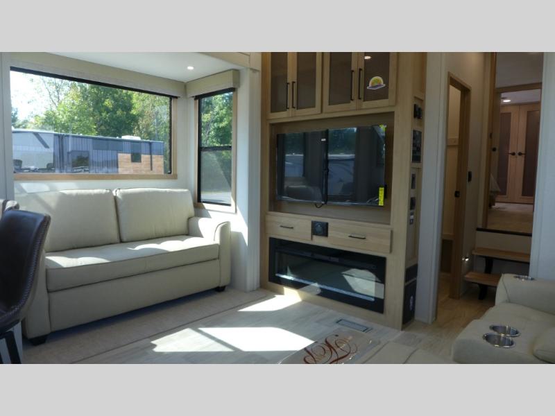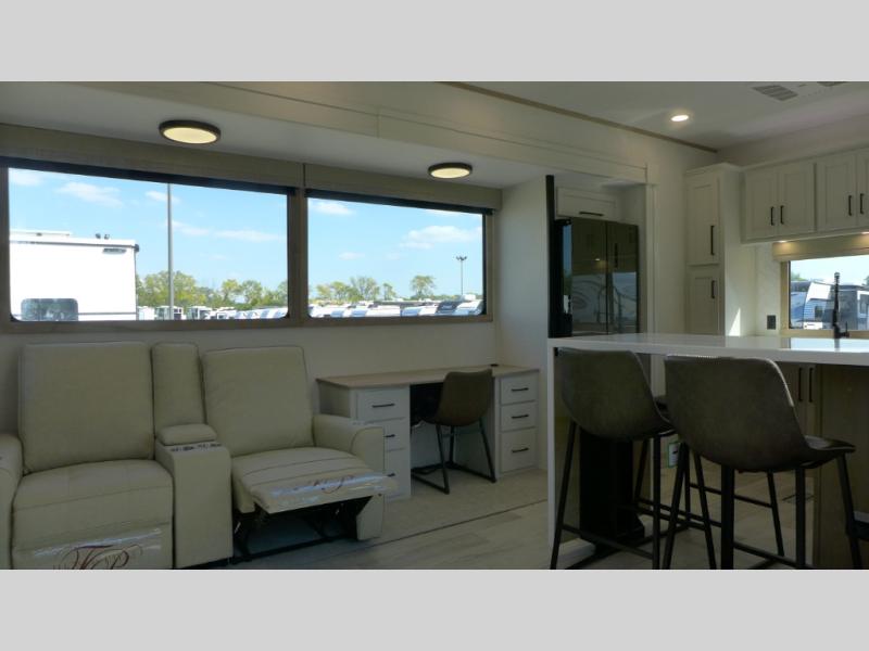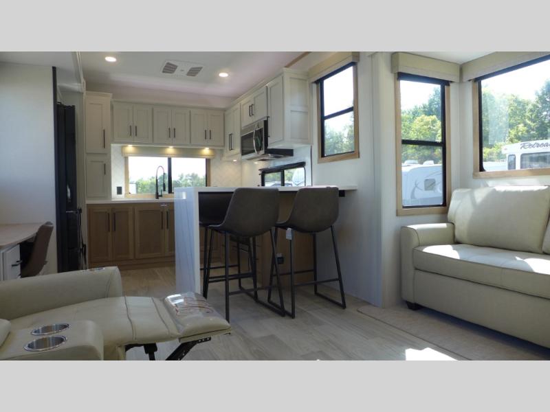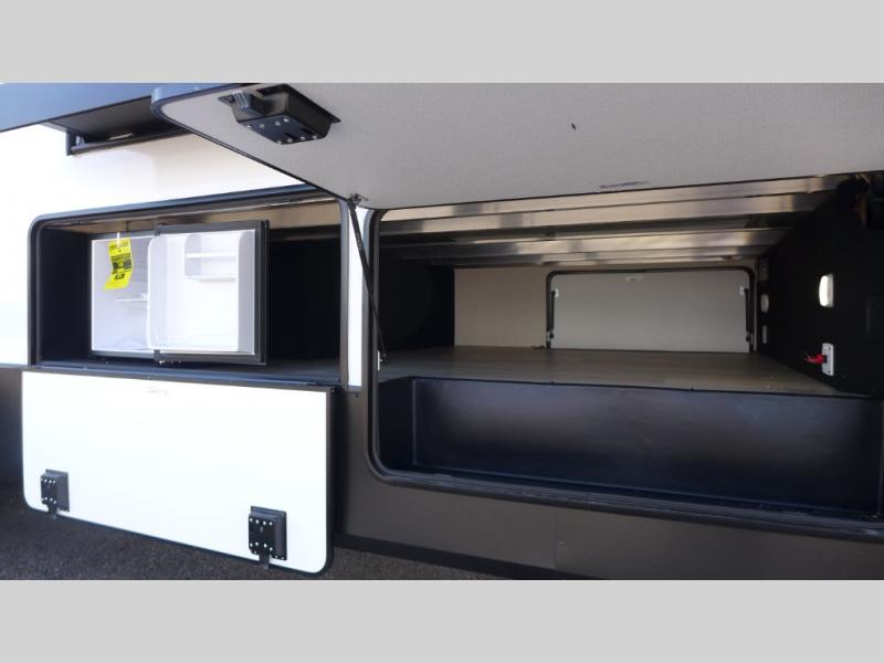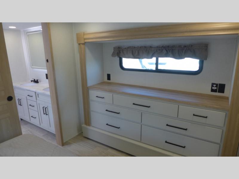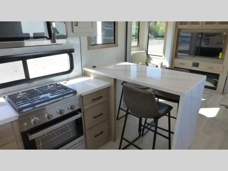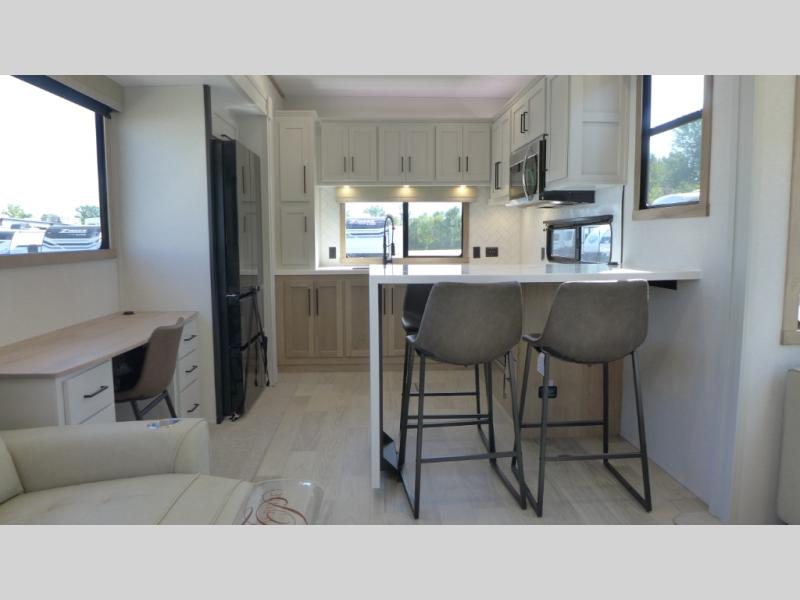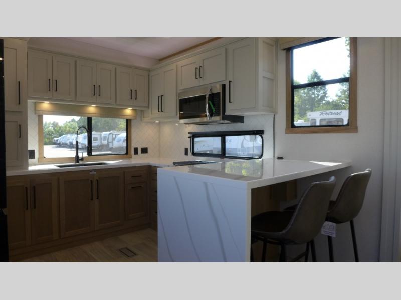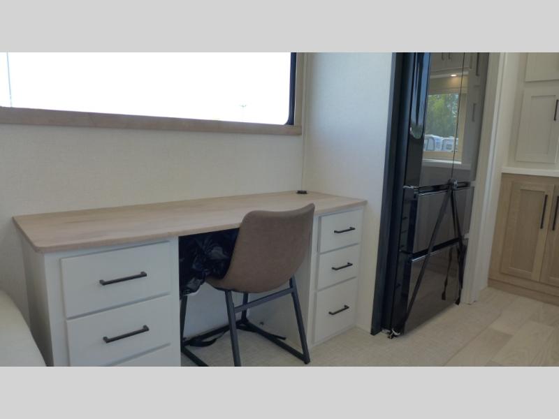If you're looking to go full-time RVing, this fifth wheel is packed with convenient features! The master bedroom includes a king bed slide out with USB ports on either side of the bed so you both can charge your phones, and there is a dresser for your folded clothes. You will love the front bathroom with dual bath sinks, a shower with a seat, plus a walk-in closet with shelves! There is a unique middle utility room with washer and dryer prep and a counter that will make a perfect laundry room, or you can utilize this space for storage! Head to the main living area to relax on the theater seating or hide-a-bed sofa, and if you have guests stay over, they can sleep here. There is also an entertainment center with a 50" flat screen TV, but you might just leave that off if you're working at the desk with a chair that is provided. We've saved the best part for last; the kitchen! Here, you'll find ample counter space to prep home-cooked meals, a three burner range with a 24" oven, plus a large counter with barstools where you can enjoy breakfast at each morning. Choosing this fifth wheel is a no-brainer!