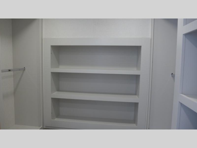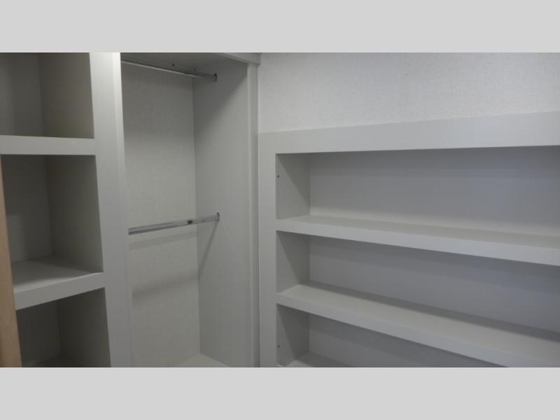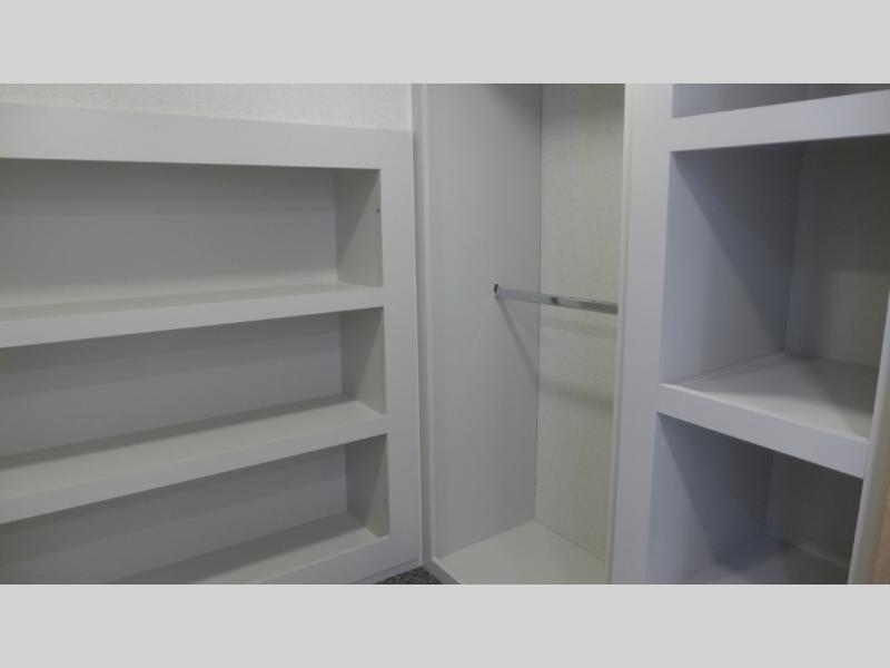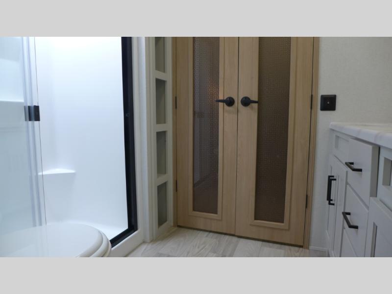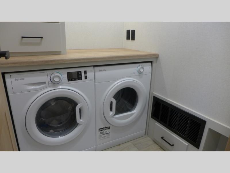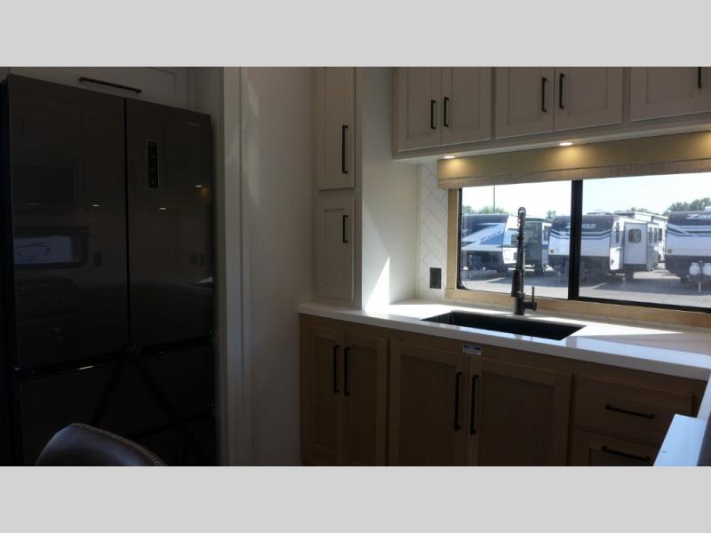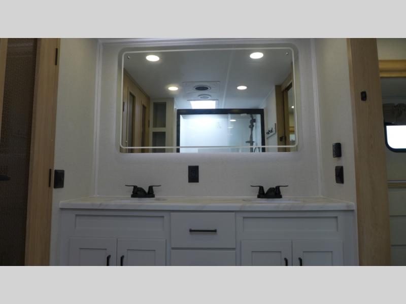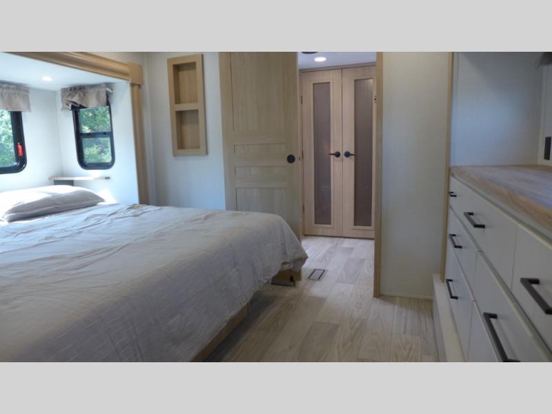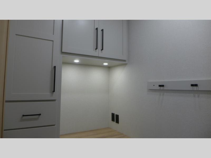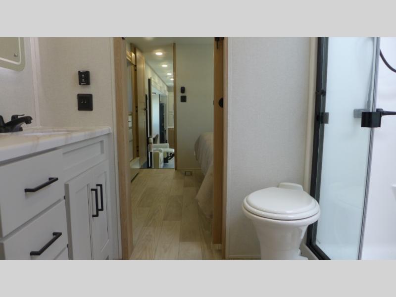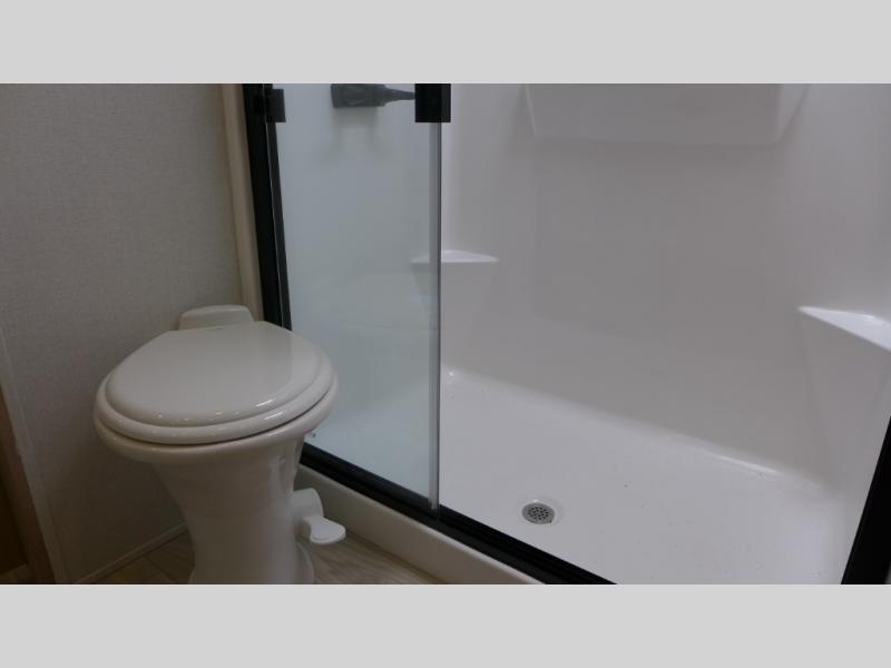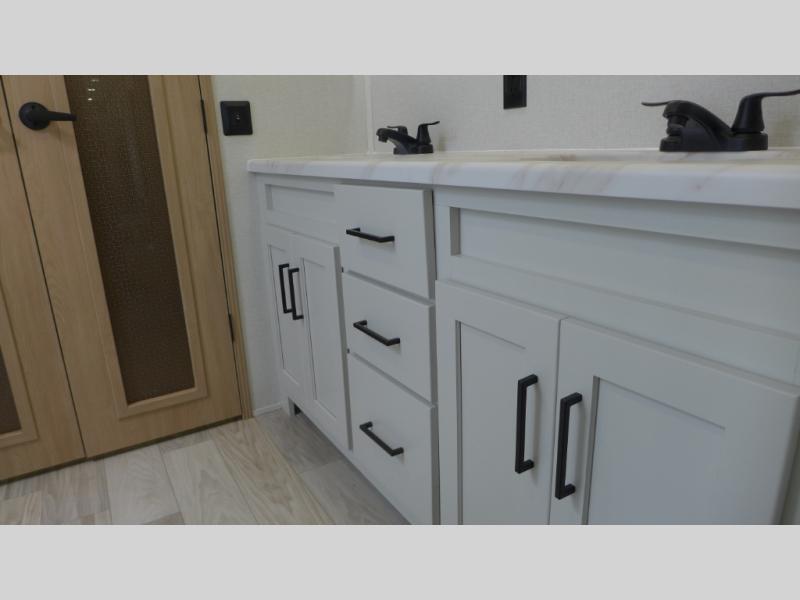 If you're looking to go full-time RVing, this fifth wheel is packed with convenient features! The master bedroom includes a king bed slide out with USB ports on either side of the bed so you both can charge your phones, and there is a dresser for your folded clothes. You will love the front bathroom with dual bath sinks, a shower with a seat, plus a walk-in closet with shelves! There is a unique middle utility room with washer and dryer prep and a counter that will make a perfect laundry room, or you can utilize this space for storage! Head to the main living area to relax on the theater seating or hide-a-bed sofa, and if you have guests stay over, they can sleep here. There is also an entertainment center with a 50" flat screen TV, but you might just leave that off if you're working at the desk with a chair that is provided. We've saved the best part for last; the kitchen! Here, you'll find ample counter space to prep home-cooked meals, a three burner range with a 24" oven, plus a large counter with barstools where you can enjoy breakfast at each morning. Choosing this fifth wheel is a no-brainer!
