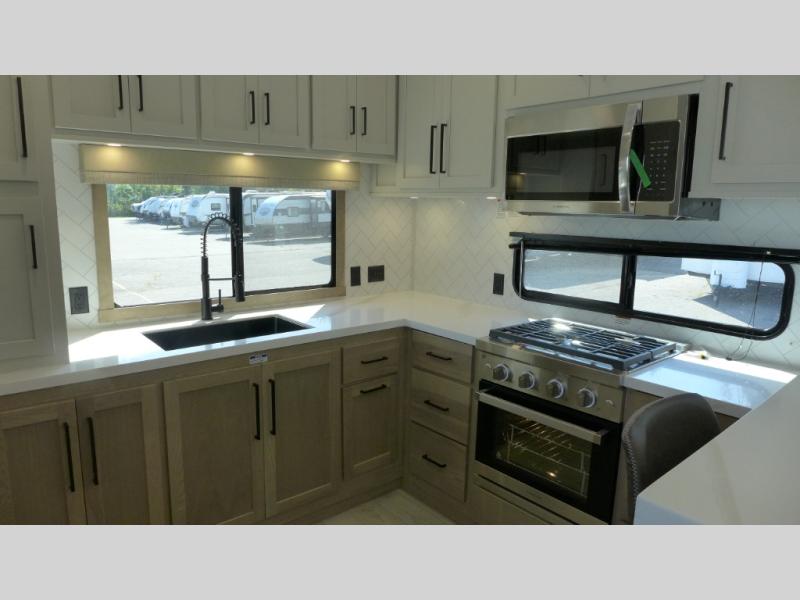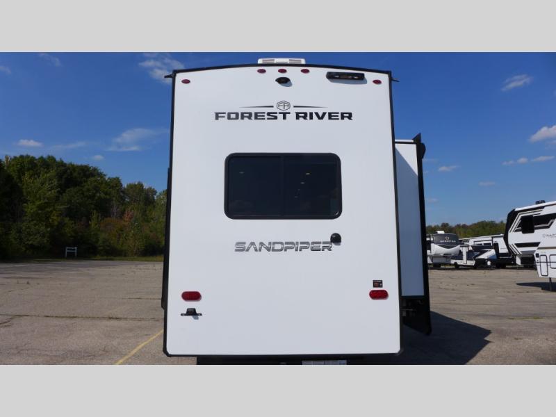 You will find the perfect balance of size, space, features, and luxury with any one of these Forest River Sandpiper fifth wheels! They are constructed with a welded aluminum framed vacuum bonded laminated superstructure, a cambered powder coated frame with rust prohibitor, and a fully enclosed underbelly for added protection against the elements. The large tinted windows come with a 80/20 UV prohibitor or you can choose the optional dual pane windows. Some hassle-free amenities include a 60k BTU on-demand water heater, full coach water filter system, tire pressure monitor system, and an electric leveling system! Inside, you'll enjoy stainless steel appliances, solid surface countertops, Beachside Sundance linoleum, recessed residential lighting, and many more comforts!