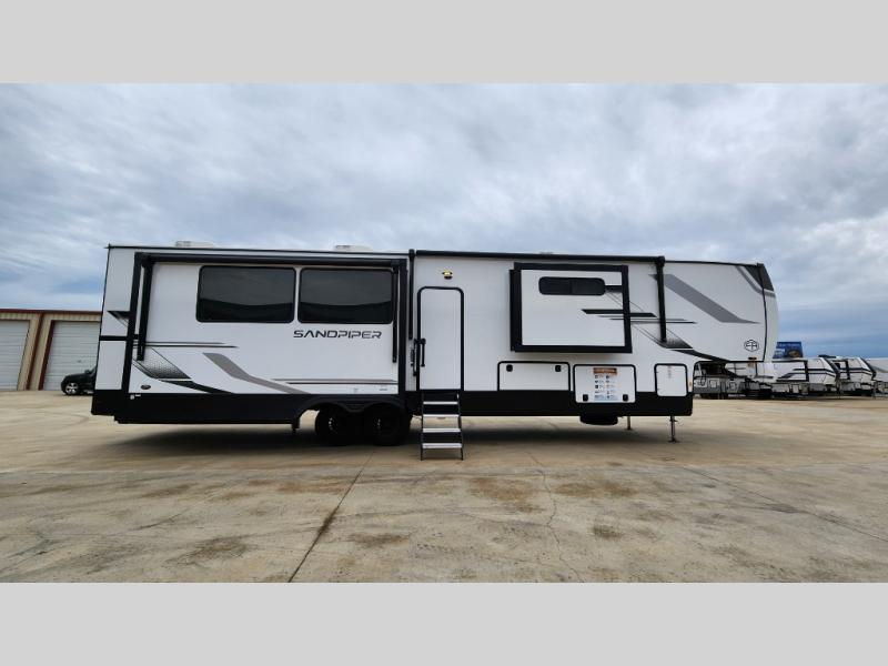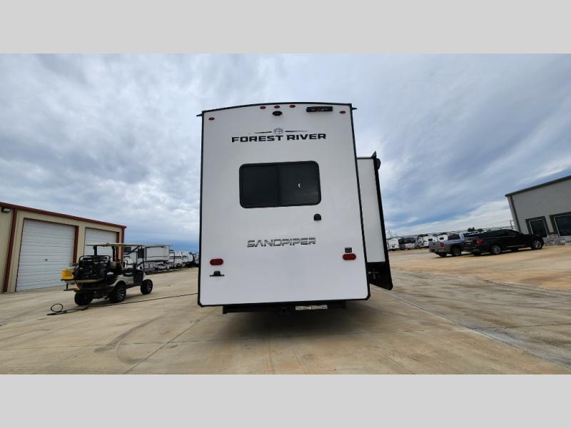 You will find the perfect balance of size, space, features, and luxury with any one of these Forest River Sandpiper fifth wheels! They are constructed with a welded aluminum framed vacuum bonded laminated superstructure, a cambered powder coated frame with rust prohibitor, and a fully enclosed underbelly for added protection against the elements. The large tinted windows come with a 80/20 UV prohibitor or you can choose the optional dual pane windows. Some hassle-free amenities include a 60k BTU on-demand water heater, full coach water filter system, tire pressure monitor system, and an electric leveling system! Inside, you'll enjoy stainless steel appliances, solid surface countertops, Beachside Sundance linoleum, recessed residential lighting, and many more comforts!