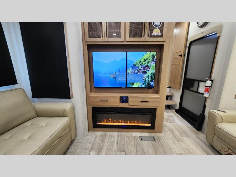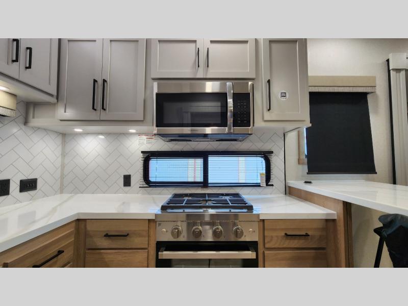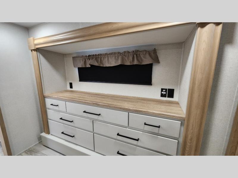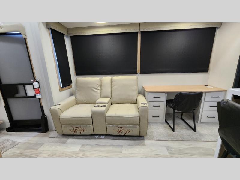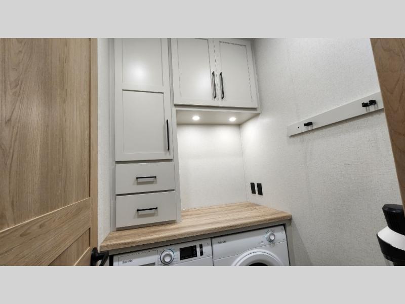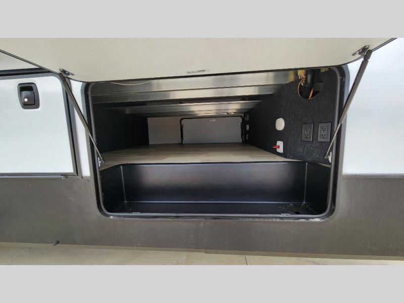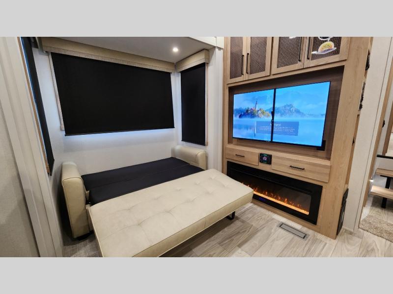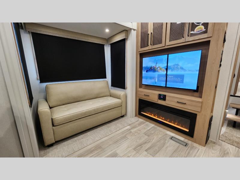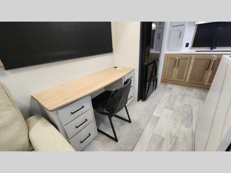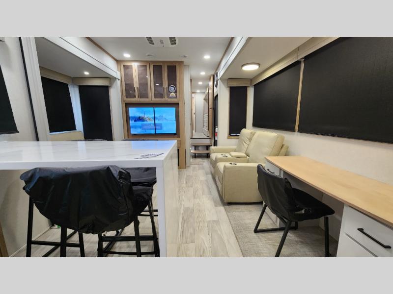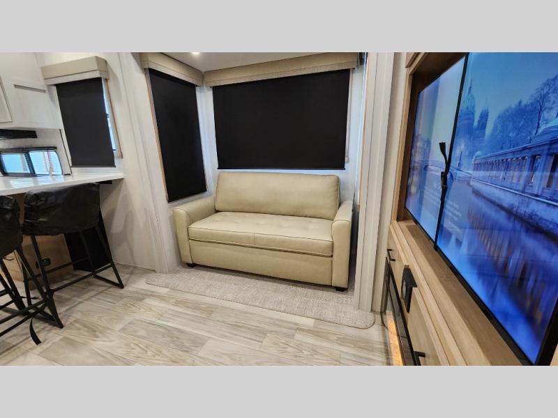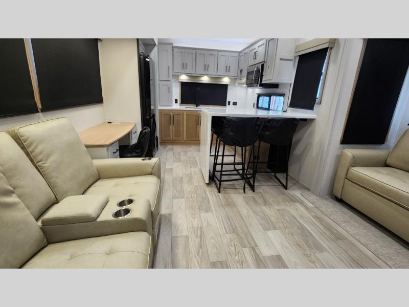 If you're looking to go full-time RVing, this fifth wheel is packed with convenient features! The master bedroom includes a king bed slide out with USB ports on either side of the bed so you both can charge your phones, and there is a dresser for your folded clothes. You will love the front bathroom with dual bath sinks, a shower with a seat, plus a walk-in closet with shelves! There is a unique middle utility room with washer and dryer prep and a counter that will make a perfect laundry room, or you can utilize this space for storage! Head to the main living area to relax on the theater seating or hide-a-bed sofa, and if you have guests stay over, they can sleep here. There is also an entertainment center with a 50" flat screen TV, but you might just leave that off if you're working at the desk with a chair that is provided. We've saved the best part for last; the kitchen! Here, you'll find ample counter space to prep home-cooked meals, a three burner range with a 24" oven, plus a large counter with barstools where you can enjoy breakfast at each morning. Choosing this fifth wheel is a no-brainer!
