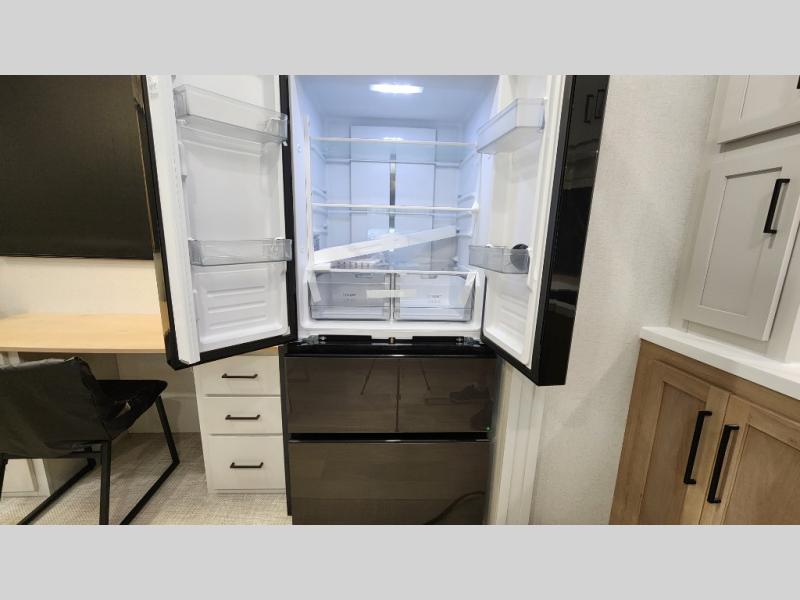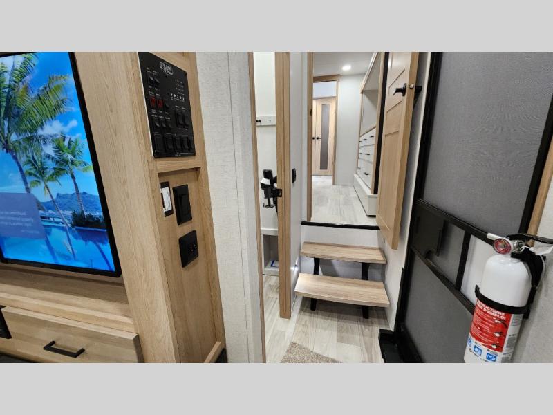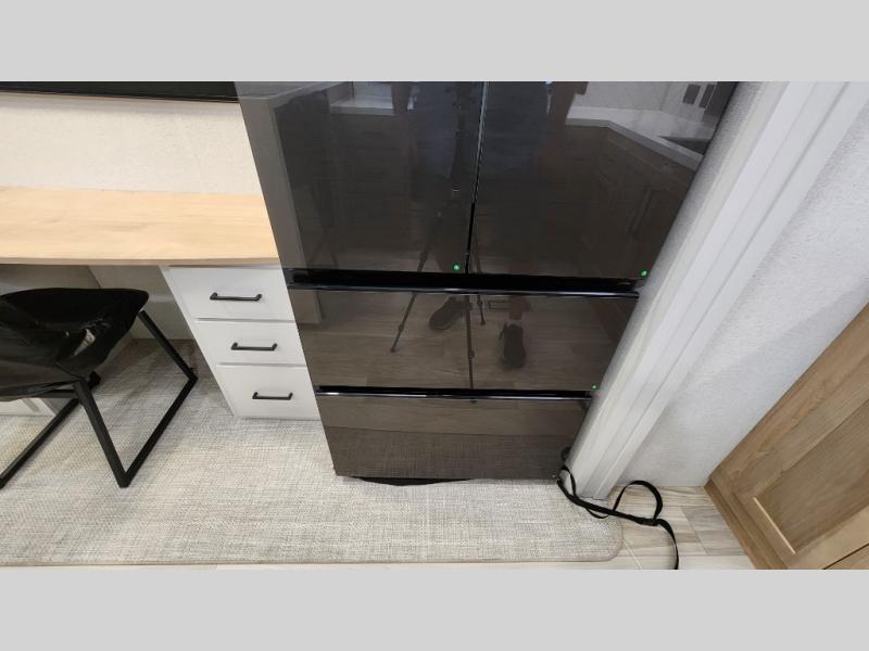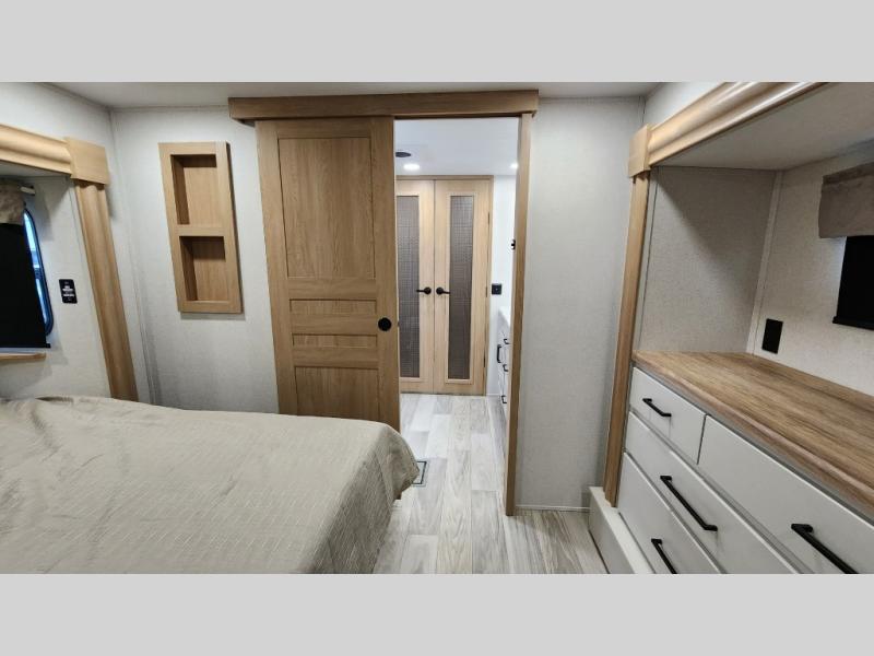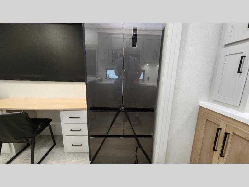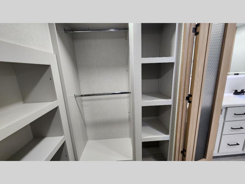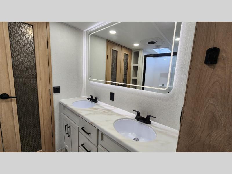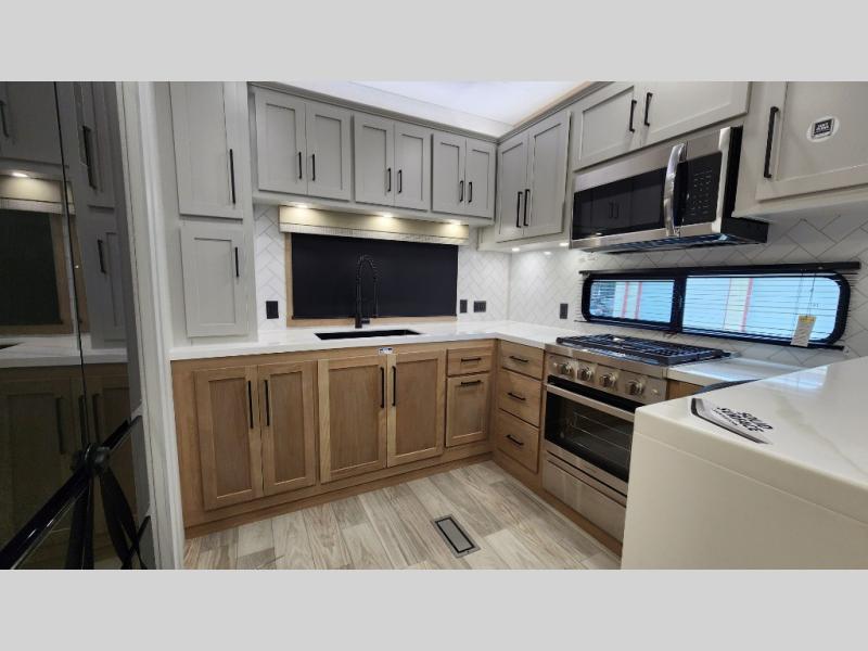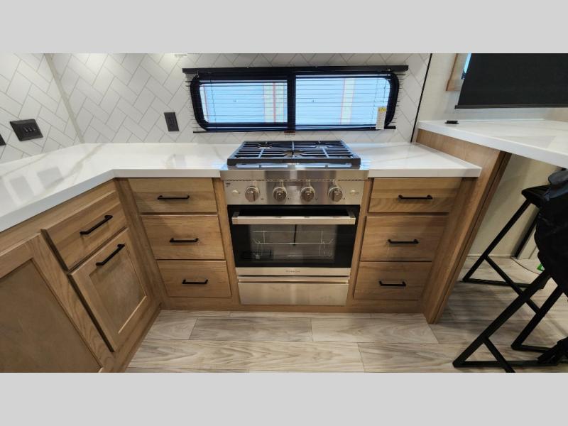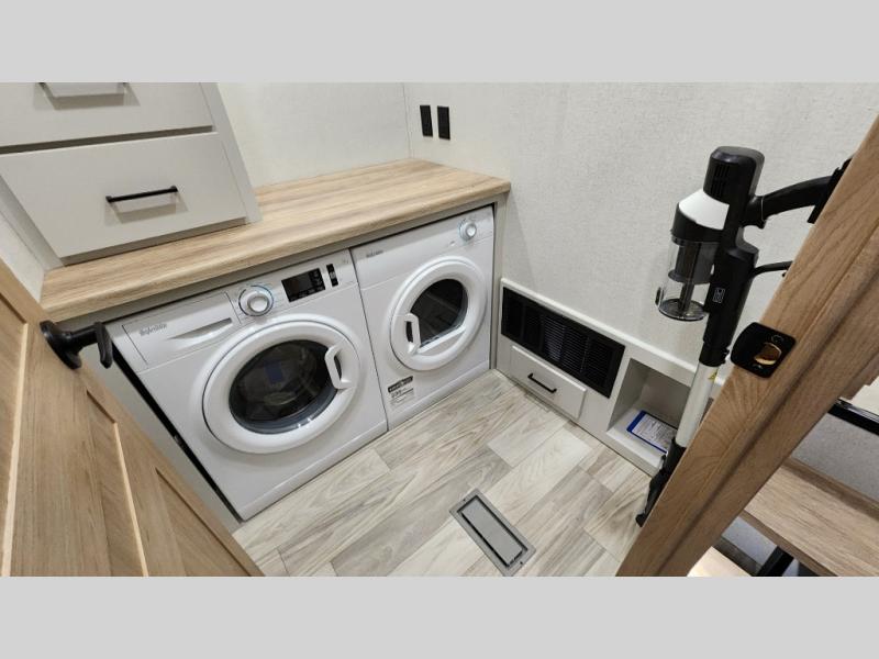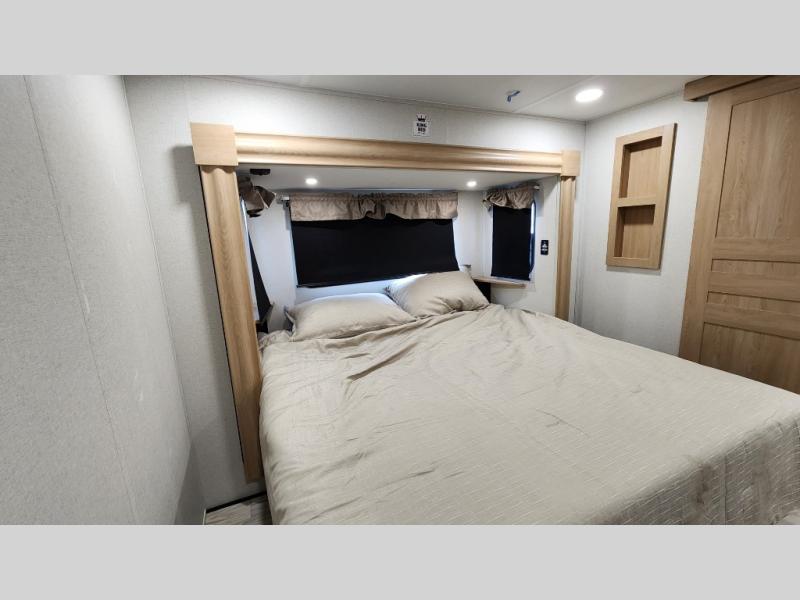If you're looking to go full-time RVing, this fifth wheel is packed with convenient features! The master bedroom includes a king bed slide out with USB ports on either side of the bed so you both can charge your phones, and there is a dresser for your folded clothes. You will love the front bathroom with dual bath sinks, a shower with a seat, plus a walk-in closet with shelves! There is a unique middle utility room with washer and dryer prep and a counter that will make a perfect laundry room, or you can utilize this space for storage! Head to the main living area to relax on the theater seating or hide-a-bed sofa, and if you have guests stay over, they can sleep here. There is also an entertainment center with a 50" flat screen TV, but you might just leave that off if you're working at the desk with a chair that is provided. We've saved the best part for last; the kitchen! Here, you'll find ample counter space to prep home-cooked meals, a three burner range with a 24" oven, plus a large counter with barstools where you can enjoy breakfast at each morning. Choosing this fifth wheel is a no-brainer!