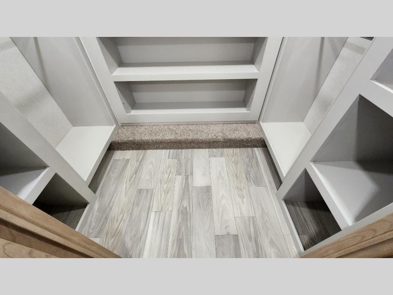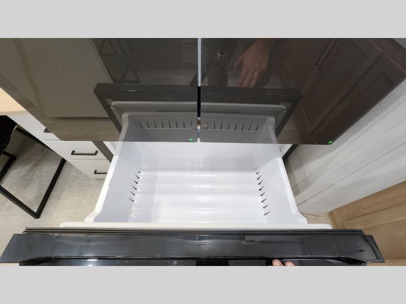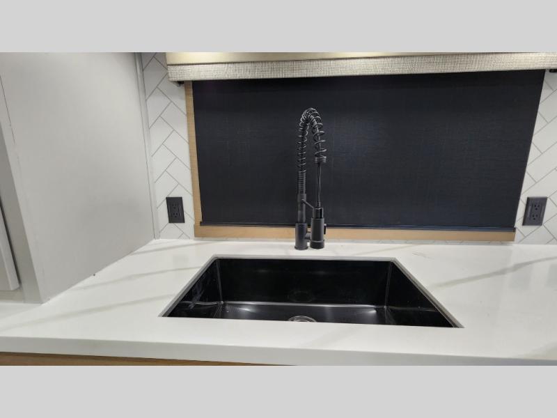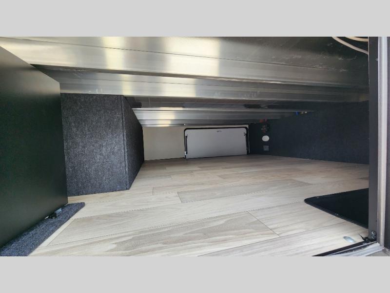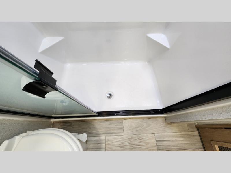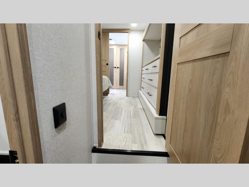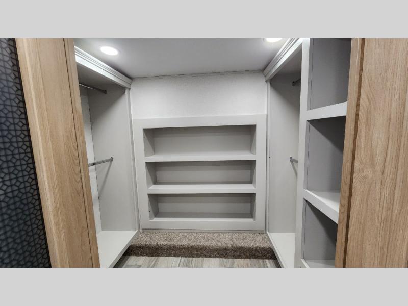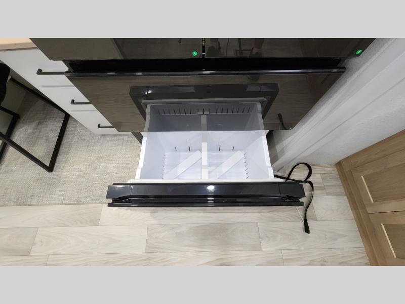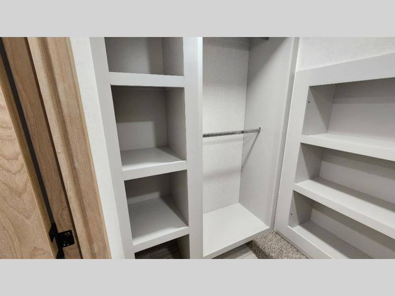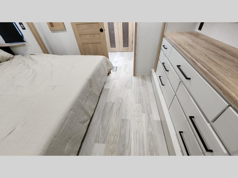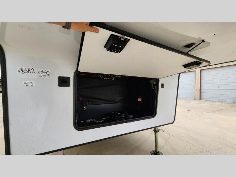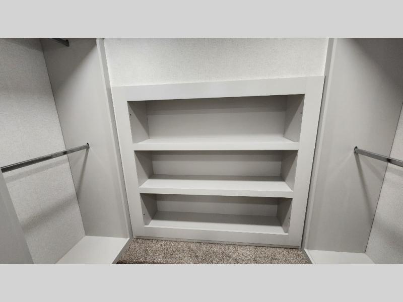 If you're looking to go full-time RVing, this fifth wheel is packed with convenient features! The master bedroom includes a king bed slide out with USB ports on either side of the bed so you both can charge your phones, and there is a dresser for your folded clothes. You will love the front bathroom with dual bath sinks, a shower with a seat, plus a walk-in closet with shelves! There is a unique middle utility room with washer and dryer prep and a counter that will make a perfect laundry room, or you can utilize this space for storage! Head to the main living area to relax on the theater seating or hide-a-bed sofa, and if you have guests stay over, they can sleep here. There is also an entertainment center with a 50" flat screen TV, but you might just leave that off if you're working at the desk with a chair that is provided. We've saved the best part for last; the kitchen! Here, you'll find ample counter space to prep home-cooked meals, a three burner range with a 24" oven, plus a large counter with barstools where you can enjoy breakfast at each morning. Choosing this fifth wheel is a no-brainer!