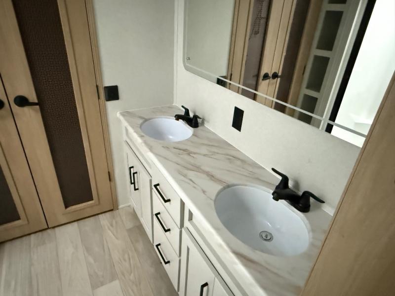 If you're looking to go full-time RVing, this fifth wheel is packed with convenient features! The master bedroom includes a king bed slide out with USB ports on either side of the bed so you both can charge your phones, and there is a dresser for your folded clothes. You will love the front bathroom with dual bath sinks, a shower with a seat, plus a walk-in closet with shelves! There is a unique middle utility room with washer and dryer prep and a counter that will make a perfect laundry room, or you can utilize this space for storage! Head to the main living area to relax on the theater seating or hide-a-bed sofa, and if you have guests stay over, they can sleep here. There is also an entertainment center with a 50" flat screen TV, but you might just leave that off if you're working at the desk with a chair that is provided. We've saved the best part for last; the kitchen! Here, you'll find ample counter space to prep home-cooked meals, a three burner range with a 24" oven, plus a large counter with barstools where you can enjoy breakfast at each morning. Choosing this fifth wheel is a no-brainer!
