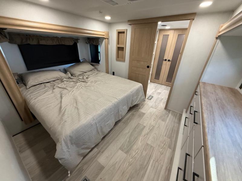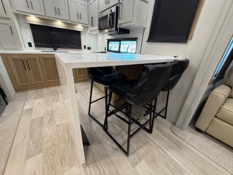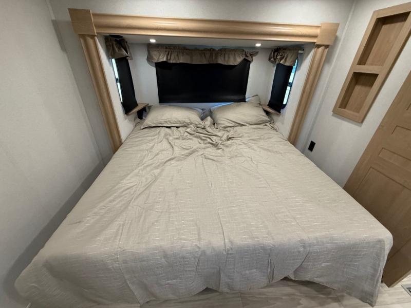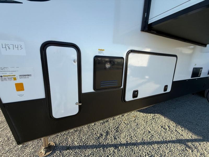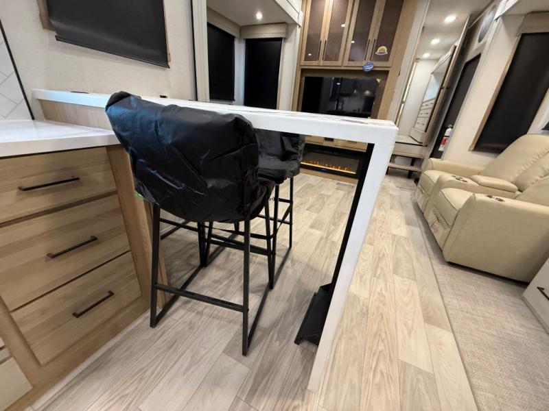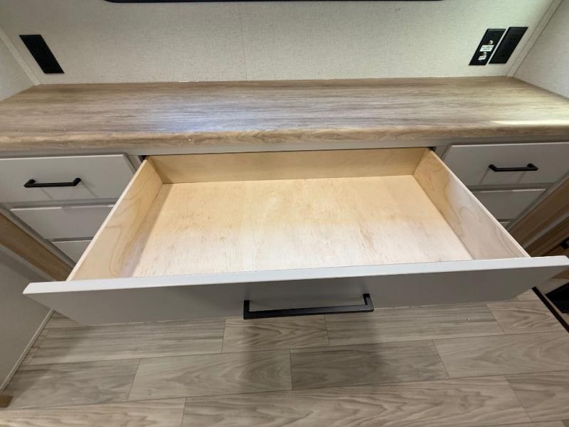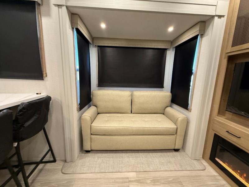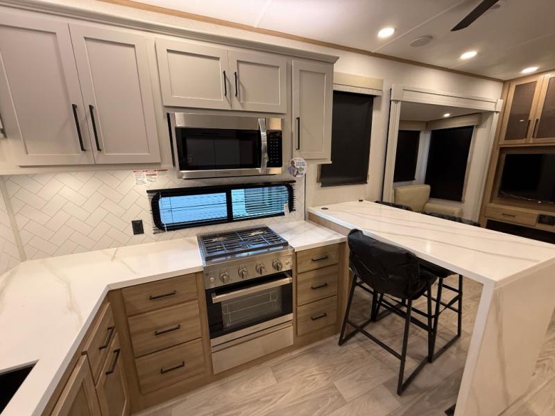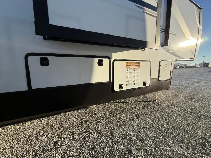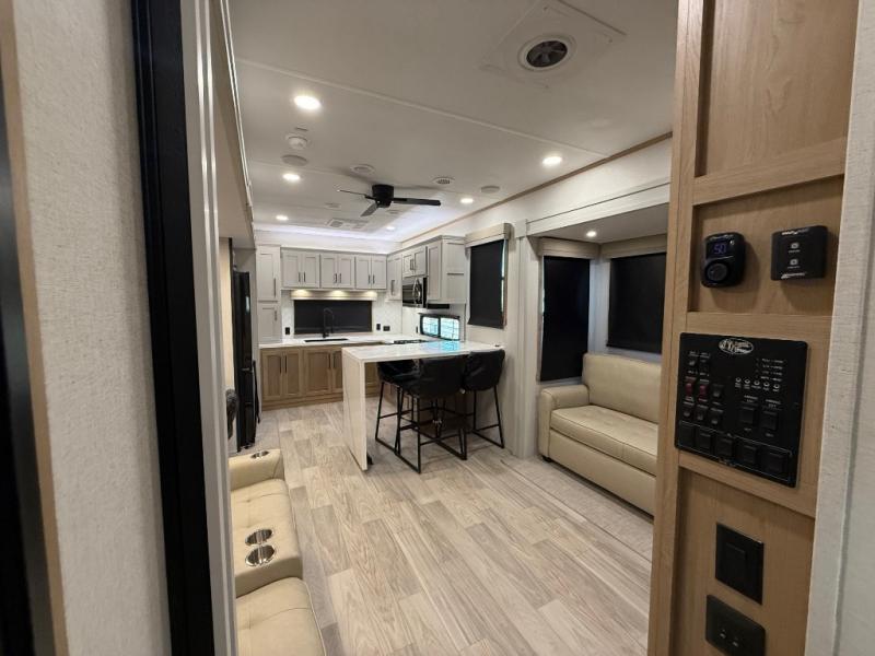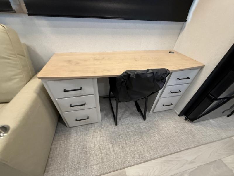 This fifth wheel is packed with convenient features to make your travels more comfortable and enjoyable! The master bedroom includes a king bed slide out with USB ports on either side of the bed so you both can charge your phones, and there is a dresser for your folded clothes. You will love the front bathroom with dual bath sinks, a fiberglass one-piece shower, plus a walk-in closet with shelves and rods to hang clothes! There is a unique middle utility room with washer and dryer prep if you want to add these, a Washer and dryer counter and a rod to hang clothes that will make a perfect laundry room, or you can utilize this space for storage! Head to the main living area to relax on the theater seating or hide-a-bed sofa, and if you have guests stay over, they can sleep here. There is also an entertainment center with a 50" flat screen TV, but you might just leave that off if you're working at the desk with a chair that is provided. We've saved the best part for last, the kitchen! Here, you'll find ample counter space to prep home-cooked meals, a three-burner range with a 24" oven, plus a large counter with barstools where you can enjoy breakfast at each morning. Choosing this fifth wheel is a no-brainer!