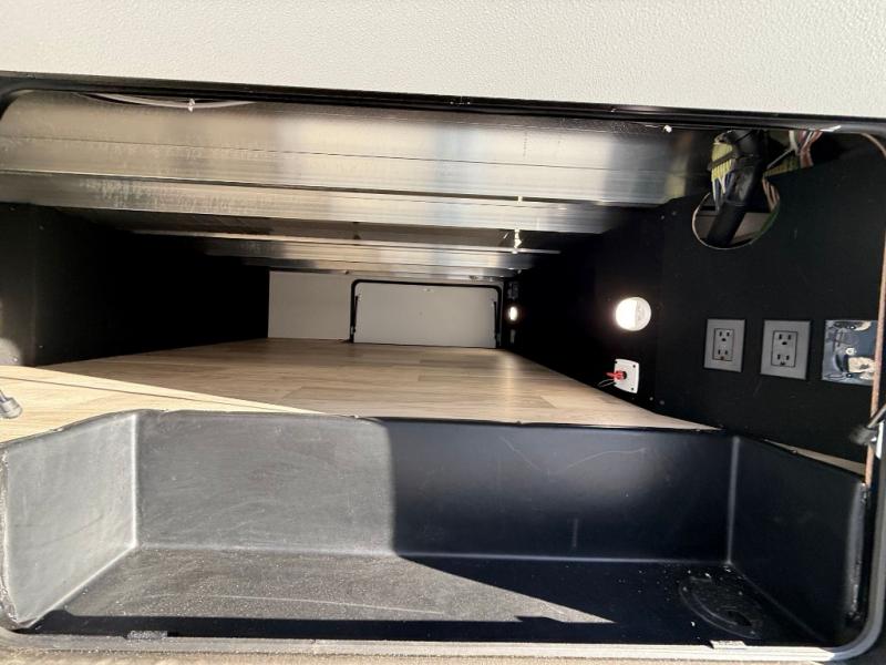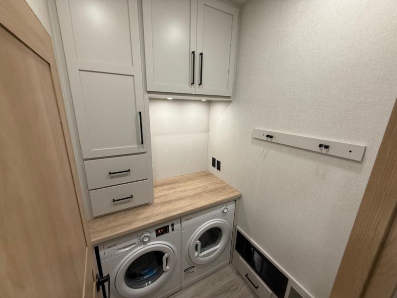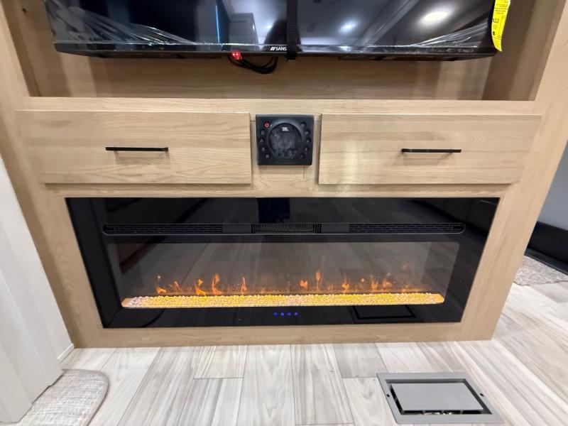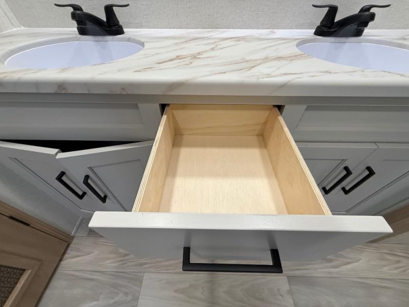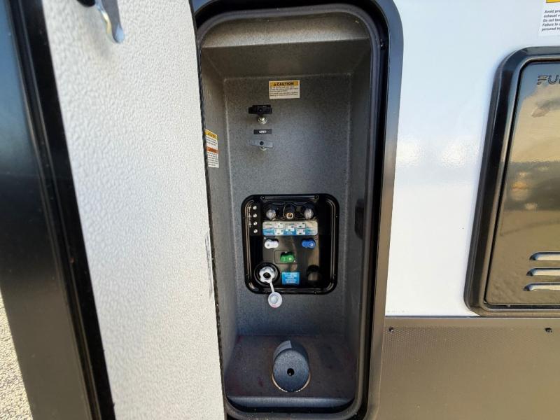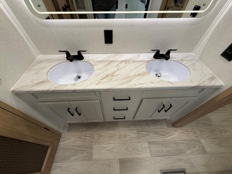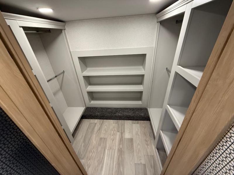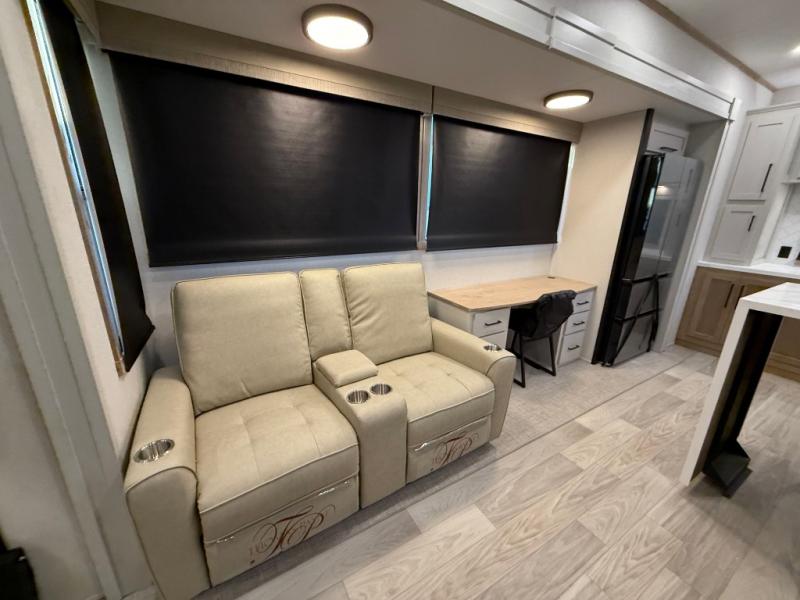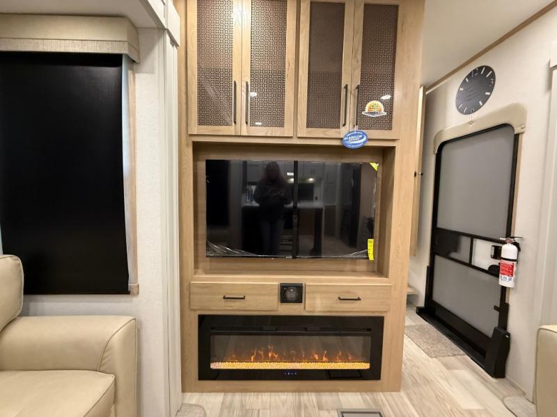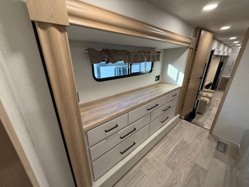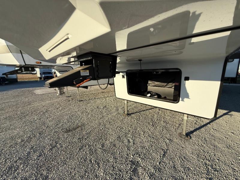 This fifth wheel is packed with convenient features to make your travels more comfortable and enjoyable! The master bedroom includes a king bed slide out with USB ports on either side of the bed so you both can charge your phones, and there is a dresser for your folded clothes. You will love the front bathroom with dual bath sinks, a fiberglass one-piece shower, plus a walk-in closet with shelves and rods to hang clothes! There is a unique middle utility room with washer and dryer prep if you want to add these, a Washer and dryer counter and a rod to hang clothes that will make a perfect laundry room, or you can utilize this space for storage! Head to the main living area to relax on the theater seating or hide-a-bed sofa, and if you have guests stay over, they can sleep here. There is also an entertainment center with a 50" flat screen TV, but you might just leave that off if you're working at the desk with a chair that is provided. We've saved the best part for last, the kitchen! Here, you'll find ample counter space to prep home-cooked meals, a three-burner range with a 24" oven, plus a large counter with barstools where you can enjoy breakfast at each morning. Choosing this fifth wheel is a no-brainer!