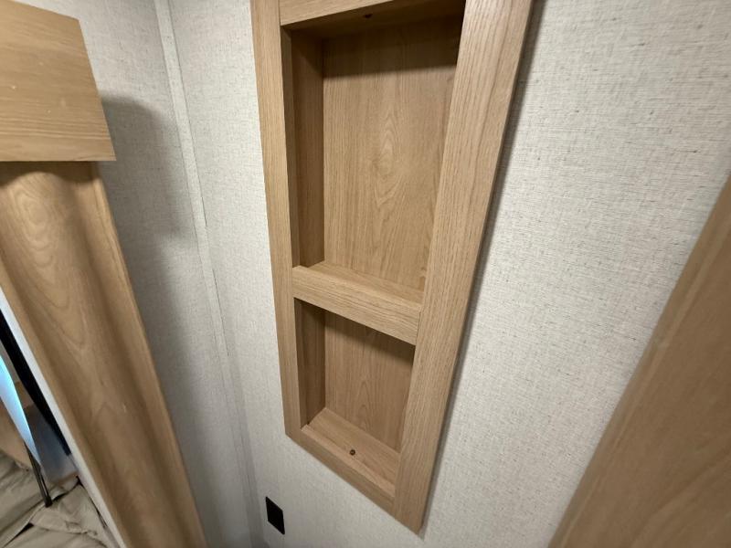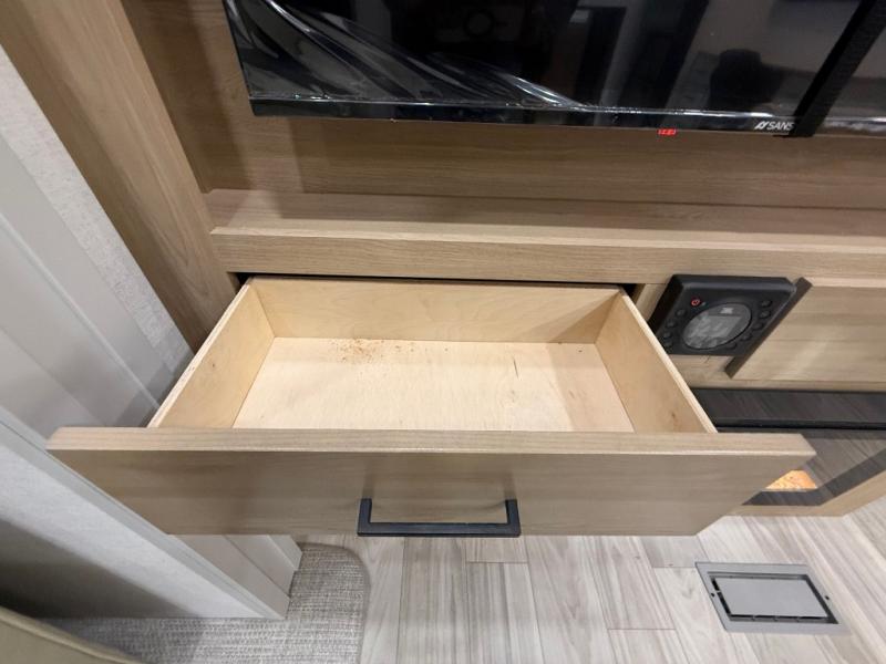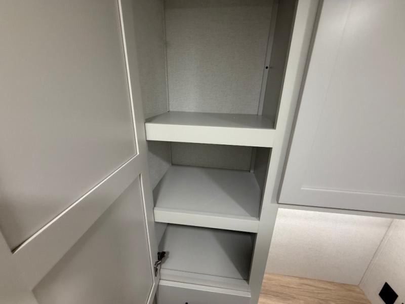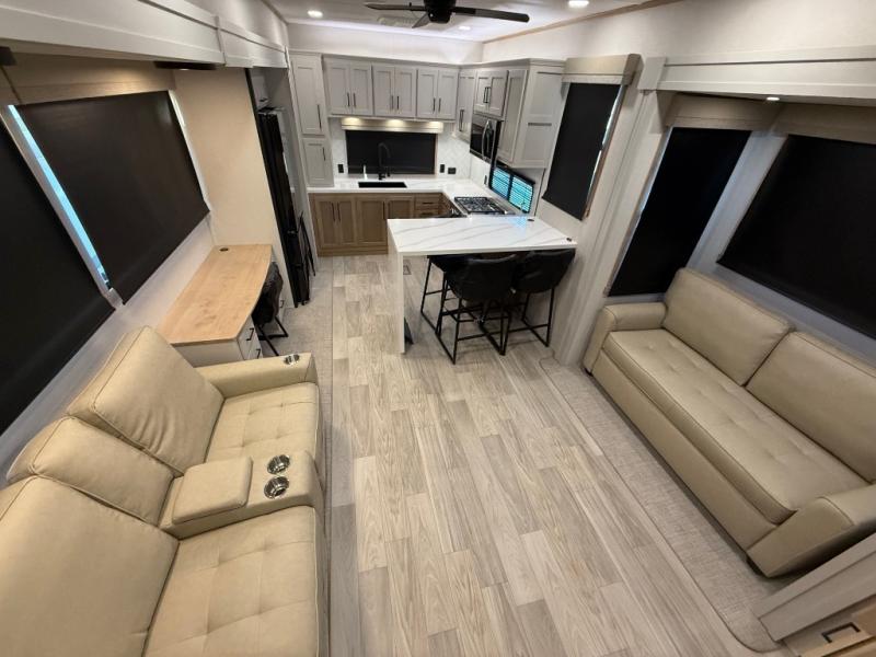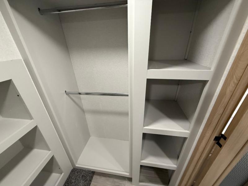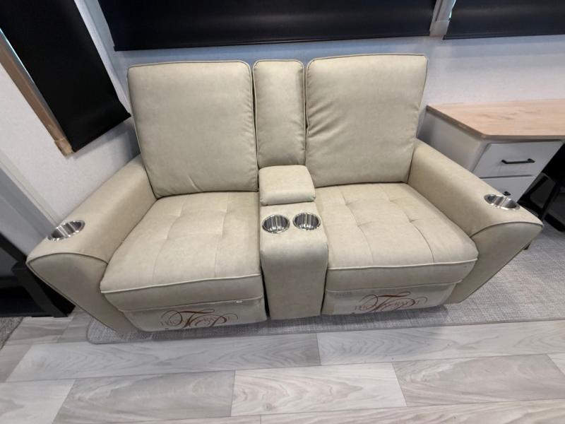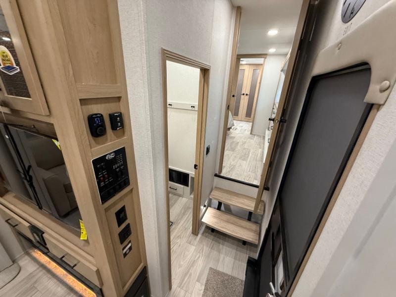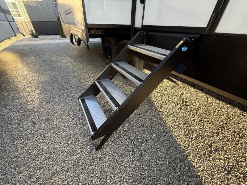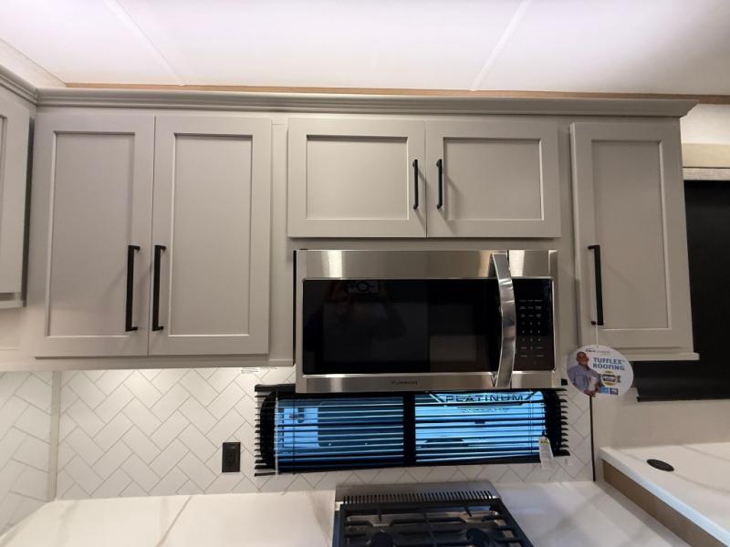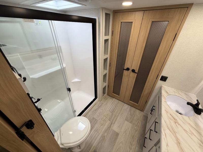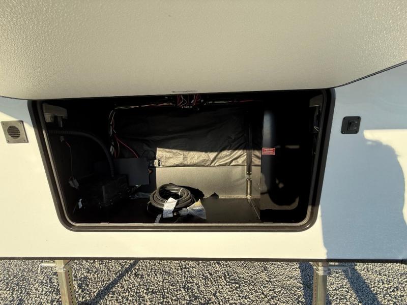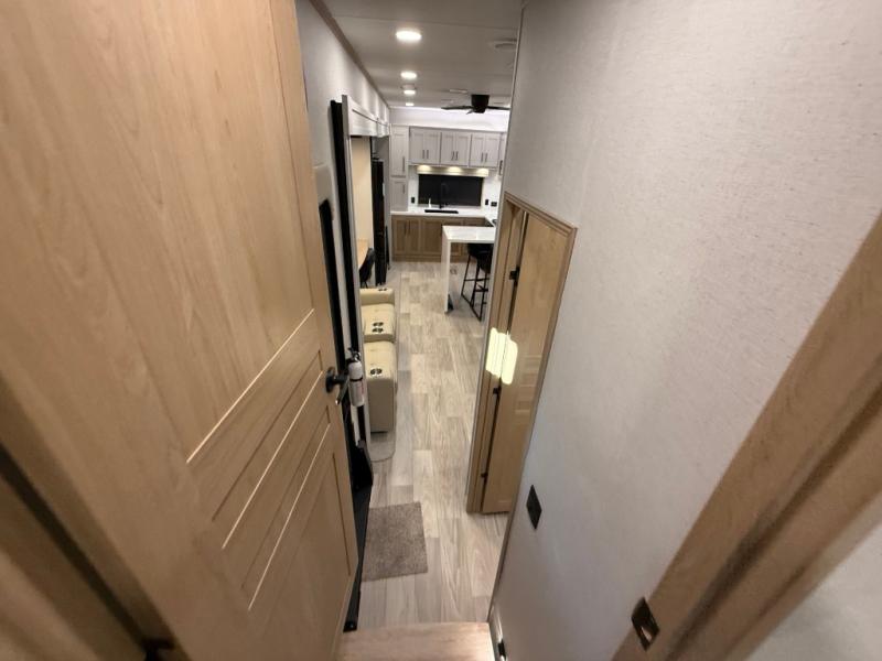 This fifth wheel is packed with convenient features to make your travels more comfortable and enjoyable! The master bedroom includes a king bed slide out with USB ports on either side of the bed so you both can charge your phones, and there is a dresser for your folded clothes. You will love the front bathroom with dual bath sinks, a fiberglass one-piece shower, plus a walk-in closet with shelves and rods to hang clothes! There is a unique middle utility room with washer and dryer prep if you want to add these, a Washer and dryer counter and a rod to hang clothes that will make a perfect laundry room, or you can utilize this space for storage! Head to the main living area to relax on the theater seating or hide-a-bed sofa, and if you have guests stay over, they can sleep here. There is also an entertainment center with a 50" flat screen TV, but you might just leave that off if you're working at the desk with a chair that is provided. We've saved the best part for last, the kitchen! Here, you'll find ample counter space to prep home-cooked meals, a three-burner range with a 24" oven, plus a large counter with barstools where you can enjoy breakfast at each morning. Choosing this fifth wheel is a no-brainer!