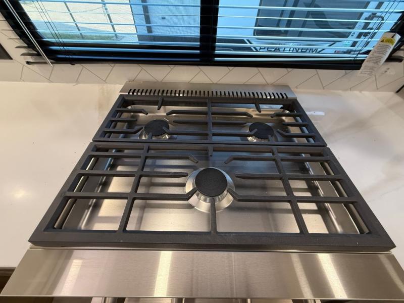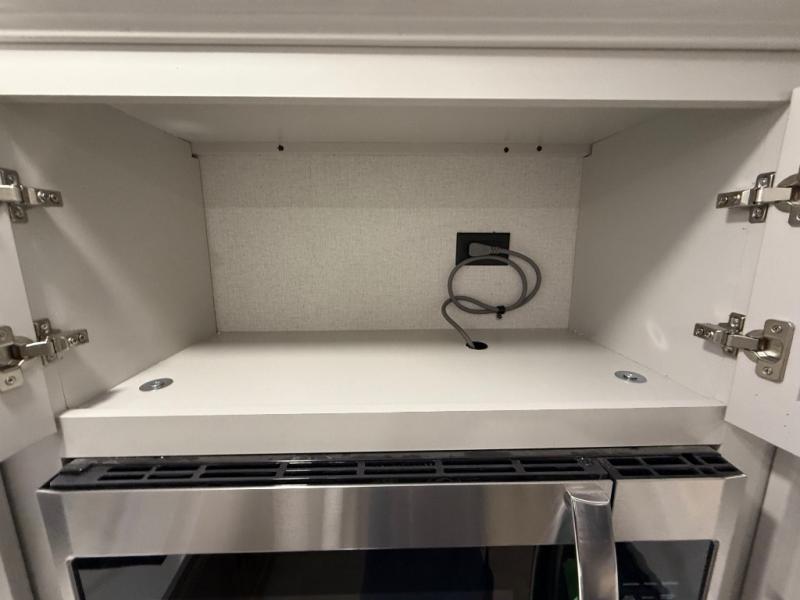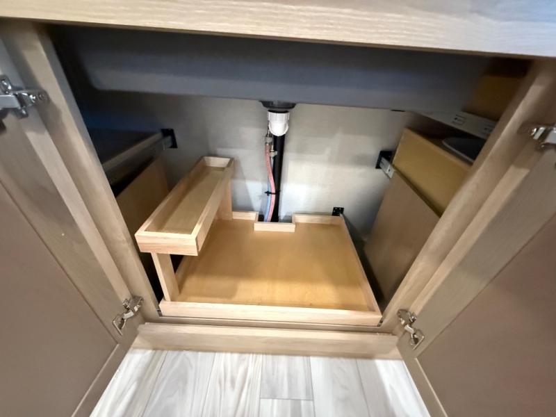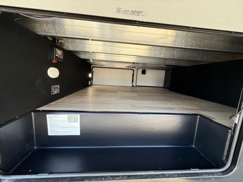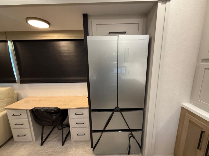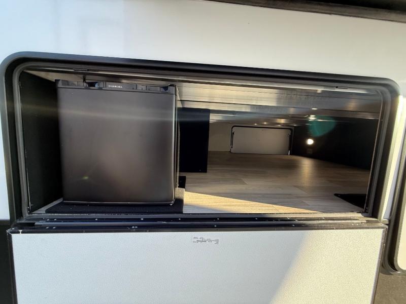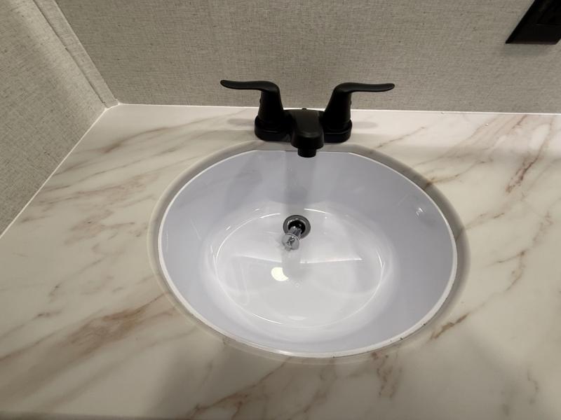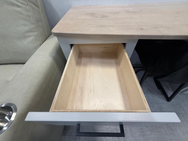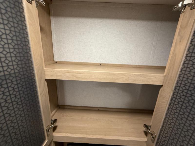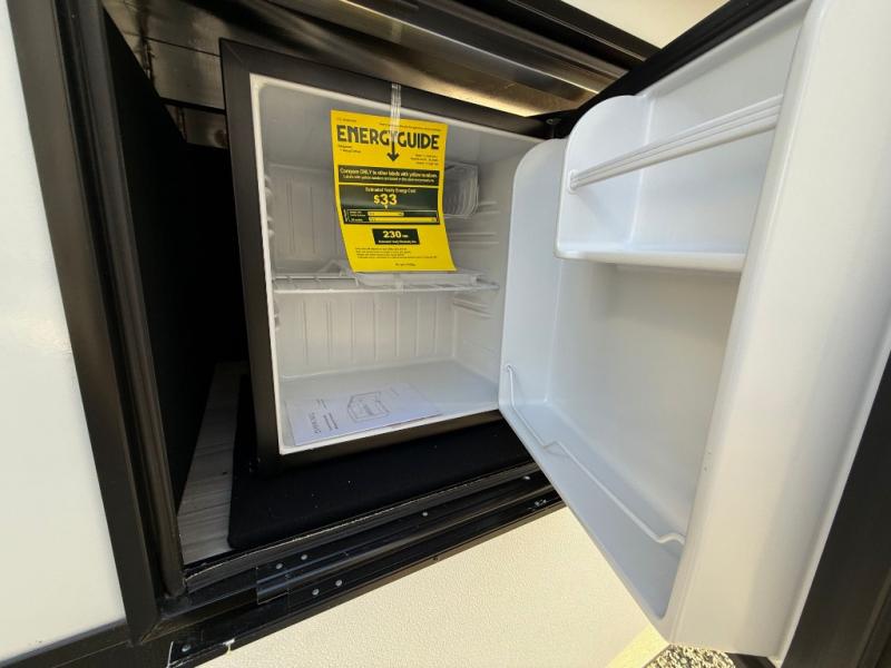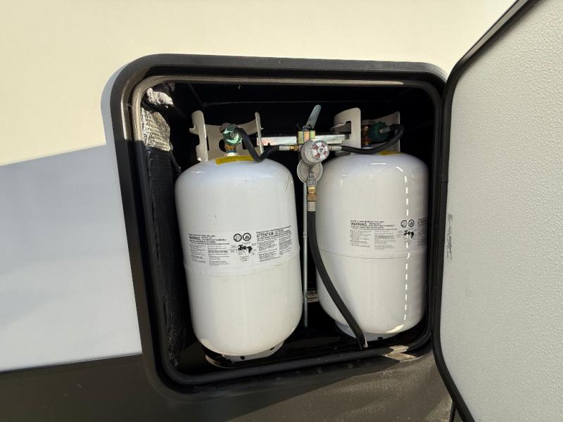 This fifth wheel is packed with convenient features to make your travels more comfortable and enjoyable! The master bedroom includes a king bed slide out with USB ports on either side of the bed so you both can charge your phones, and there is a dresser for your folded clothes. You will love the front bathroom with dual bath sinks, a fiberglass one-piece shower, plus a walk-in closet with shelves and rods to hang clothes! There is a unique middle utility room with washer and dryer prep if you want to add these, a Washer and dryer counter and a rod to hang clothes that will make a perfect laundry room, or you can utilize this space for storage! Head to the main living area to relax on the theater seating or hide-a-bed sofa, and if you have guests stay over, they can sleep here. There is also an entertainment center with a 50" flat screen TV, but you might just leave that off if you're working at the desk with a chair that is provided. We've saved the best part for last, the kitchen! Here, you'll find ample counter space to prep home-cooked meals, a three-burner range with a 24" oven, plus a large counter with barstools where you can enjoy breakfast at each morning. Choosing this fifth wheel is a no-brainer!