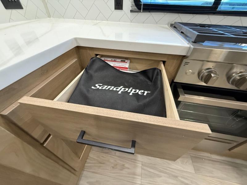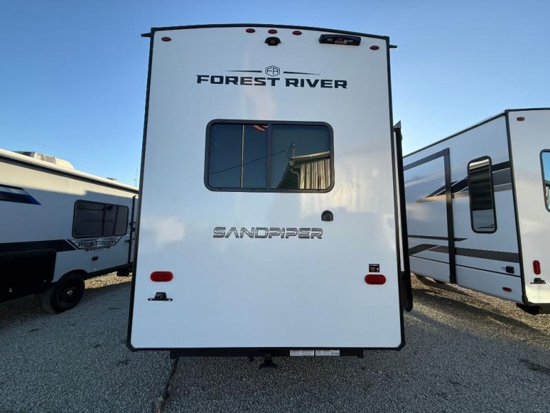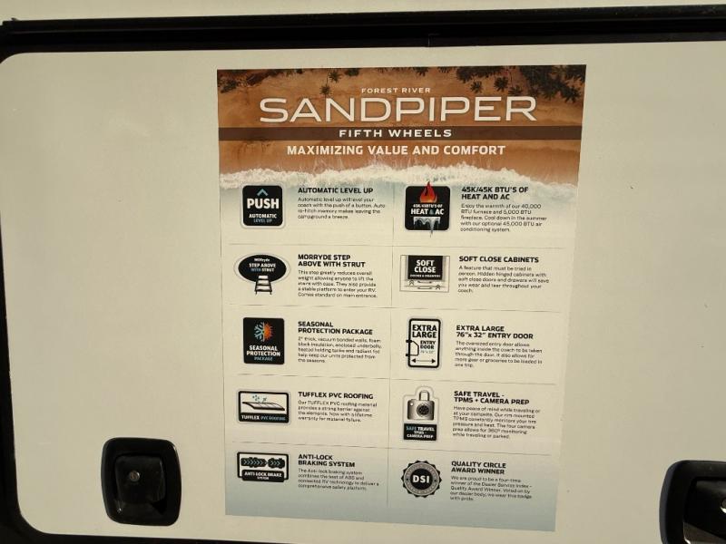 You will find the perfect balance of size, space, features, and luxury with any one of these Forest River Sandpiper fifth wheels! They have a cambered powder coated frame with rust prohibitor, and a fully enclosed underbelly for added protection against the elements. Also, the power front jacks with spring-loaded pins enhance the convenience, speed, and safety. The large, tinted windows come with a 80/20 UV prohibitors. Some hassle-free amenities include a 60k BTU on-demand water heater, porcelain foot flush toilet(s), tire pressure monitor system, and an electric leveling system! Inside, you'll enjoy stainless steel kitchen package, solid surface kitchen countertops, Beachside Sundance Congoleum linoleum, recessed residential lighting, and many more comforts!