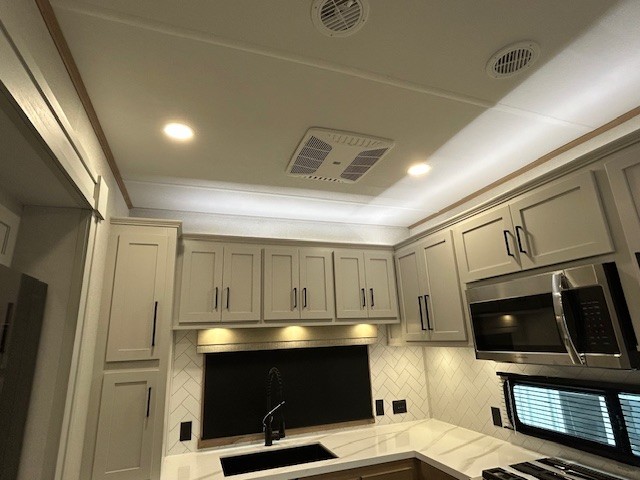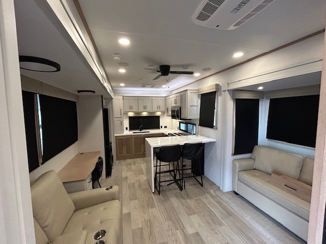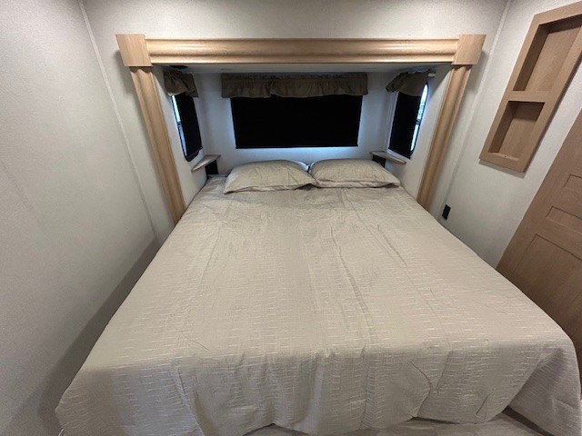 This fifth wheel is packed with convenient features to make your travels more comfortable and enjoyable! The master bedroom includes a king bed slide out with USB ports on either side of the bed so you both can charge your phones, and there is a dresser for your folded clothes. You will love the front bathroom with dual bath sinks, a fiberglass one-piece shower, plus a walk-in closet with shelves and rods to hang clothes! There is a unique middle utility room with washer and dryer prep if you want to add these, a Washer and dryer counter and a rod to hang clothes that will make a perfect laundry room, or you can utilize this space for storage! Head to the main living area to relax on the theater seating or hide-a-bed sofa, and if you have guests stay over, they can sleep here. There is also an entertainment center with a 50" flat screen TV, but you might just leave that off if you're working at the desk with a chair that is provided. We've saved the best part for last, the kitchen! Here, you'll find ample counter space to prep home-cooked meals, a three-burner range with a 24" oven, plus a large counter with barstools where you can enjoy breakfast at each morning. Choosing this fifth wheel is a no-brainer!
