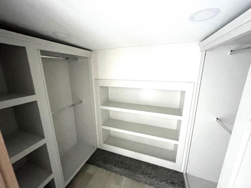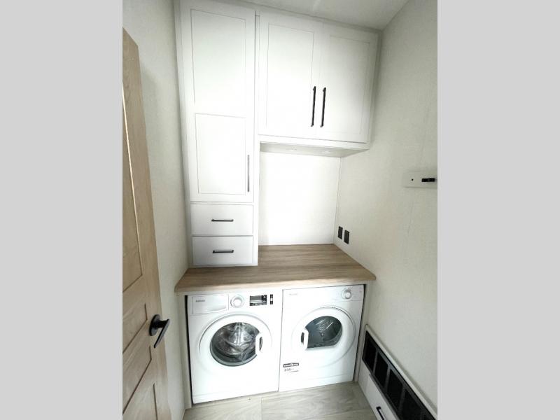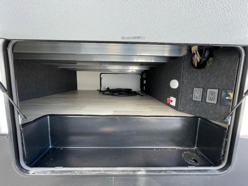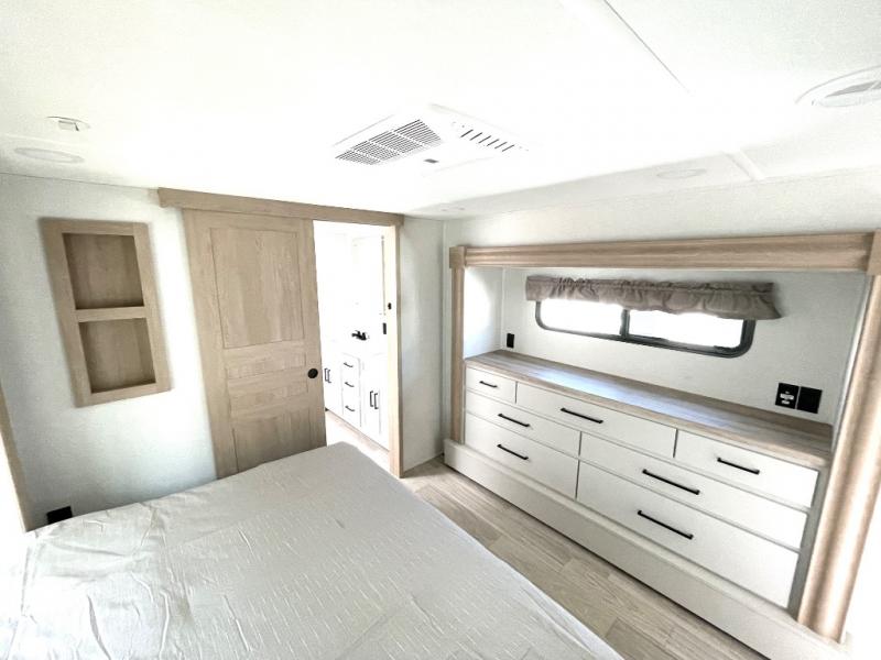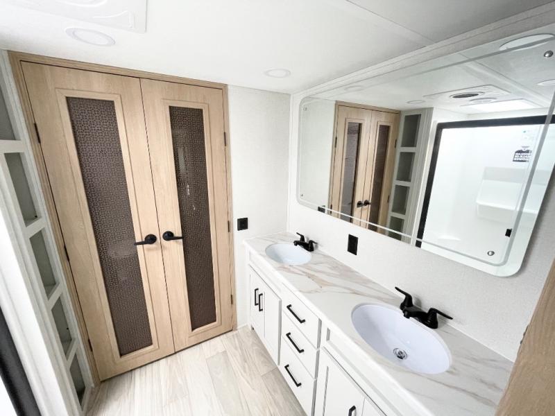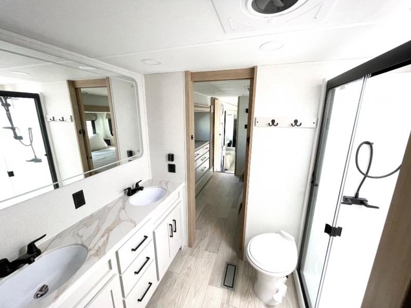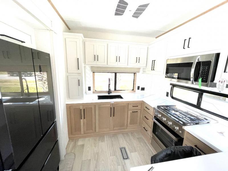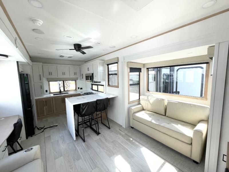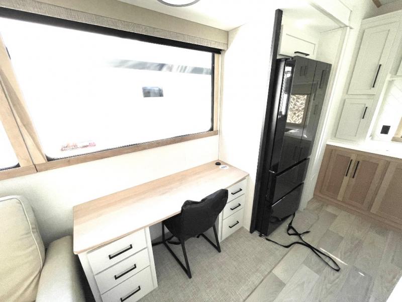 This fifth wheel is packed with convenient features to make your travels more comfortable and enjoyable! The master bedroom includes a king bed slide out with USB ports on either side of the bed so you both can charge your phones, and there is a dresser for your folded clothes. You will love the front bathroom with dual bath sinks, a fiberglass one-piece shower, plus a walk-in closet with shelves and rods to hang clothes! There is a unique middle utility room with washer and dryer prep if you want to add these, a Washer and dryer counter and a rod to hang clothes that will make a perfect laundry room, or you can utilize this space for storage! Head to the main living area to relax on the theater seating or hide-a-bed sofa, and if you have guests stay over, they can sleep here. There is also an entertainment center with a 50" flat screen TV, but you might just leave that off if you're working at the desk with a chair that is provided. We've saved the best part for last, the kitchen! Here, you'll find ample counter space to prep home-cooked meals, a three-burner range with a 24" oven, plus a large counter with barstools where you can enjoy breakfast at each morning. Choosing this fifth wheel is a no-brainer!
