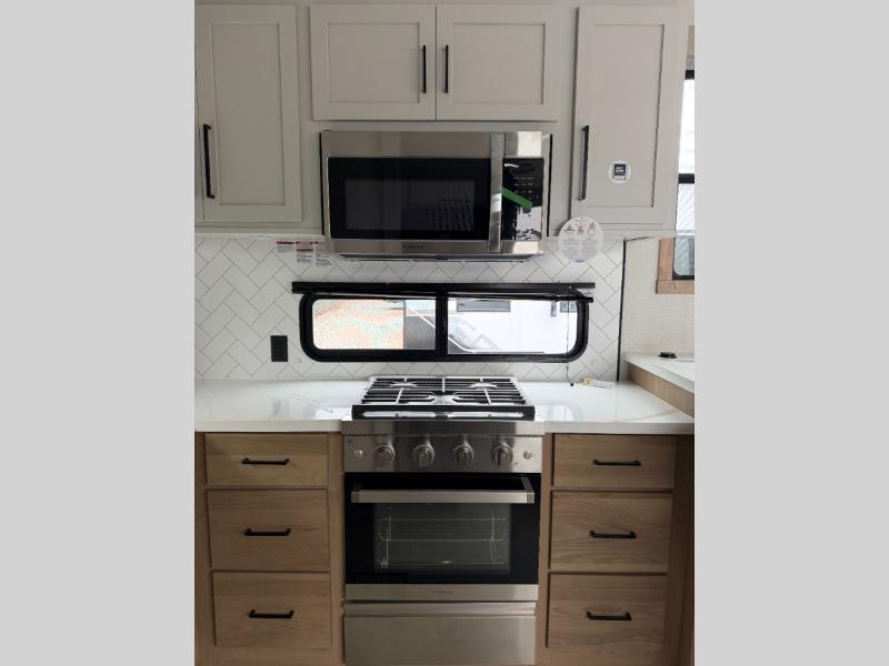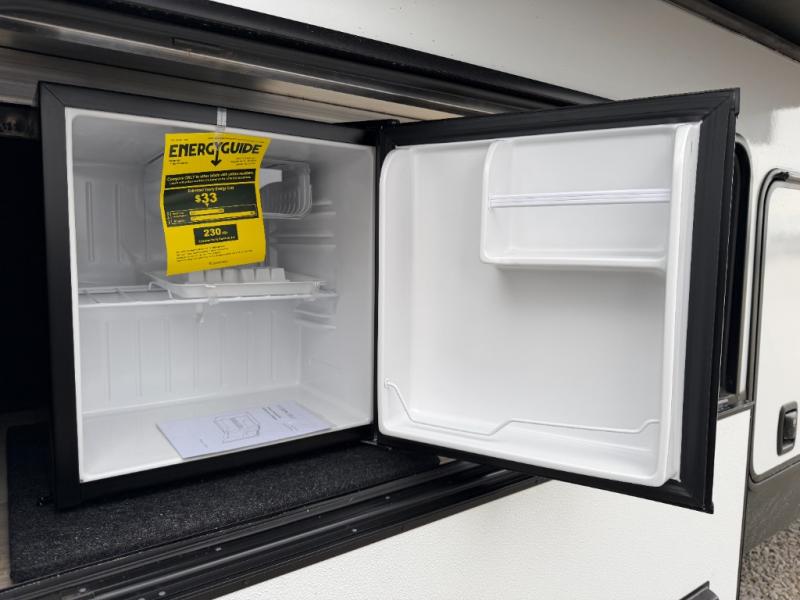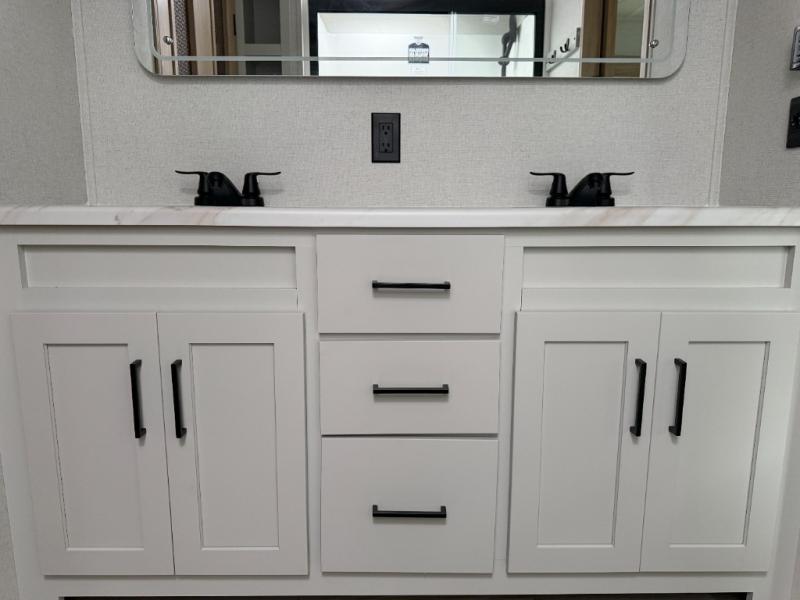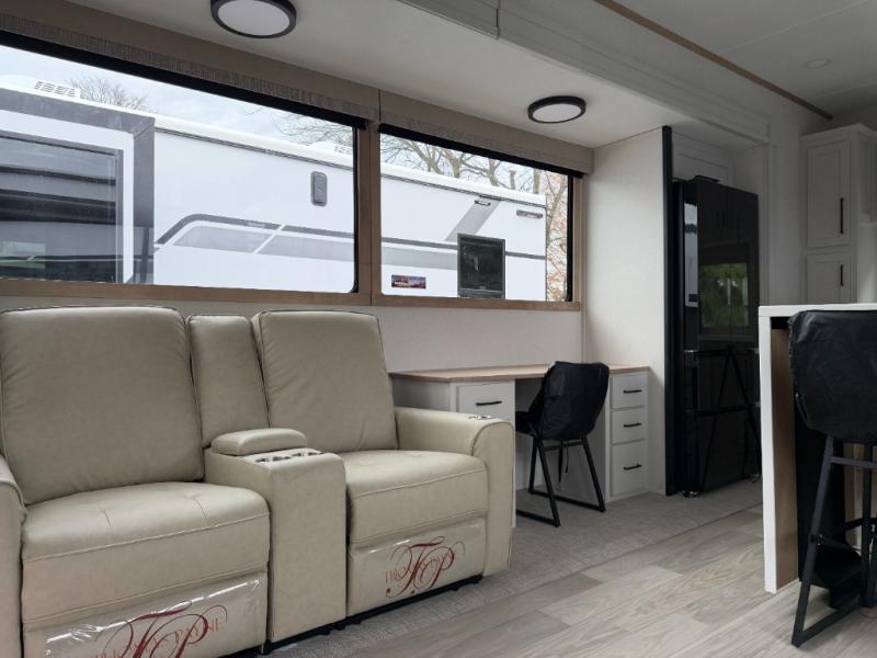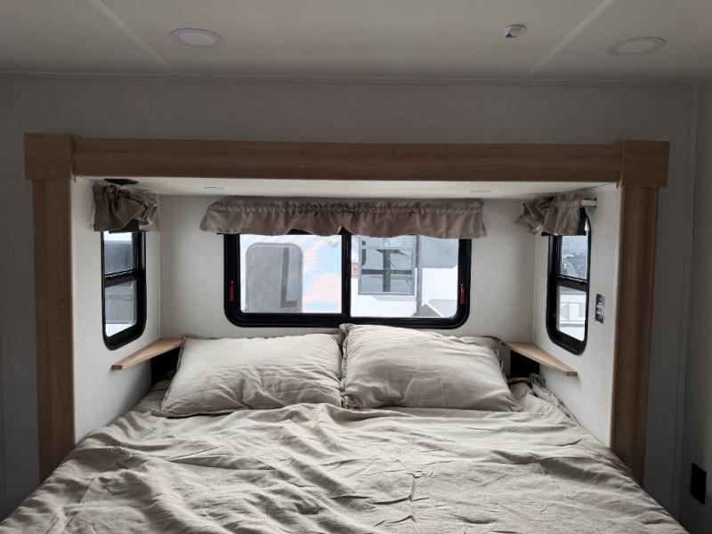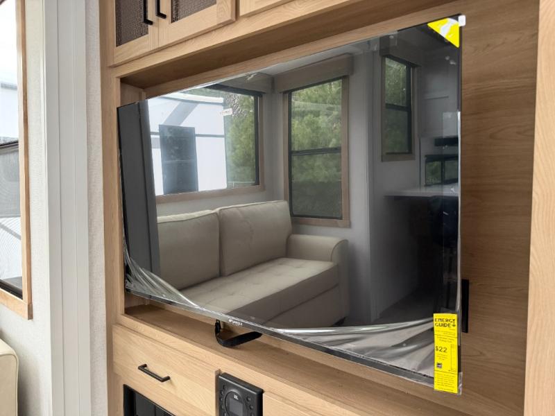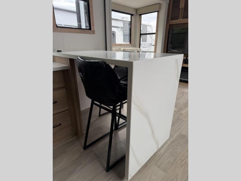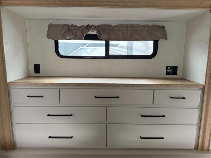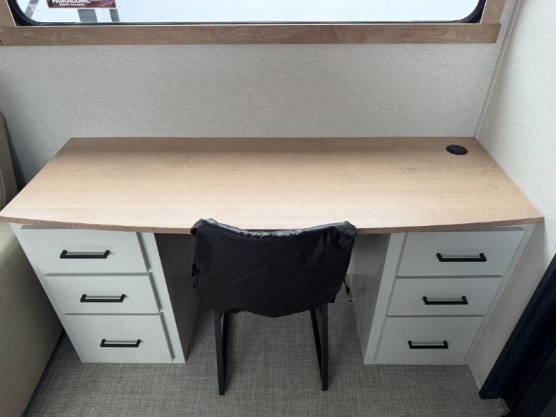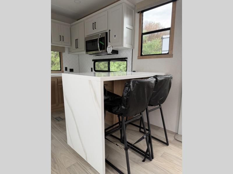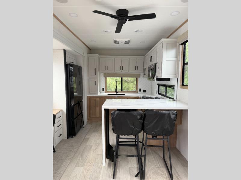 This fifth wheel is packed with convenient features to make your travels more comfortable and enjoyable! The master bedroom includes a king bed slide out with USB ports on either side of the bed so you both can charge your phones, and there is a dresser for your folded clothes. You will love the front bathroom with dual bath sinks, a fiberglass one-piece shower, plus a walk-in closet with shelves and rods to hang clothes! There is a unique middle utility room with washer and dryer prep if you want to add these, a Washer and dryer counter and a rod to hang clothes that will make a perfect laundry room, or you can utilize this space for storage! Head to the main living area to relax on the theater seating or hide-a-bed sofa, and if you have guests stay over, they can sleep here. There is also an entertainment center with a 50" flat screen TV, but you might just leave that off if you're working at the desk with a chair that is provided. We've saved the best part for last, the kitchen! Here, you'll find ample counter space to prep home-cooked meals, a three-burner range with a 24" oven, plus a large counter with barstools where you can enjoy breakfast at each morning. Choosing this fifth wheel is a no-brainer!