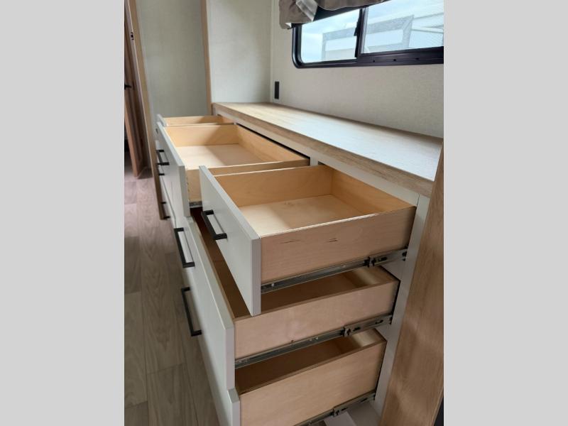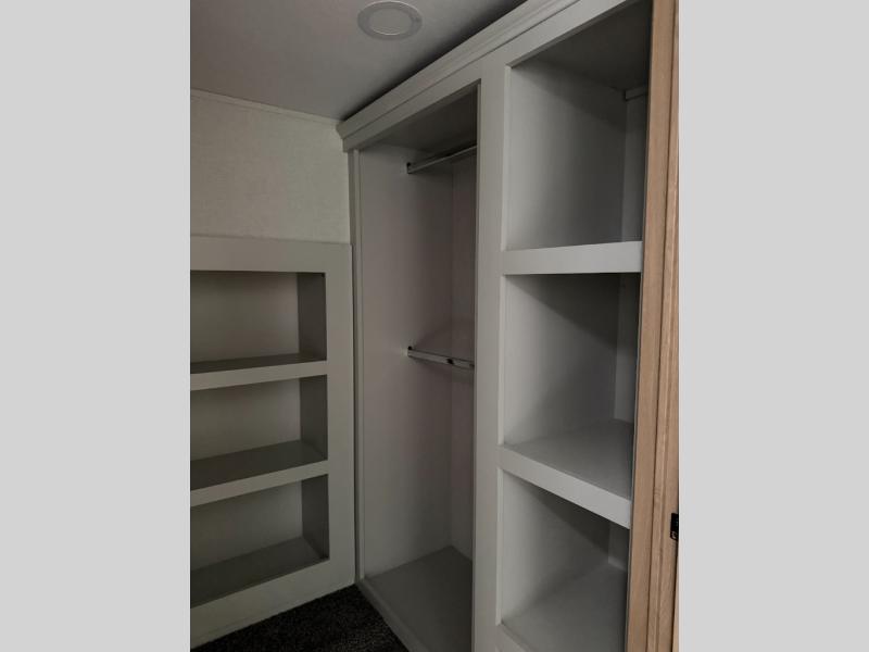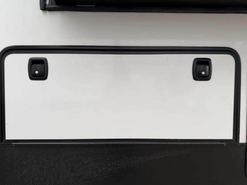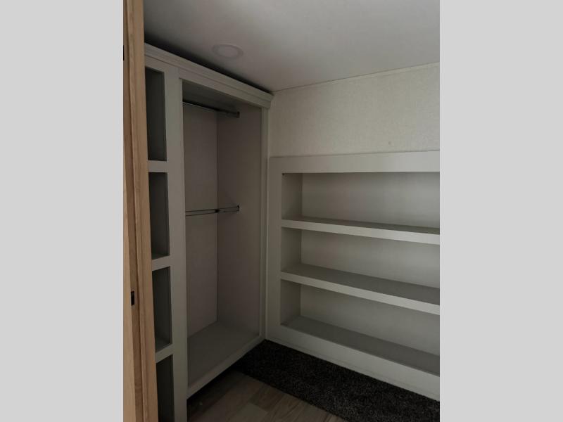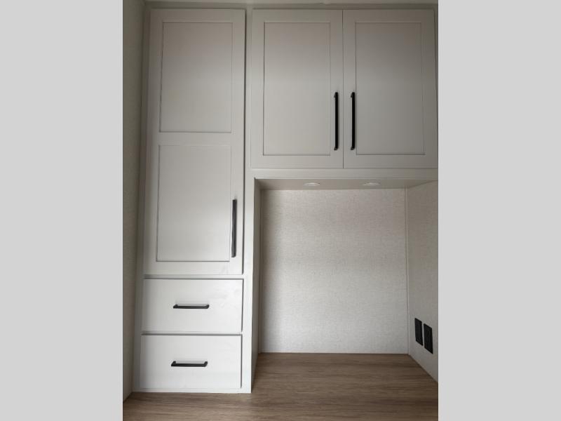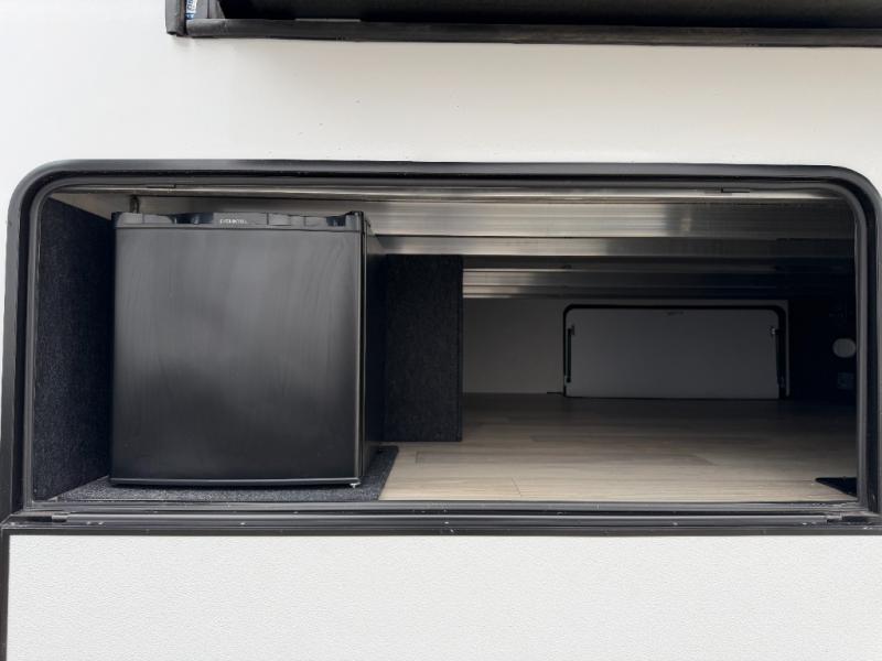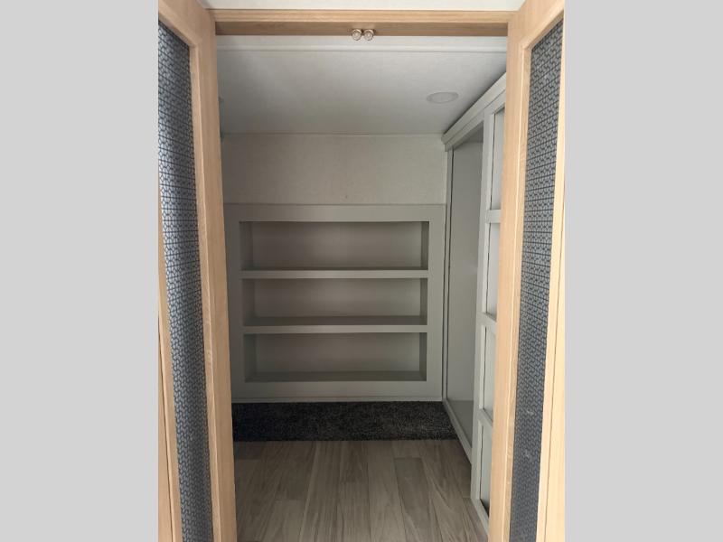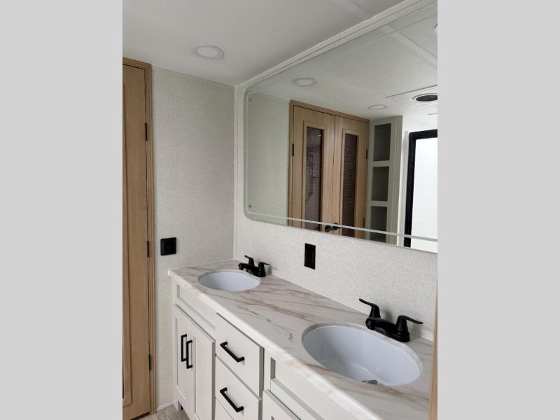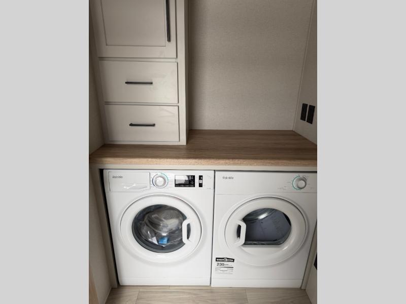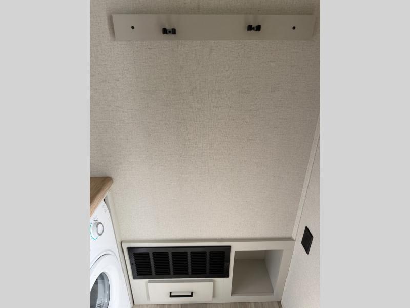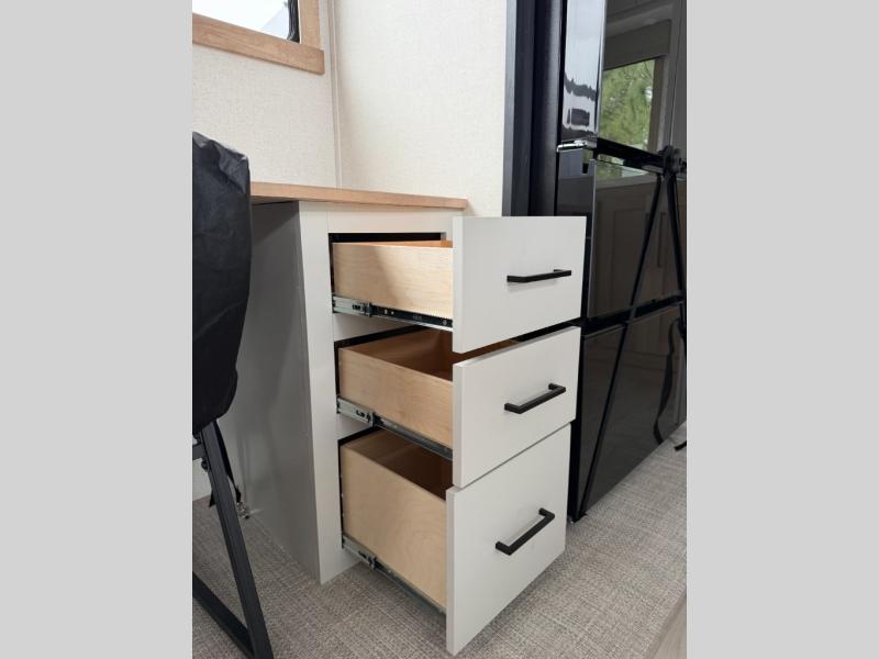 This fifth wheel is packed with convenient features to make your travels more comfortable and enjoyable! The master bedroom includes a king bed slide out with USB ports on either side of the bed so you both can charge your phones, and there is a dresser for your folded clothes. You will love the front bathroom with dual bath sinks, a fiberglass one-piece shower, plus a walk-in closet with shelves and rods to hang clothes! There is a unique middle utility room with washer and dryer prep if you want to add these, a Washer and dryer counter and a rod to hang clothes that will make a perfect laundry room, or you can utilize this space for storage! Head to the main living area to relax on the theater seating or hide-a-bed sofa, and if you have guests stay over, they can sleep here. There is also an entertainment center with a 50" flat screen TV, but you might just leave that off if you're working at the desk with a chair that is provided. We've saved the best part for last, the kitchen! Here, you'll find ample counter space to prep home-cooked meals, a three-burner range with a 24" oven, plus a large counter with barstools where you can enjoy breakfast at each morning. Choosing this fifth wheel is a no-brainer!