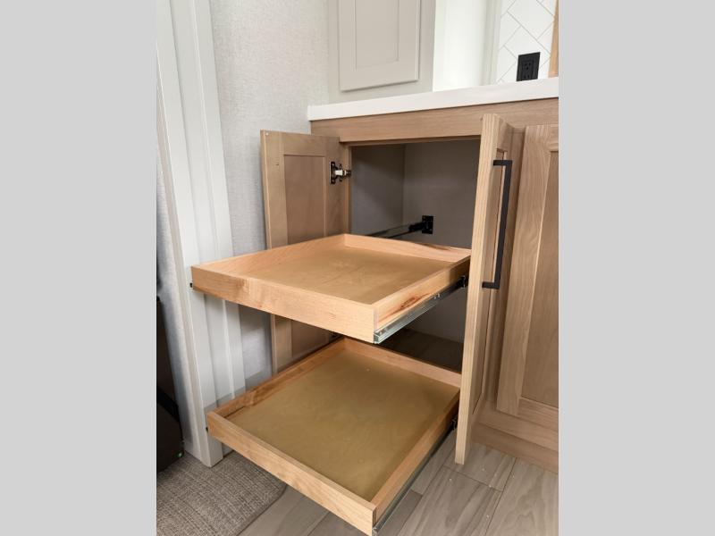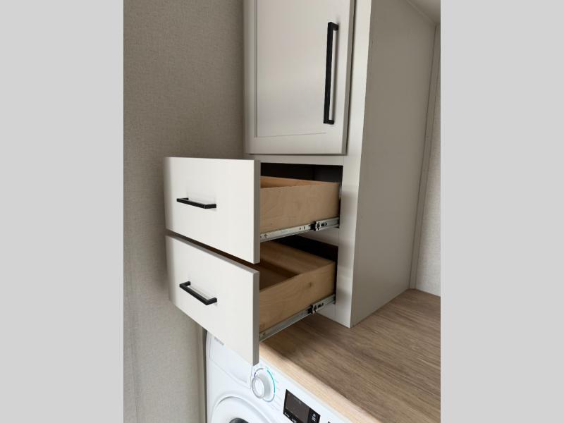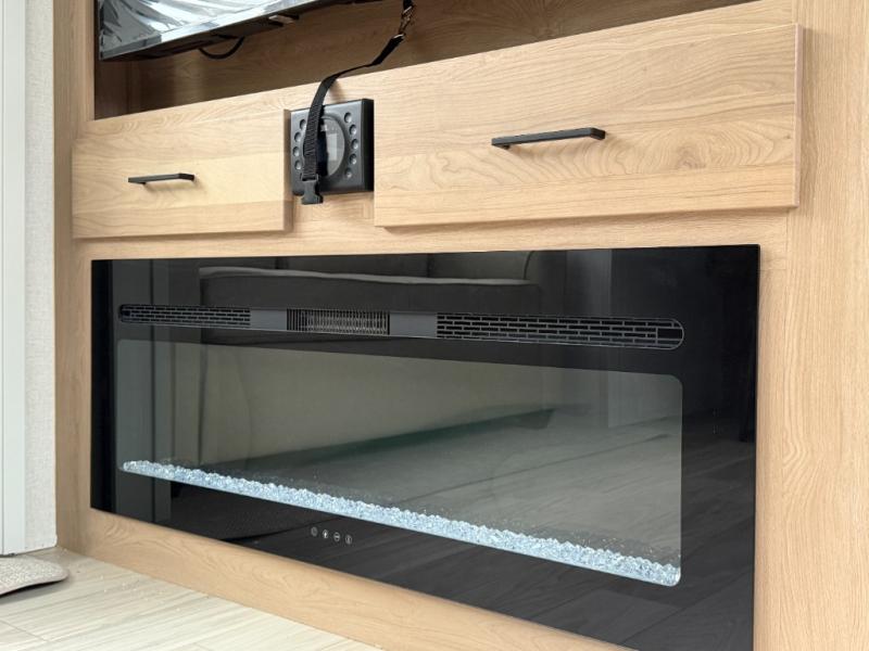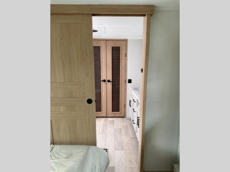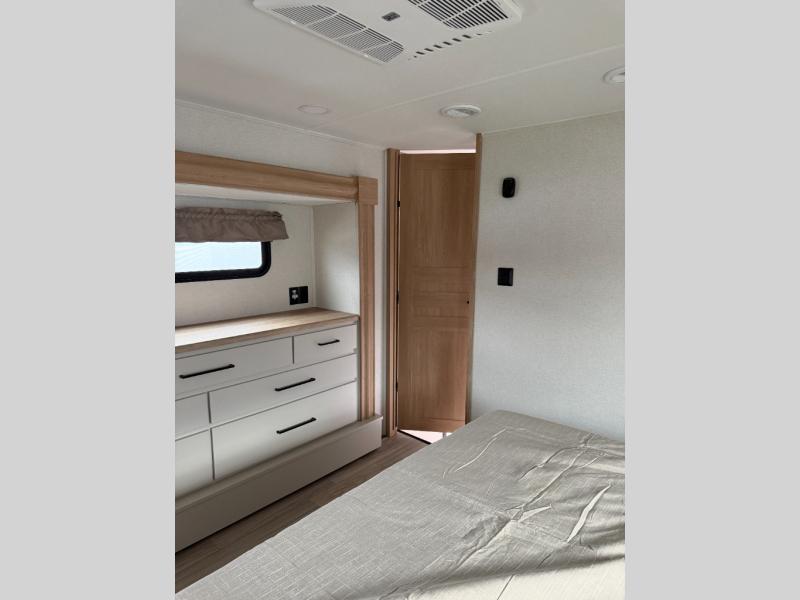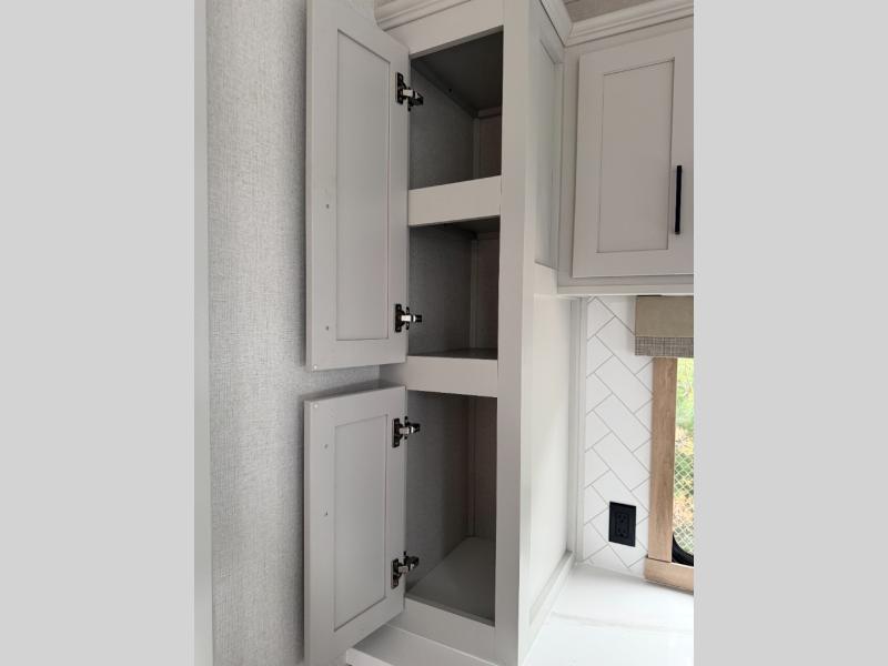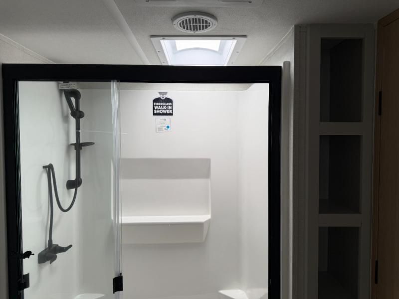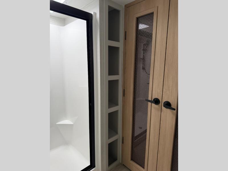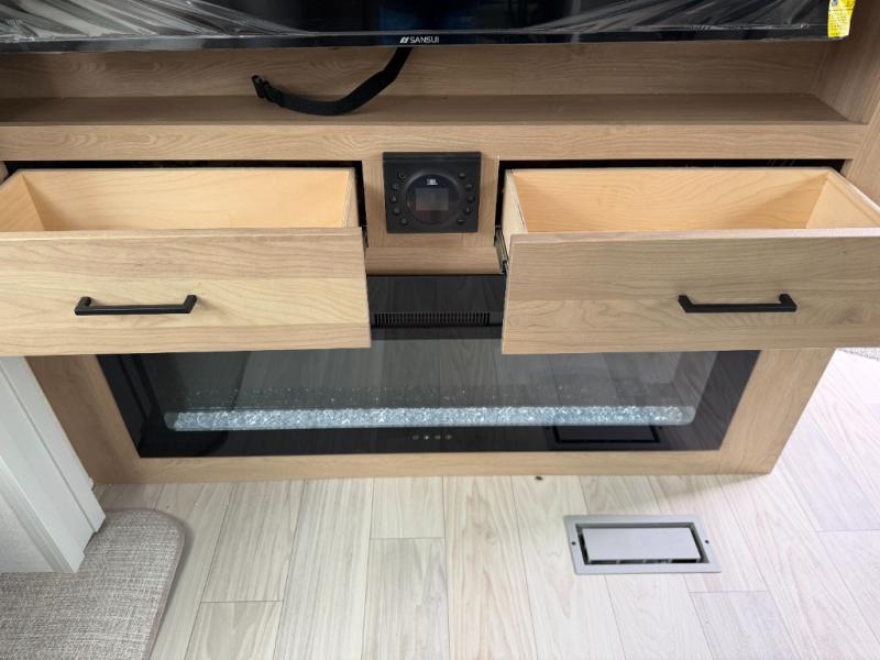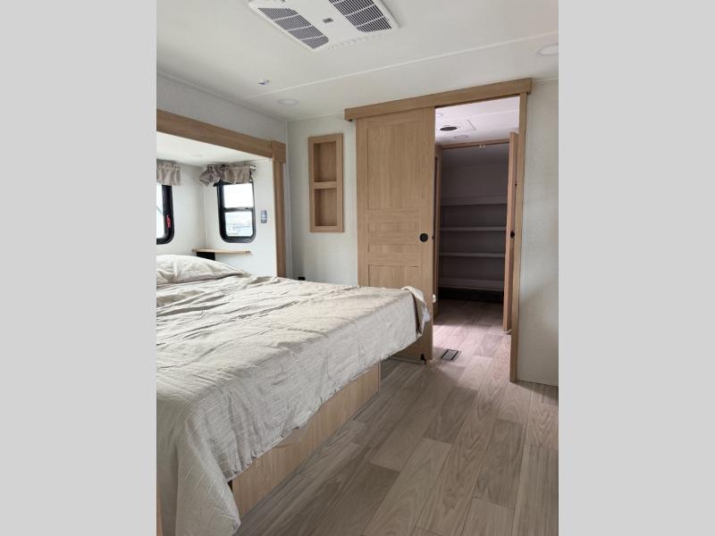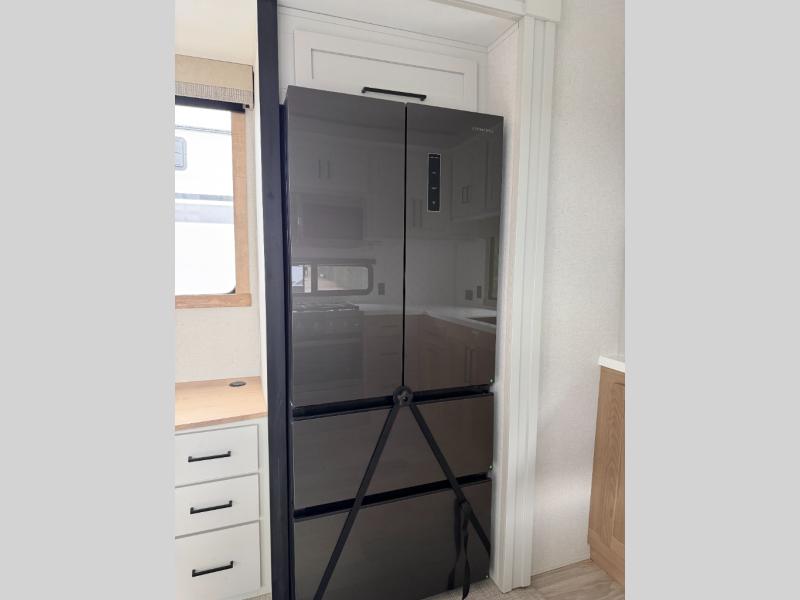 This fifth wheel is packed with convenient features to make your travels more comfortable and enjoyable! The master bedroom includes a king bed slide out with USB ports on either side of the bed so you both can charge your phones, and there is a dresser for your folded clothes. You will love the front bathroom with dual bath sinks, a fiberglass one-piece shower, plus a walk-in closet with shelves and rods to hang clothes! There is a unique middle utility room with washer and dryer prep if you want to add these, a Washer and dryer counter and a rod to hang clothes that will make a perfect laundry room, or you can utilize this space for storage! Head to the main living area to relax on the theater seating or hide-a-bed sofa, and if you have guests stay over, they can sleep here. There is also an entertainment center with a 50" flat screen TV, but you might just leave that off if you're working at the desk with a chair that is provided. We've saved the best part for last, the kitchen! Here, you'll find ample counter space to prep home-cooked meals, a three-burner range with a 24" oven, plus a large counter with barstools where you can enjoy breakfast at each morning. Choosing this fifth wheel is a no-brainer!