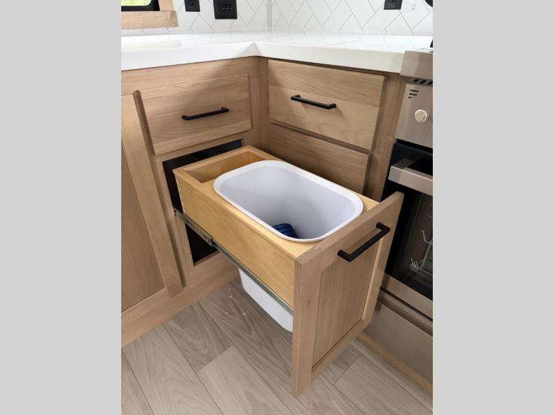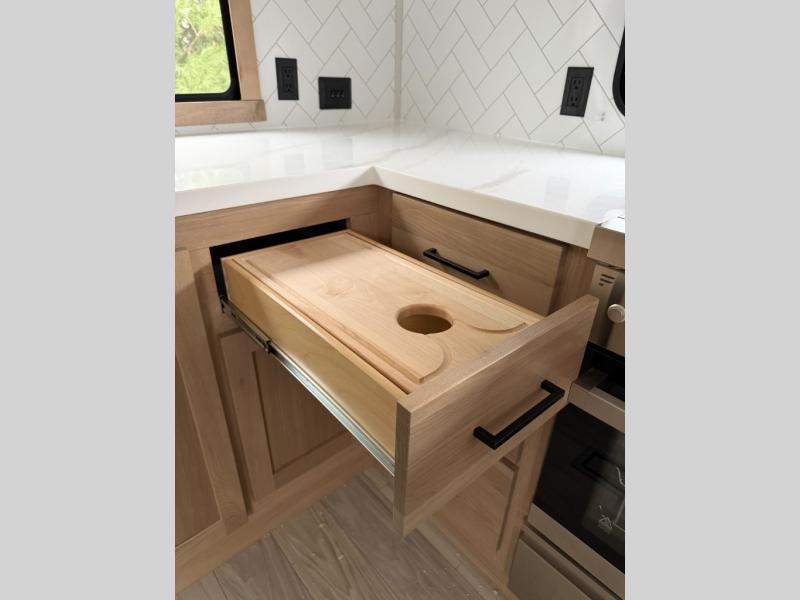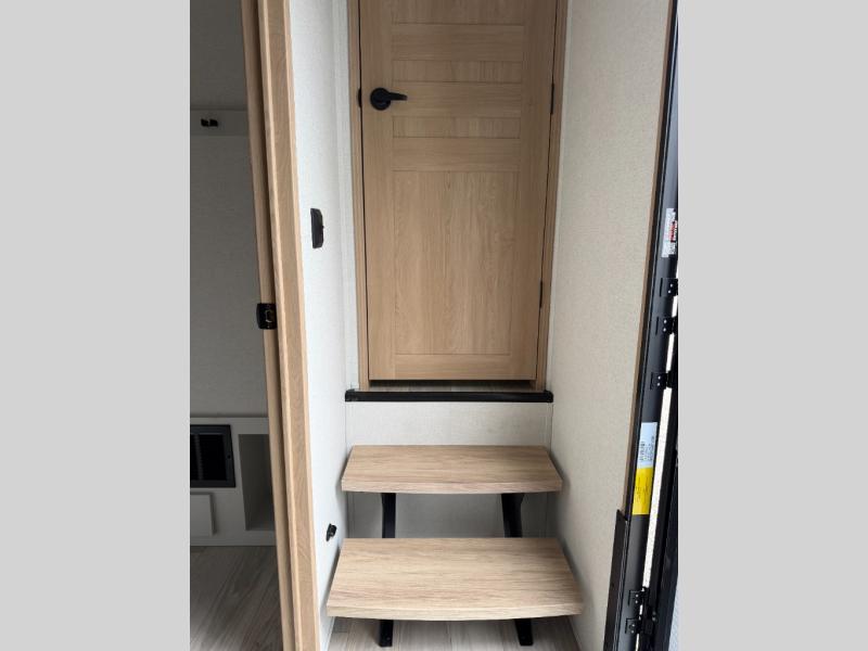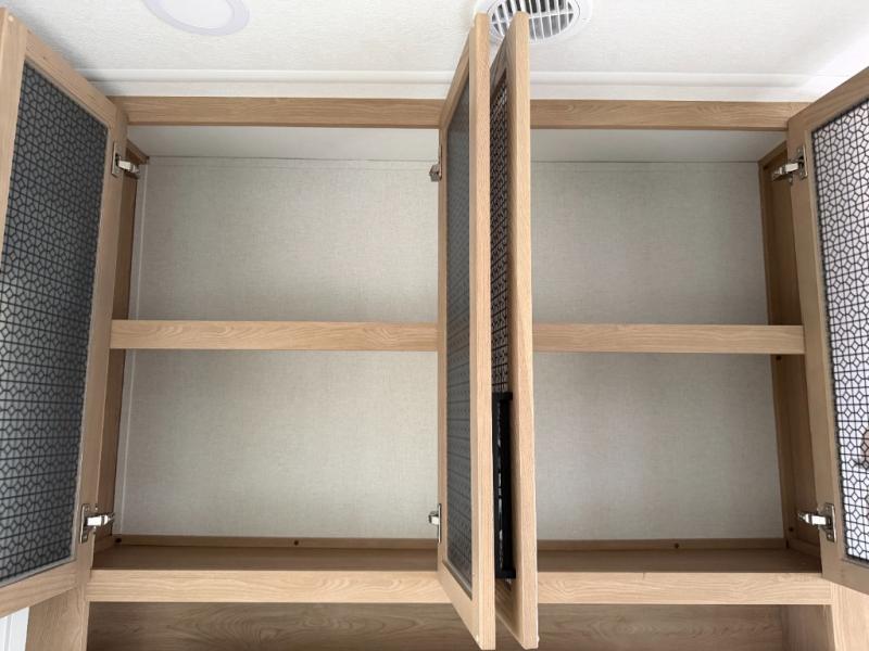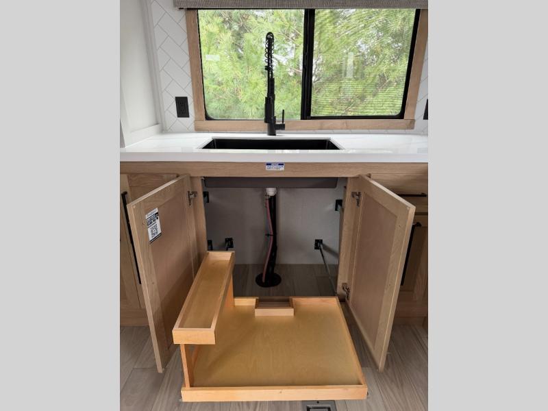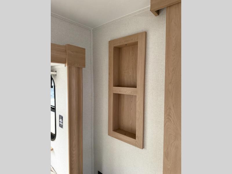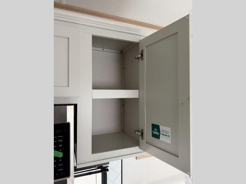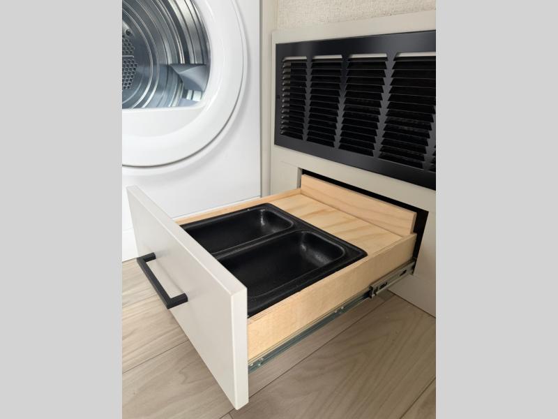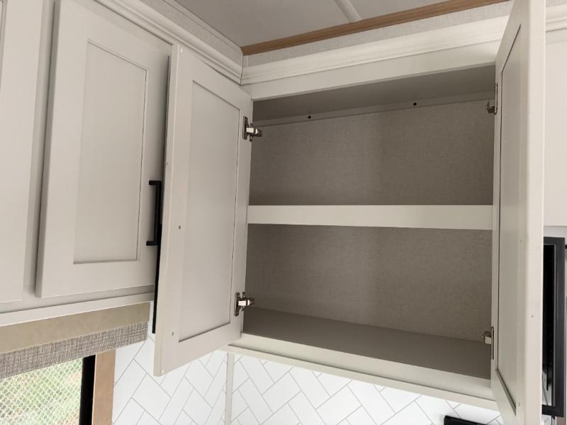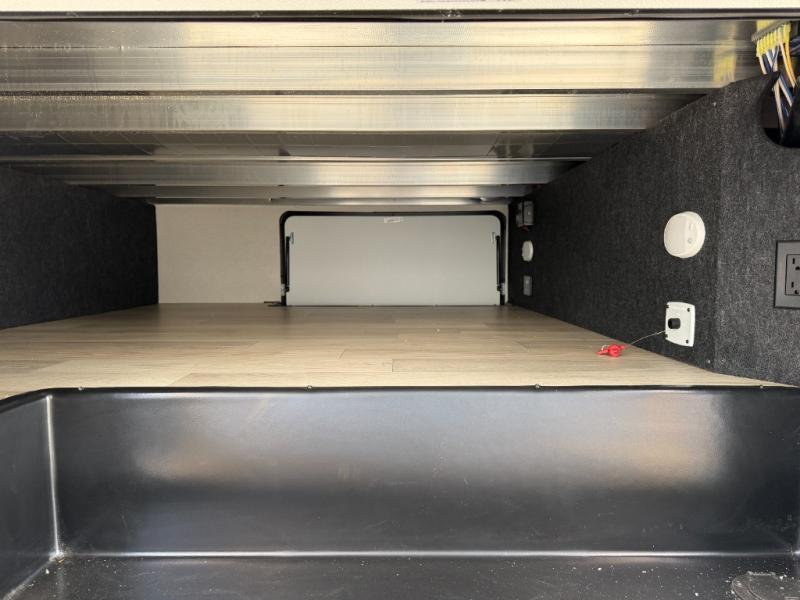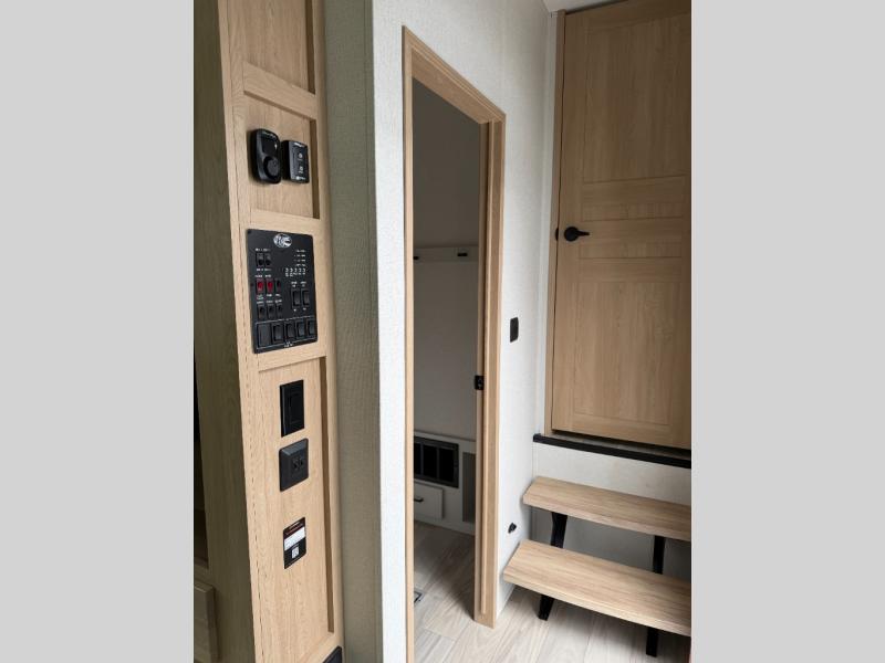 This fifth wheel is packed with convenient features to make your travels more comfortable and enjoyable! The master bedroom includes a king bed slide out with USB ports on either side of the bed so you both can charge your phones, and there is a dresser for your folded clothes. You will love the front bathroom with dual bath sinks, a fiberglass one-piece shower, plus a walk-in closet with shelves and rods to hang clothes! There is a unique middle utility room with washer and dryer prep if you want to add these, a Washer and dryer counter and a rod to hang clothes that will make a perfect laundry room, or you can utilize this space for storage! Head to the main living area to relax on the theater seating or hide-a-bed sofa, and if you have guests stay over, they can sleep here. There is also an entertainment center with a 50" flat screen TV, but you might just leave that off if you're working at the desk with a chair that is provided. We've saved the best part for last, the kitchen! Here, you'll find ample counter space to prep home-cooked meals, a three-burner range with a 24" oven, plus a large counter with barstools where you can enjoy breakfast at each morning. Choosing this fifth wheel is a no-brainer!