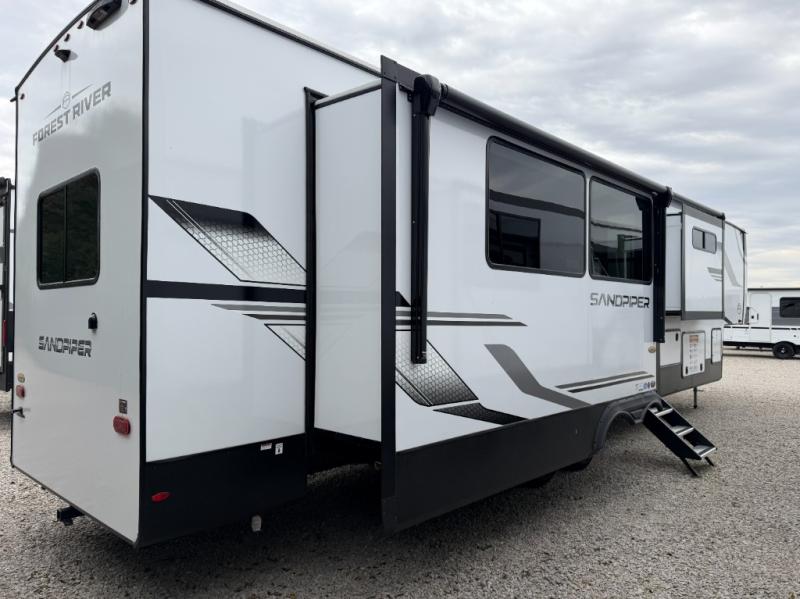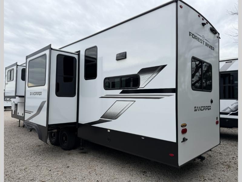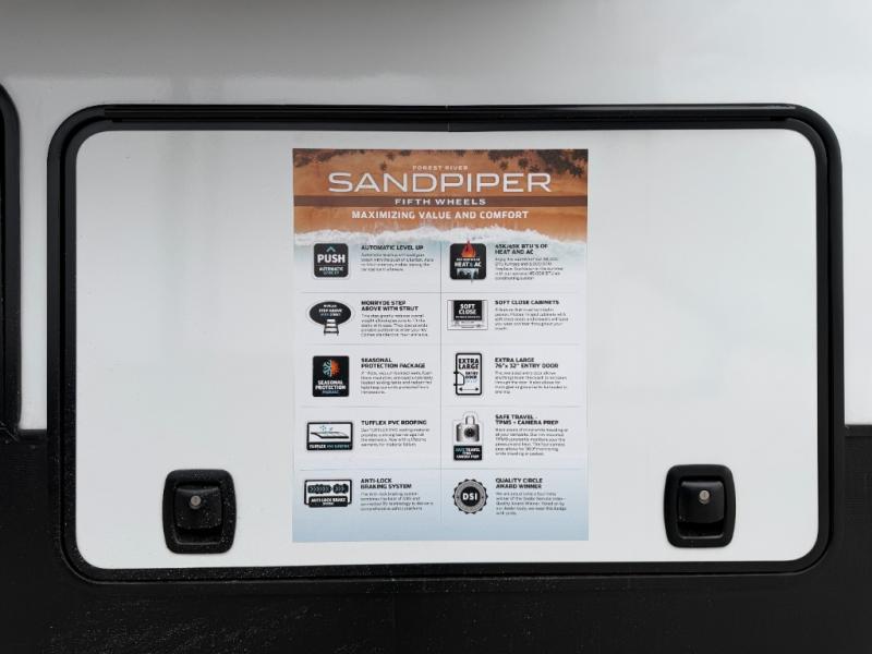 You will find the perfect balance of size, space, features, and luxury with any one of these Forest River Sandpiper fifth wheels! They have a cambered powder coated frame with rust prohibitor, and a fully enclosed underbelly for added protection against the elements. Also, the power front jacks with spring-loaded pins enhance the convenience, speed, and safety. The large, tinted windows come with a 80/20 UV prohibitors. Some hassle-free amenities include a 60k BTU on-demand water heater, porcelain foot flush toilet(s), tire pressure monitor system, and an electric leveling system! Inside, you'll enjoy stainless steel kitchen package, solid surface kitchen countertops, Beachside Sundance Congoleum linoleum, recessed residential lighting, and many more comforts!