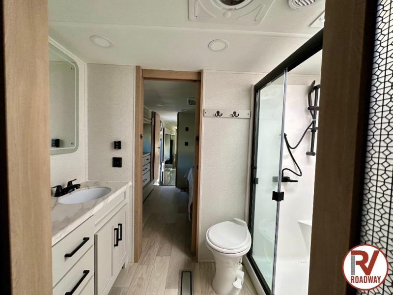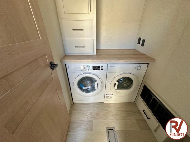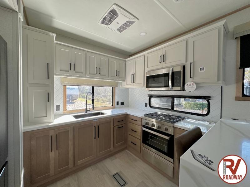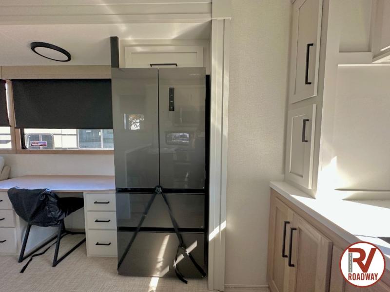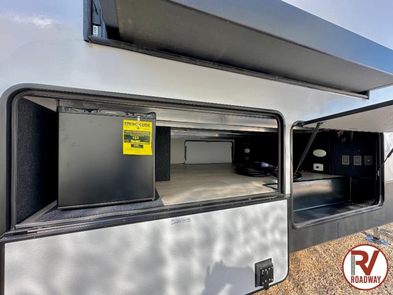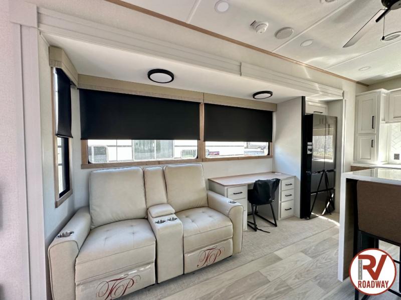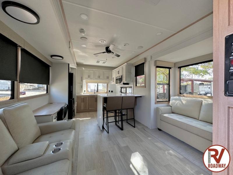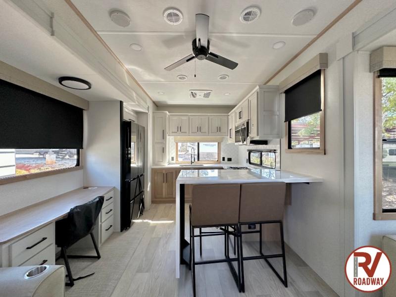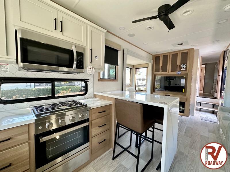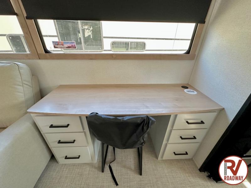 This fifth wheel is packed with convenient features to make your travels more comfortable and enjoyable! The master bedroom includes a king bed slide out with USB ports on either side of the bed so you both can charge your phones, and there is a dresser for your folded clothes. You will love the front bathroom with dual bath sinks, a fiberglass one-piece shower, plus a walk-in closet with shelves and rods to hang clothes! There is a unique middle utility room with washer and dryer prep if you want to add these, a Washer and dryer counter and a rod to hang clothes that will make a perfect laundry room, or you can utilize this space for storage! Head to the main living area to relax on the theater seating or hide-a-bed sofa, and if you have guests stay over, they can sleep here. There is also an entertainment center with a 50" flat screen TV, but you might just leave that off if you're working at the desk with a chair that is provided. We've saved the best part for last, the kitchen! Here, you'll find ample counter space to prep home-cooked meals, a three-burner range with a 24" oven, plus a large counter with barstools where you can enjoy breakfast at each morning. Choosing this fifth wheel is a no-brainer!