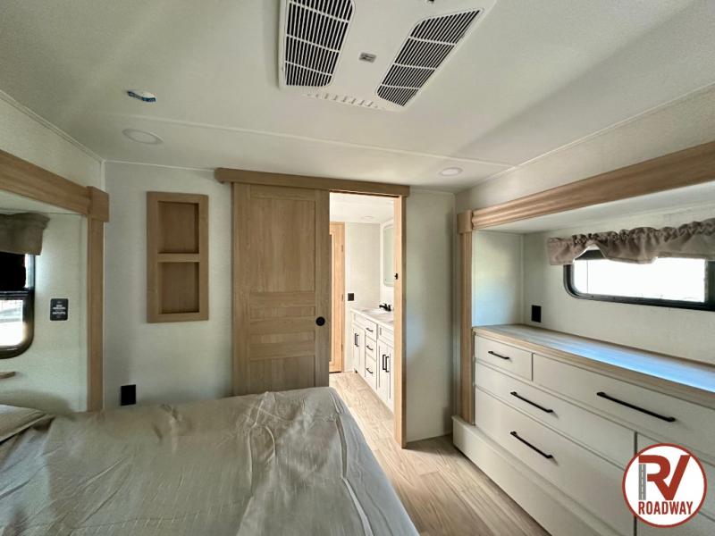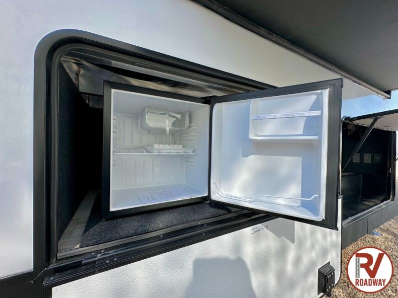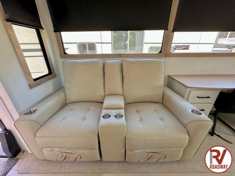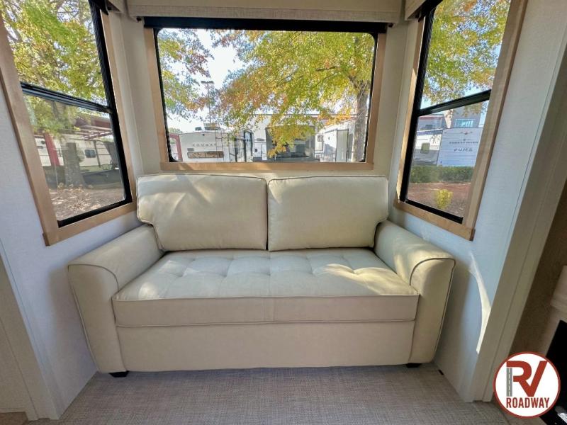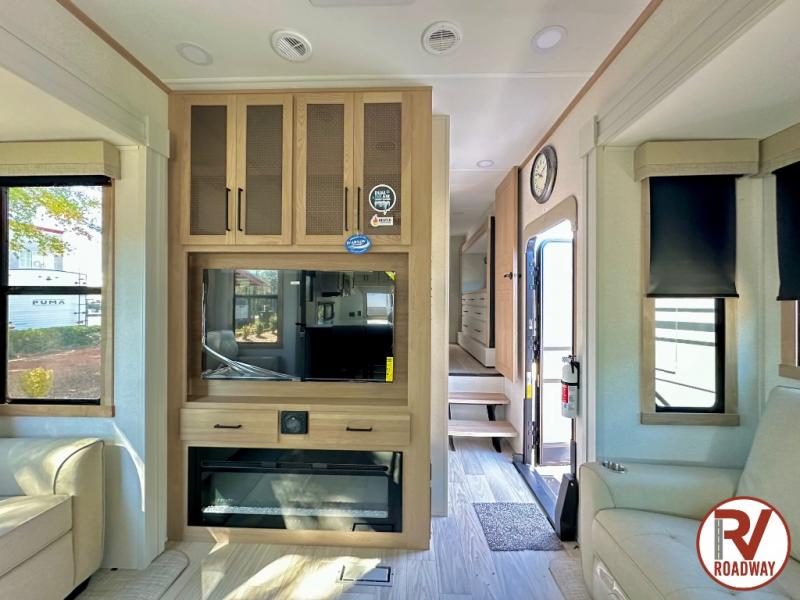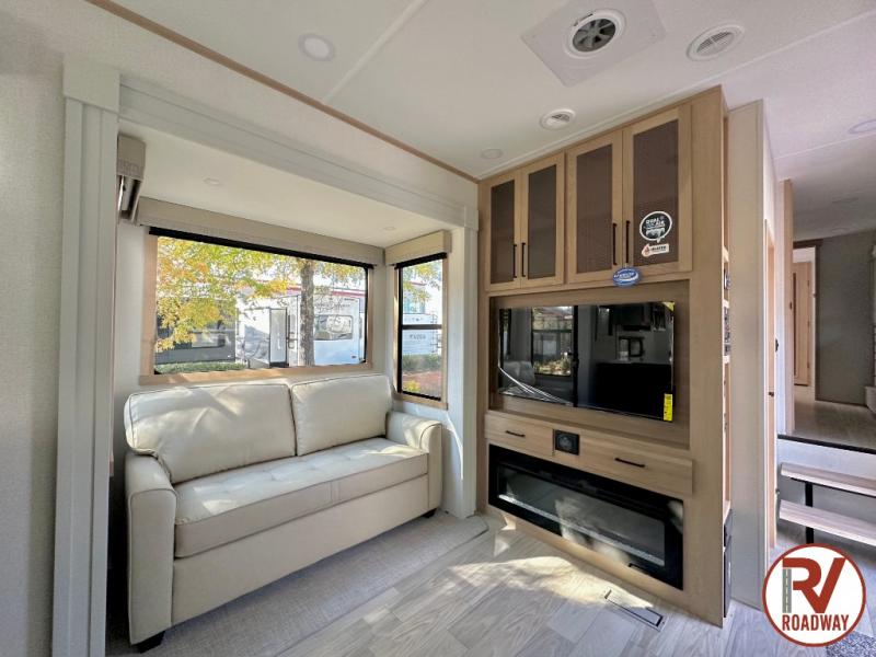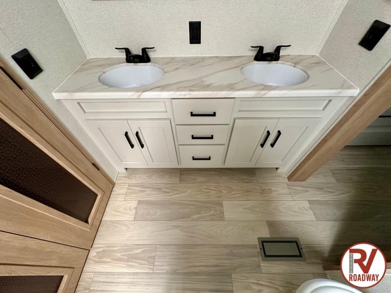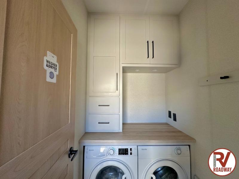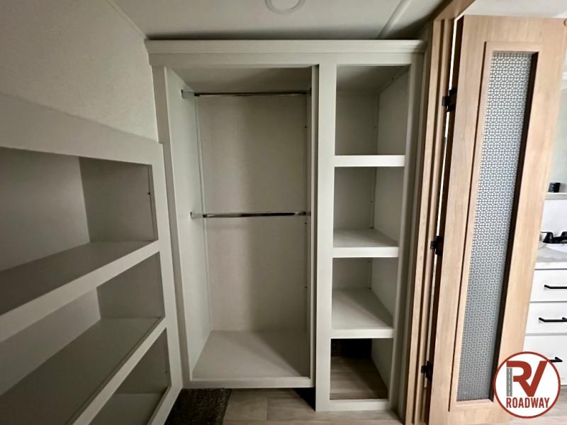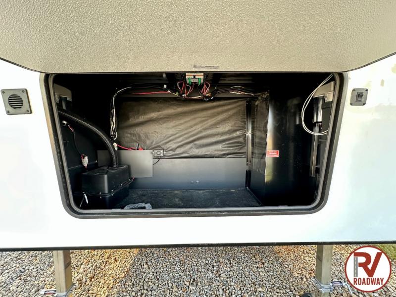 This fifth wheel is packed with convenient features to make your travels more comfortable and enjoyable! The master bedroom includes a king bed slide out with USB ports on either side of the bed so you both can charge your phones, and there is a dresser for your folded clothes. You will love the front bathroom with dual bath sinks, a fiberglass one-piece shower, plus a walk-in closet with shelves and rods to hang clothes! There is a unique middle utility room with washer and dryer prep if you want to add these, a Washer and dryer counter and a rod to hang clothes that will make a perfect laundry room, or you can utilize this space for storage! Head to the main living area to relax on the theater seating or hide-a-bed sofa, and if you have guests stay over, they can sleep here. There is also an entertainment center with a 50" flat screen TV, but you might just leave that off if you're working at the desk with a chair that is provided. We've saved the best part for last, the kitchen! Here, you'll find ample counter space to prep home-cooked meals, a three-burner range with a 24" oven, plus a large counter with barstools where you can enjoy breakfast at each morning. Choosing this fifth wheel is a no-brainer!