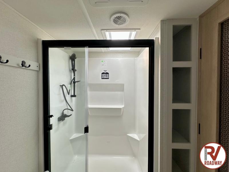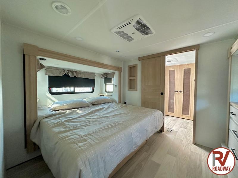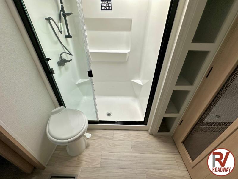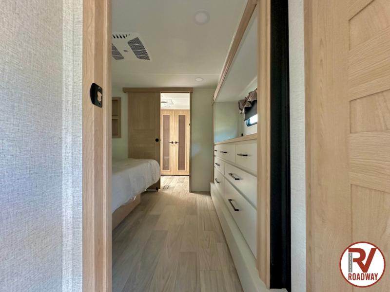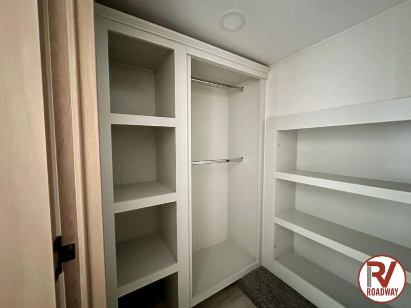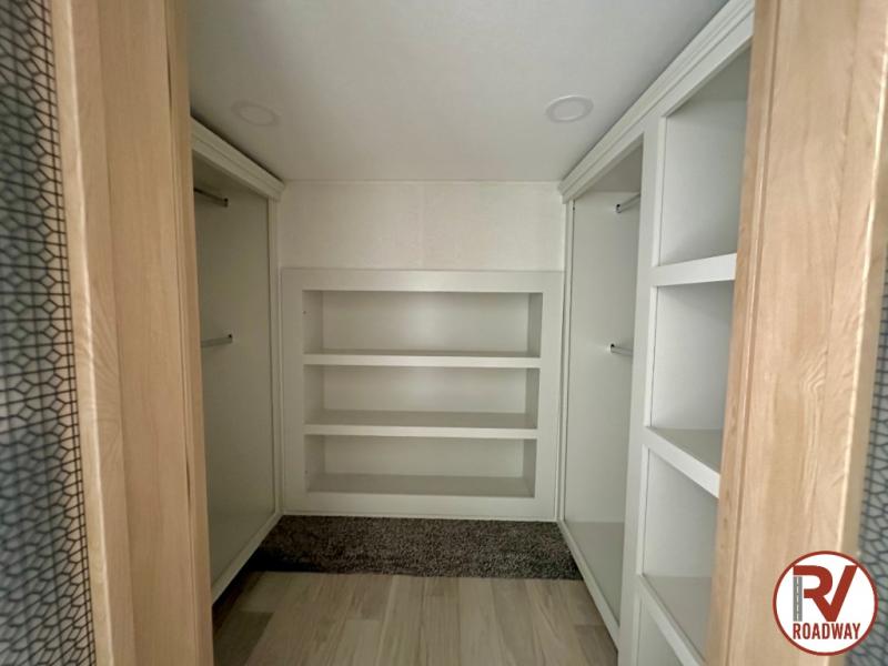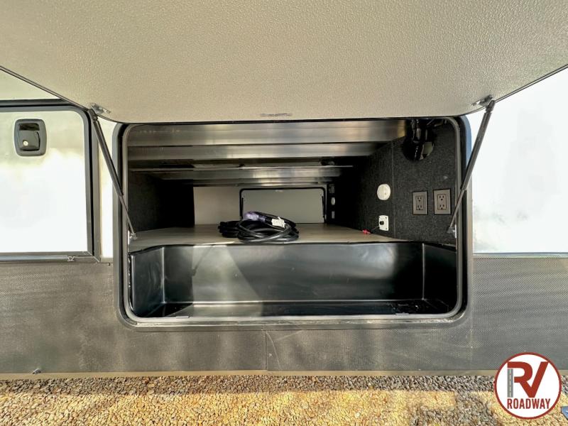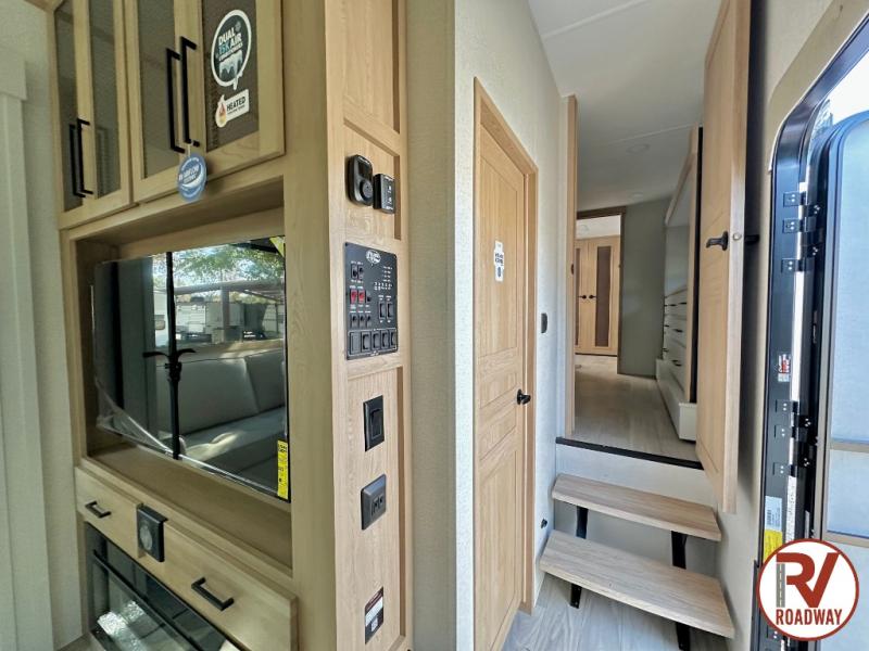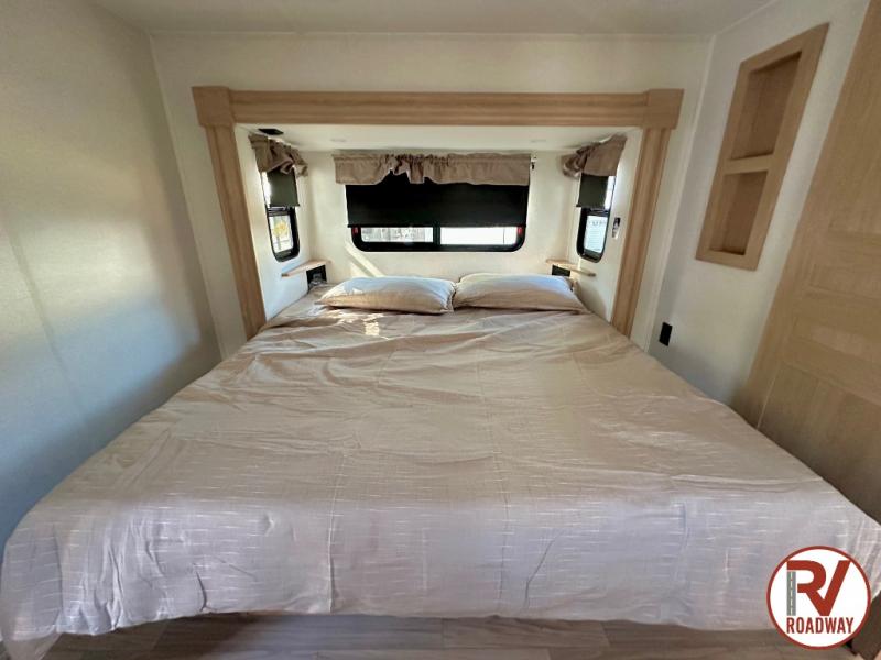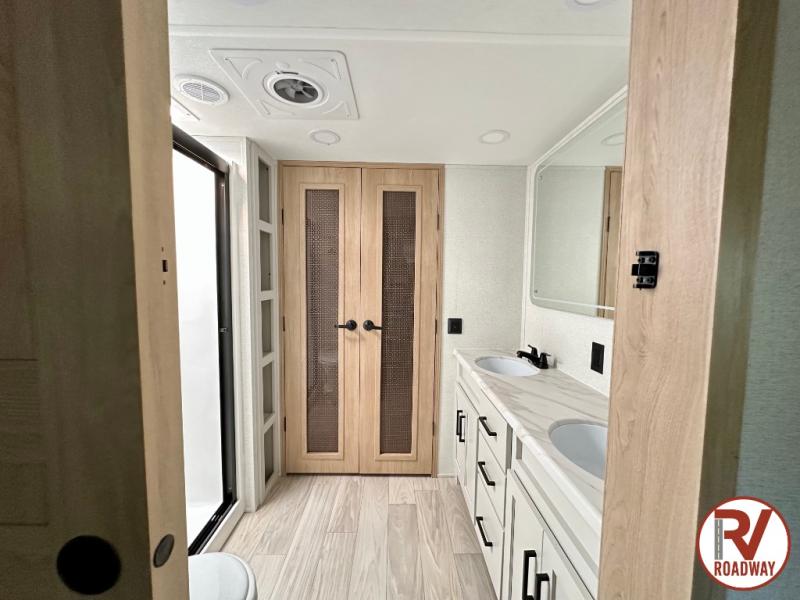 This fifth wheel is packed with convenient features to make your travels more comfortable and enjoyable! The master bedroom includes a king bed slide out with USB ports on either side of the bed so you both can charge your phones, and there is a dresser for your folded clothes. You will love the front bathroom with dual bath sinks, a fiberglass one-piece shower, plus a walk-in closet with shelves and rods to hang clothes! There is a unique middle utility room with washer and dryer prep if you want to add these, a Washer and dryer counter and a rod to hang clothes that will make a perfect laundry room, or you can utilize this space for storage! Head to the main living area to relax on the theater seating or hide-a-bed sofa, and if you have guests stay over, they can sleep here. There is also an entertainment center with a 50" flat screen TV, but you might just leave that off if you're working at the desk with a chair that is provided. We've saved the best part for last, the kitchen! Here, you'll find ample counter space to prep home-cooked meals, a three-burner range with a 24" oven, plus a large counter with barstools where you can enjoy breakfast at each morning. Choosing this fifth wheel is a no-brainer!