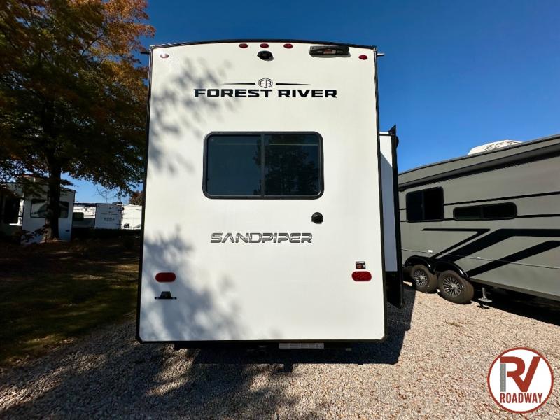 You will find the perfect balance of size, space, features, and luxury with any one of these Forest River Sandpiper fifth wheels! They have a cambered powder coated frame with rust prohibitor, and a fully enclosed underbelly for added protection against the elements. Also, the power front jacks with spring-loaded pins enhance the convenience, speed, and safety. The large, tinted windows come with a 80/20 UV prohibitors. Some hassle-free amenities include a 60k BTU on-demand water heater, porcelain foot flush toilet(s), tire pressure monitor system, and an electric leveling system! Inside, you'll enjoy stainless steel kitchen package, solid surface kitchen countertops, Beachside Sundance Congoleum linoleum, recessed residential lighting, and many more comforts!