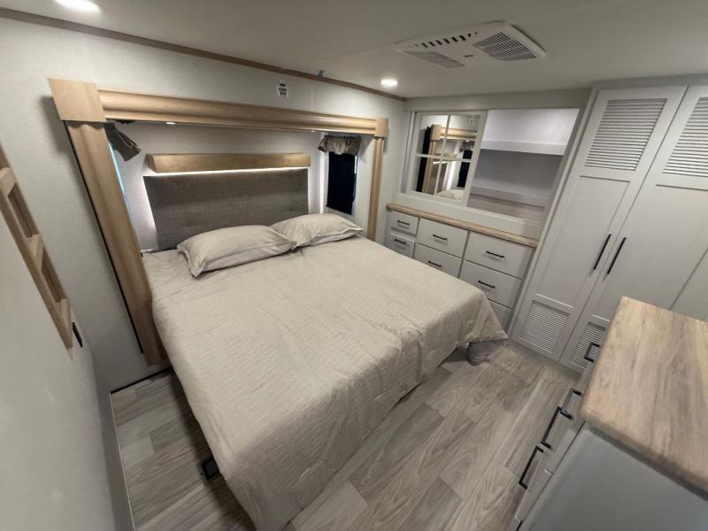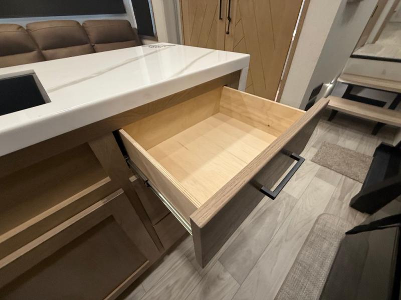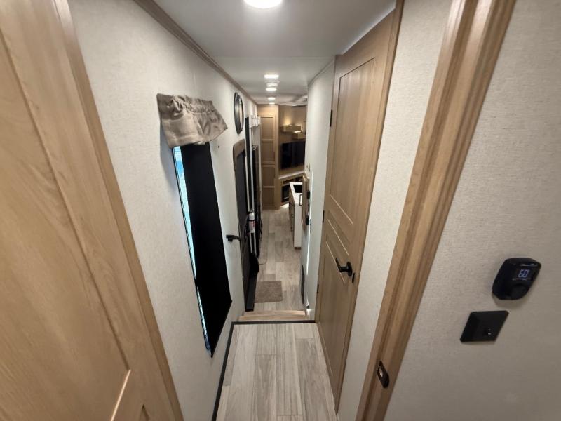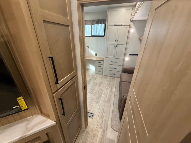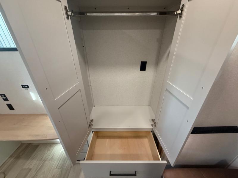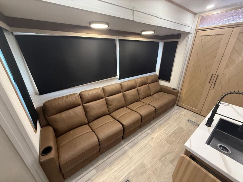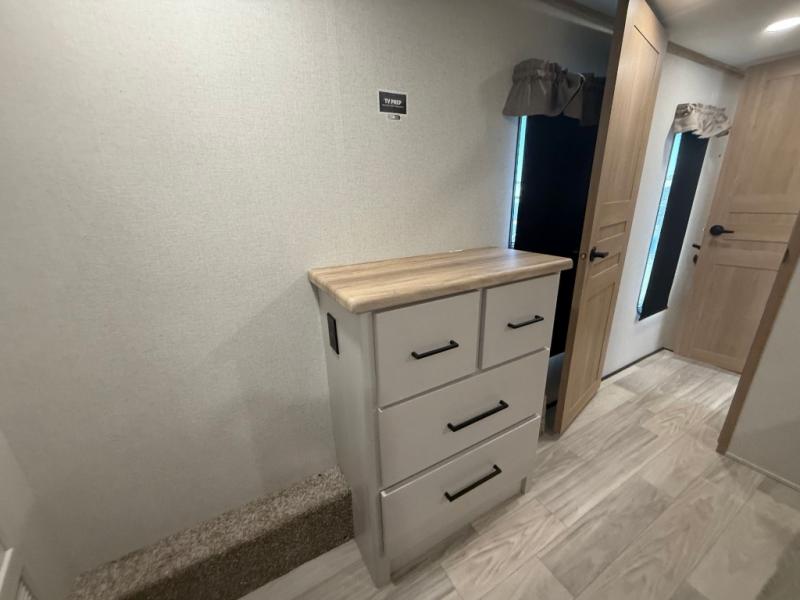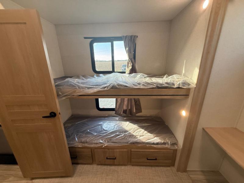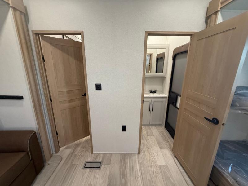 This spacious fifth wheel is designed for comfort and functionality from front to back. The front bedroom offers a king-size 72" x 80" bed, a dresser, and a wardrobe with shelves for all your storage needs. Adjacent to the bedroom is a full bathroom featuring a one-piece fiberglass shower, linen shelves, overhead cabinet, and a medicine cabinet. In the center, the main living area includes a large sofa in the expansive slide-out, perfect for relaxing or gathering, along with a kitchen island, a 3-burner range, a 16-cu. ft. refrigerator, and a butler pantry for added storage. At the rear, the bunkhouse provides generous sleeping space with two 32" x 74" bunks and a table on one side, a flip-up bunk and tri-fold sofa on the other, plus a built-in desk and wardrobe. This space also features its own half bath and a second entry door for added convenience.