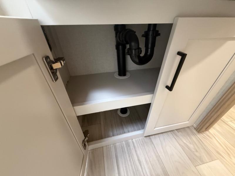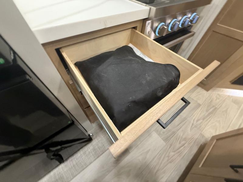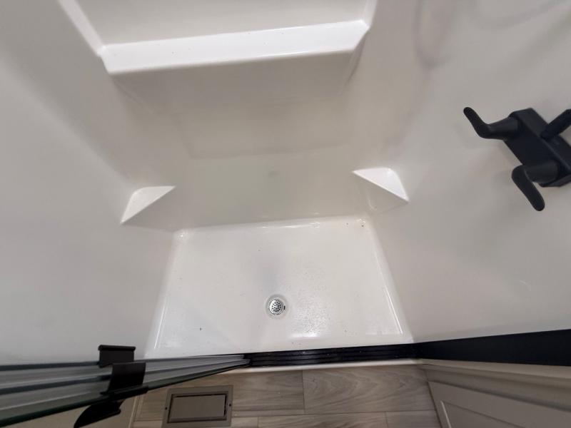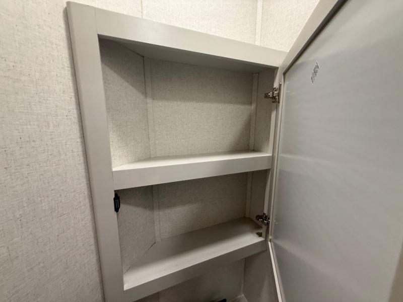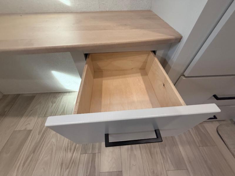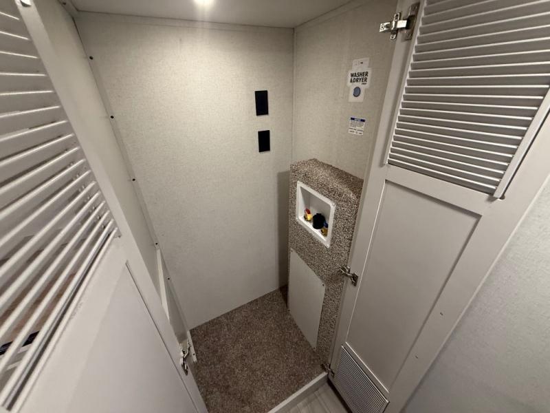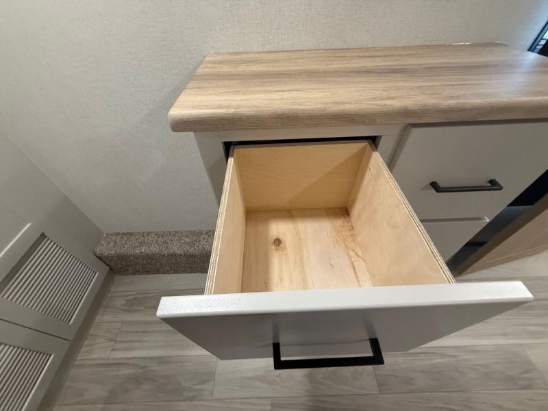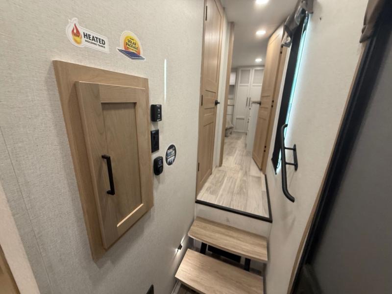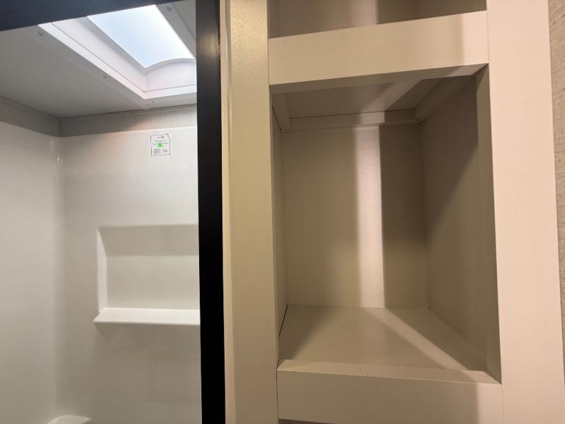 This spacious fifth wheel is designed for comfort and functionality from front to back. The front bedroom offers a king-size 72" x 80" bed, a dresser, and a wardrobe with shelves for all your storage needs. Adjacent to the bedroom is a full bathroom featuring a one-piece fiberglass shower, linen shelves, overhead cabinet, and a medicine cabinet. In the center, the main living area includes a large sofa in the expansive slide-out, perfect for relaxing or gathering, along with a kitchen island, a 3-burner range, a 16-cu. ft. refrigerator, and a butler pantry for added storage. At the rear, the bunkhouse provides generous sleeping space with two 32" x 74" bunks and a table on one side, a flip-up bunk and tri-fold sofa on the other, plus a built-in desk and wardrobe. This space also features its own half bath and a second entry door for added convenience.