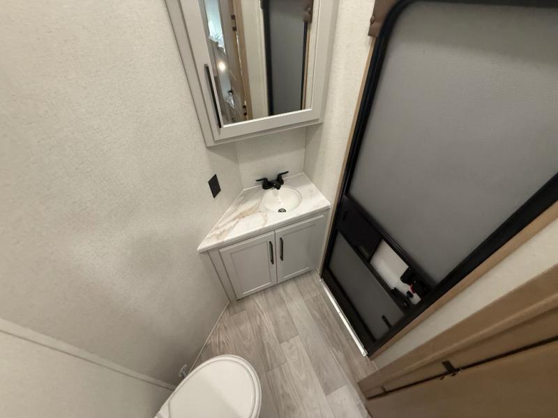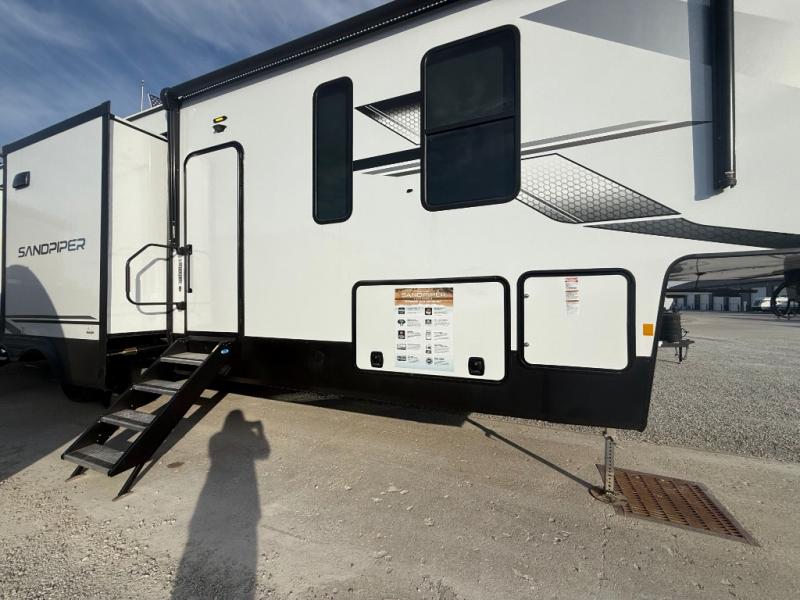 You will find the perfect balance of size, space, features, and luxury with any one of these Forest River Sandpiper fifth wheels! They have a cambered powder coated frame with rust prohibitor, and a fully enclosed underbelly for added protection against the elements. Also, the power front jacks with spring-loaded pins enhance the convenience, speed, and safety. The large, tinted windows come with a 80/20 UV prohibitors. Some hassle-free amenities include a 60k BTU on-demand water heater, porcelain foot flush toilet(s), tire pressure monitor system, and an electric leveling system! Inside, you'll enjoy stainless steel kitchen package, solid surface kitchen countertops, Beachside Sundance Congoleum linoleum, recessed residential lighting, and many more comforts!