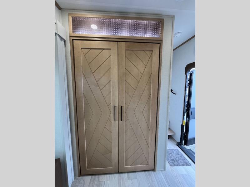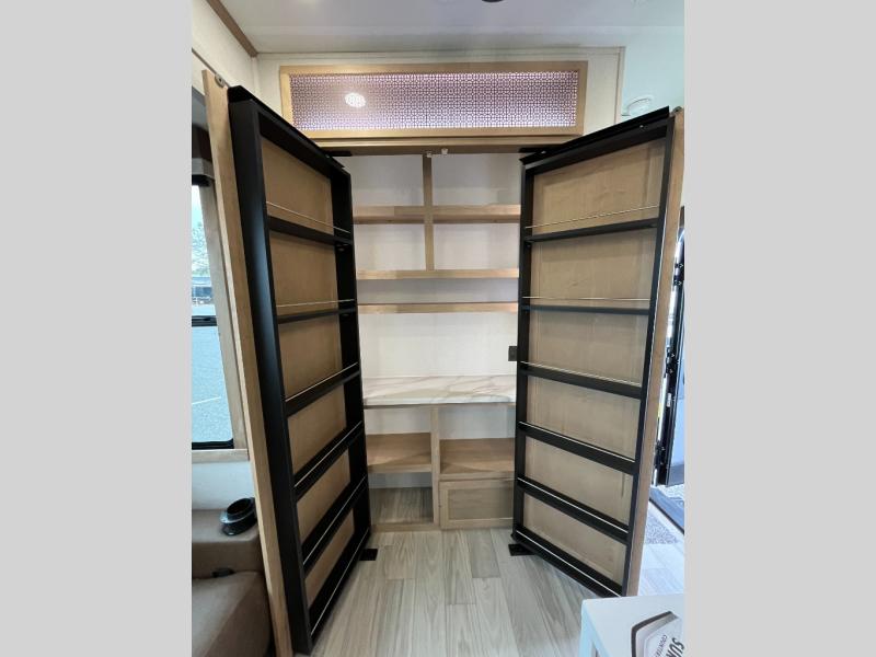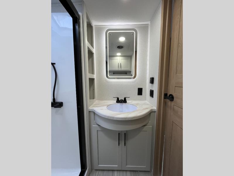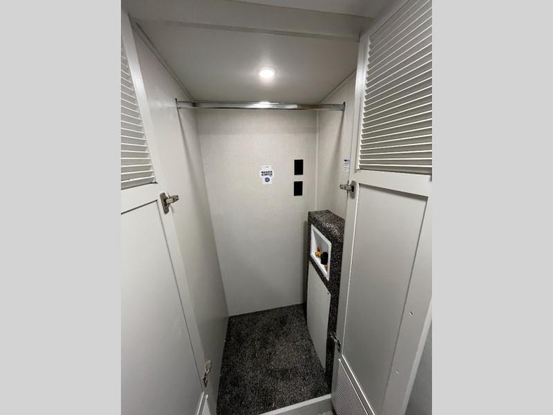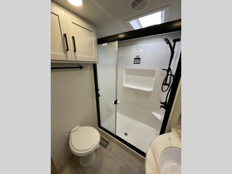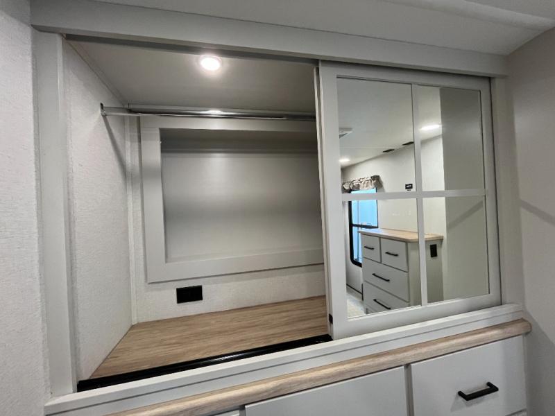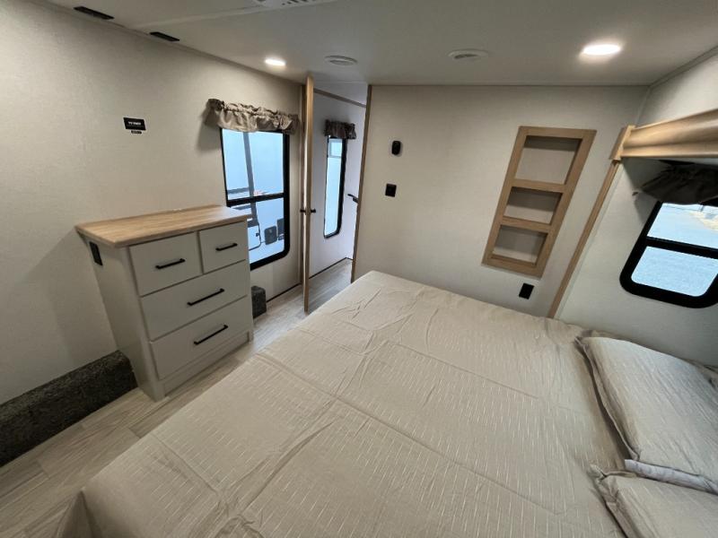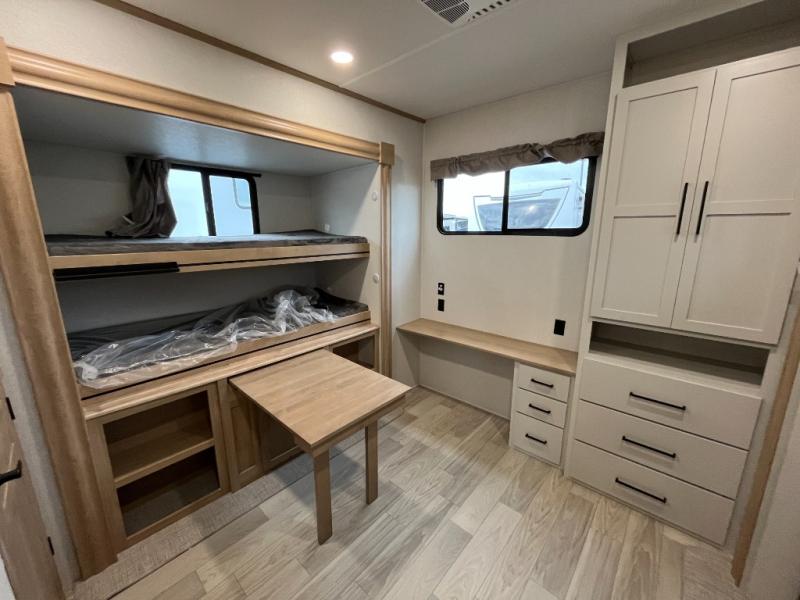 This spacious fifth wheel is designed for comfort and functionality from front to back. The front bedroom offers a king-size 72" x 80" bed, a dresser, and a wardrobe with shelves for all your storage needs. Adjacent to the bedroom is a full bathroom featuring a one-piece fiberglass shower, linen shelves, overhead cabinet, and a medicine cabinet. In the center, the main living area includes a large sofa in the expansive slide-out, perfect for relaxing or gathering, along with a kitchen island, a 3-burner range, a 16-cu. ft. refrigerator, and a butler pantry for added storage. At the rear, the bunkhouse provides generous sleeping space with two 32" x 74" bunks and a table on one side, a flip-up bunk and tri-fold sofa on the other, plus a built-in desk and wardrobe. This space also features its own half bath and a second entry door for added convenience.