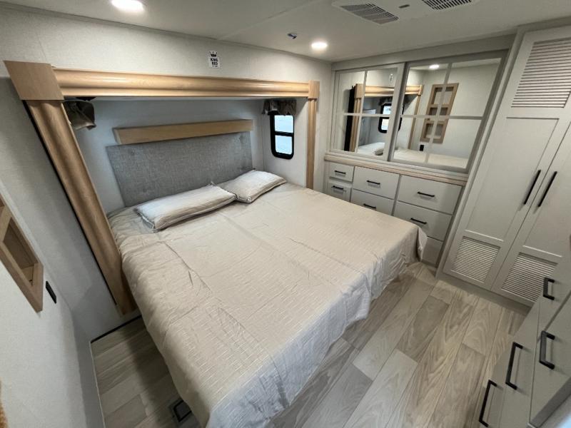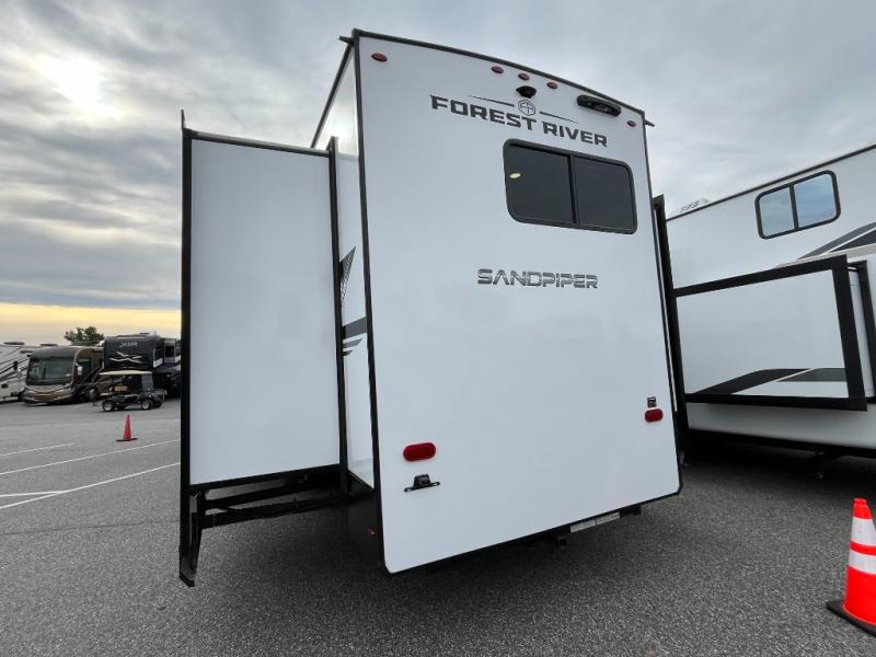 You will find the perfect balance of size, space, features, and luxury with any one of these Forest River Sandpiper fifth wheels! They have a cambered powder coated frame with rust prohibitor, and a fully enclosed underbelly for added protection against the elements. Also, the power front jacks with spring-loaded pins enhance the convenience, speed, and safety. The large, tinted windows come with a 80/20 UV prohibitors. Some hassle-free amenities include a 60k BTU on-demand water heater, porcelain foot flush toilet(s), tire pressure monitor system, and an electric leveling system! Inside, you'll enjoy stainless steel kitchen package, solid surface kitchen countertops, Beachside Sundance Congoleum linoleum, recessed residential lighting, and many more comforts!
