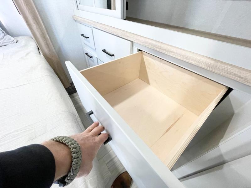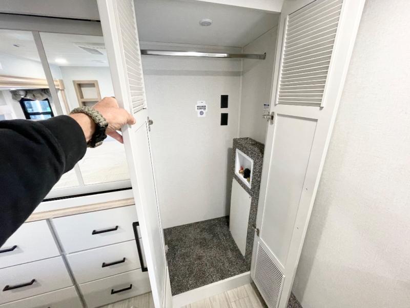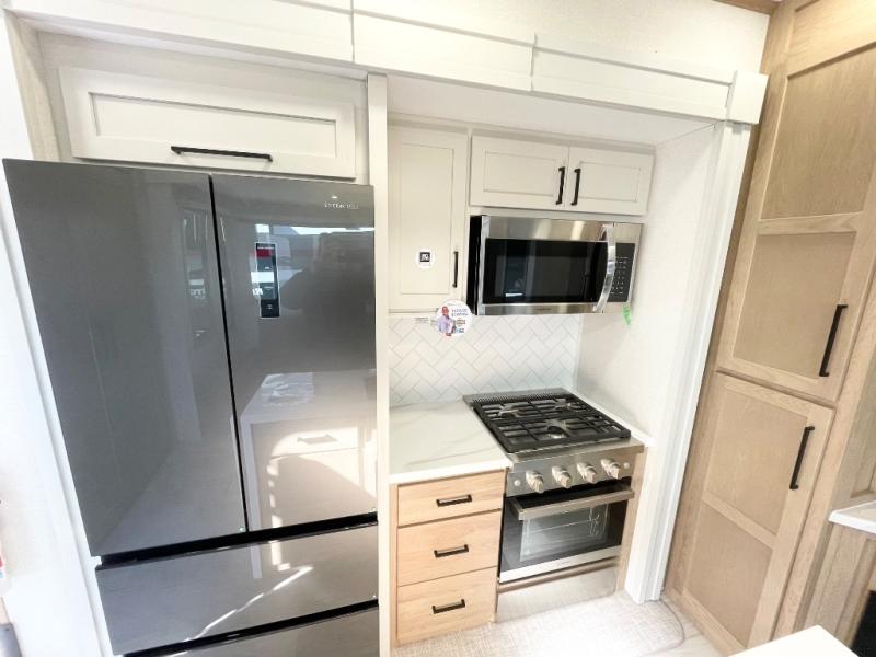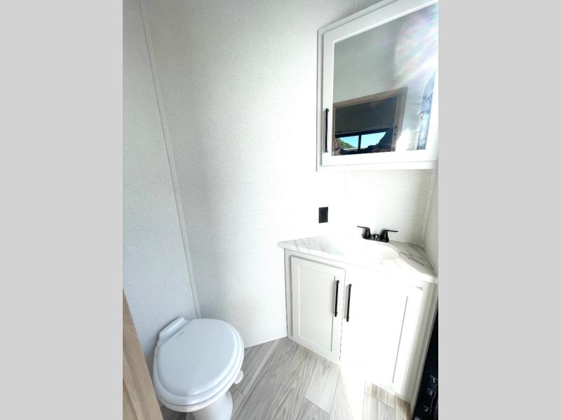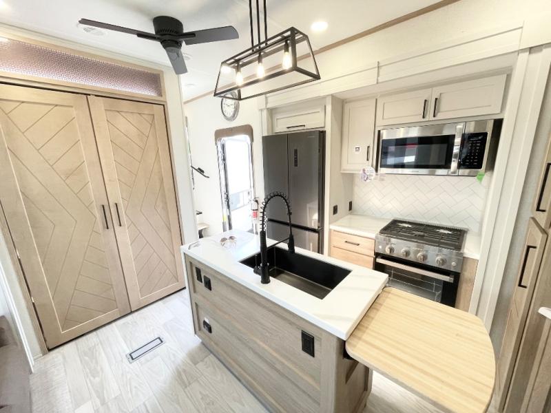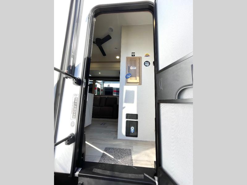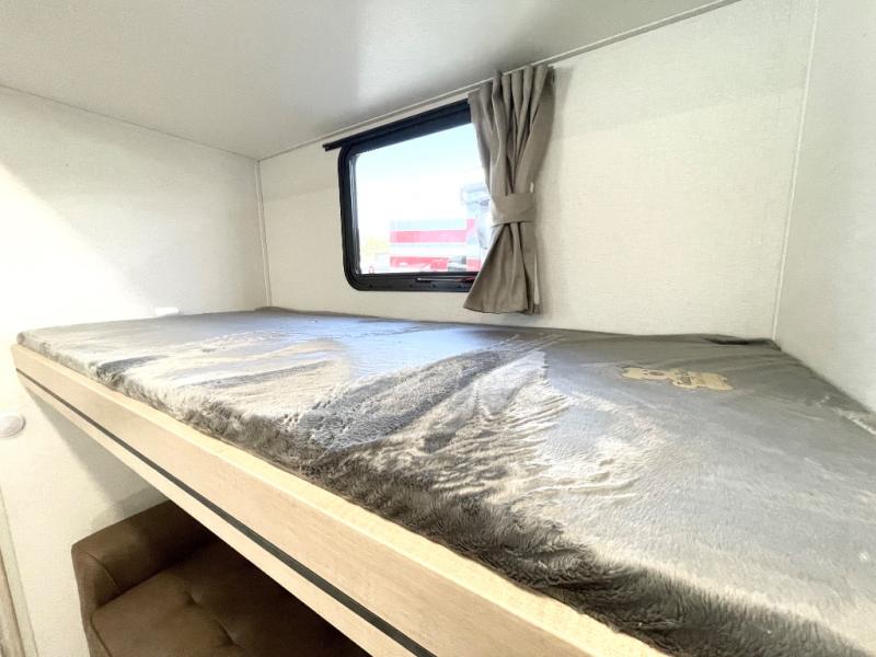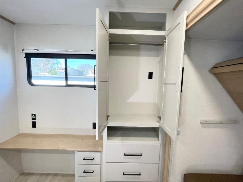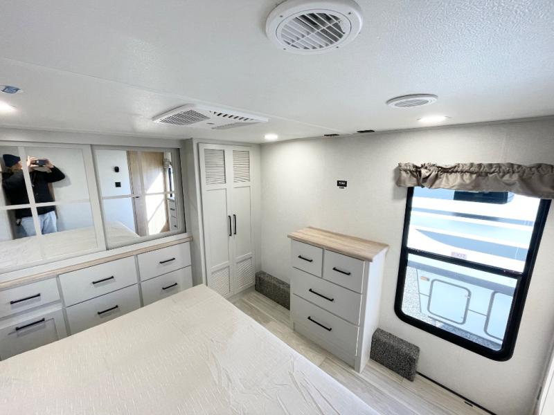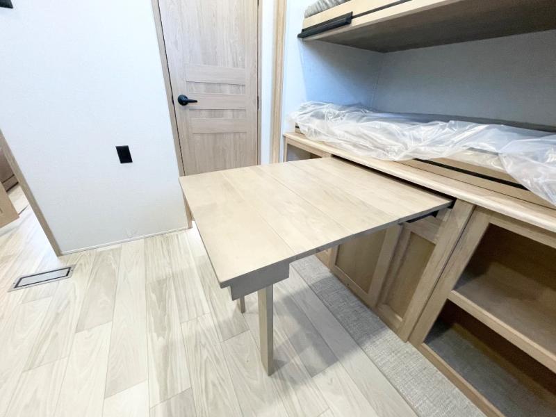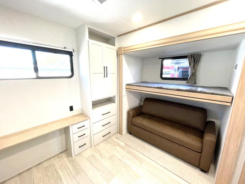 This spacious fifth wheel is designed for comfort and functionality from front to back. The front bedroom offers a king-size 72" x 80" bed, a dresser, and a wardrobe with shelves for all your storage needs. Adjacent to the bedroom is a full bathroom featuring a one-piece fiberglass shower, linen shelves, overhead cabinet, and a medicine cabinet. In the center, the main living area includes a large sofa in the expansive slide-out, perfect for relaxing or gathering, along with a kitchen island, a 3-burner range, a 16-cu. ft. refrigerator, and a butler pantry for added storage. At the rear, the bunkhouse provides generous sleeping space with two 32" x 74" bunks and a table on one side, a flip-up bunk and tri-fold sofa on the other, plus a built-in desk and wardrobe. This space also features its own half bath and a second entry door for added convenience.