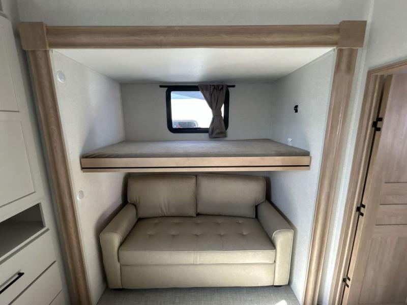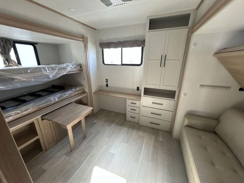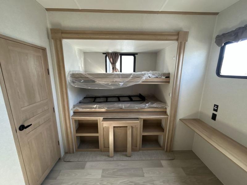 This spacious fifth wheel is designed for comfort and functionality from front to back. The front bedroom offers a king-size 72" x 80" bed, a dresser, and a wardrobe with shelves for all your storage needs. Adjacent to the bedroom is a full bathroom featuring a one-piece fiberglass shower, linen shelves, overhead cabinet, and a medicine cabinet. In the center, the main living area includes a large sofa in the expansive slide-out, perfect for relaxing or gathering, along with a kitchen island, a 3-burner range, a 16-cu. ft. refrigerator, and a butler pantry for added storage. At the rear, the bunkhouse provides generous sleeping space with two 32" x 74" bunks and a table on one side, a flip-up bunk and tri-fold sofa on the other, plus a built-in desk and wardrobe. This space also features its own half bath and a second entry door for added convenience.