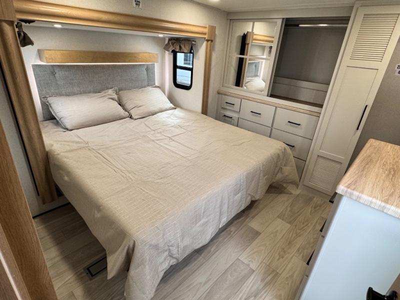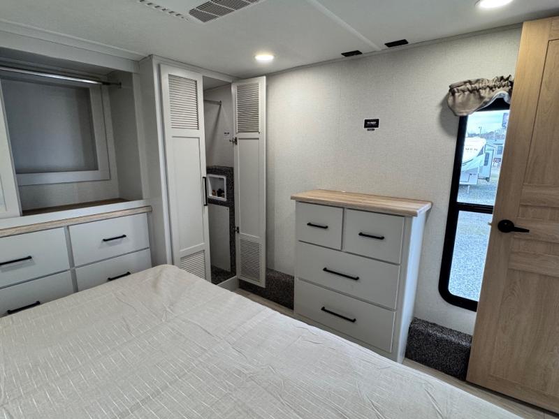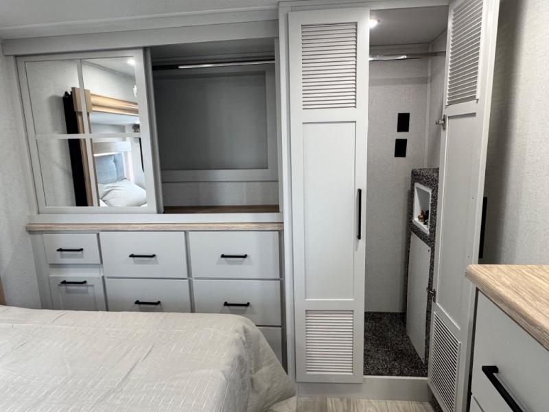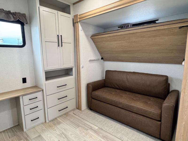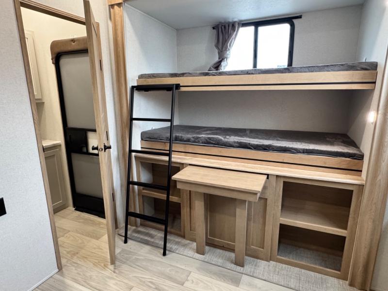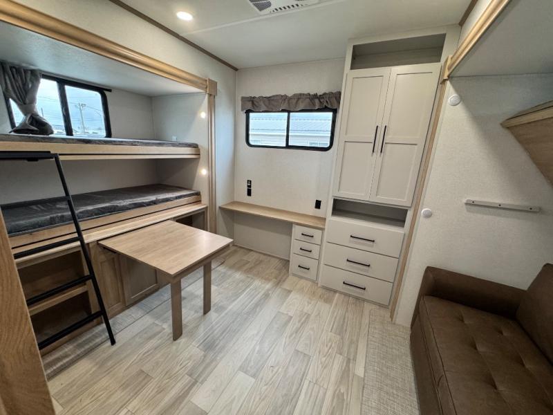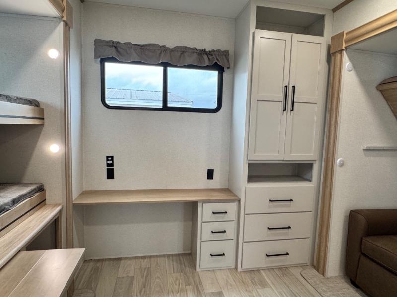 This spacious fifth wheel is designed for comfort and functionality from front to back. The front bedroom offers a king-size 72" x 80" bed, a dresser, and a wardrobe with shelves for all your storage needs. Adjacent to the bedroom is a full bathroom featuring a one-piece fiberglass shower, linen shelves, overhead cabinet, and a medicine cabinet. In the center, the main living area includes a large sofa in the expansive slide-out, perfect for relaxing or gathering, along with a kitchen island, a 3-burner range, a 16-cu. ft. refrigerator, and a butler pantry for added storage. At the rear, the bunkhouse provides generous sleeping space with two 32" x 74" bunks and a table on one side, a flip-up bunk and tri-fold sofa on the other, plus a built-in desk and wardrobe. This space also features its own half bath and a second entry door for added convenience.