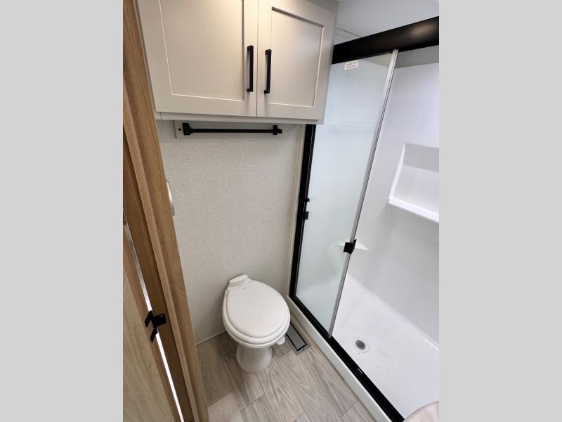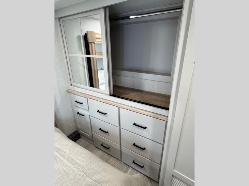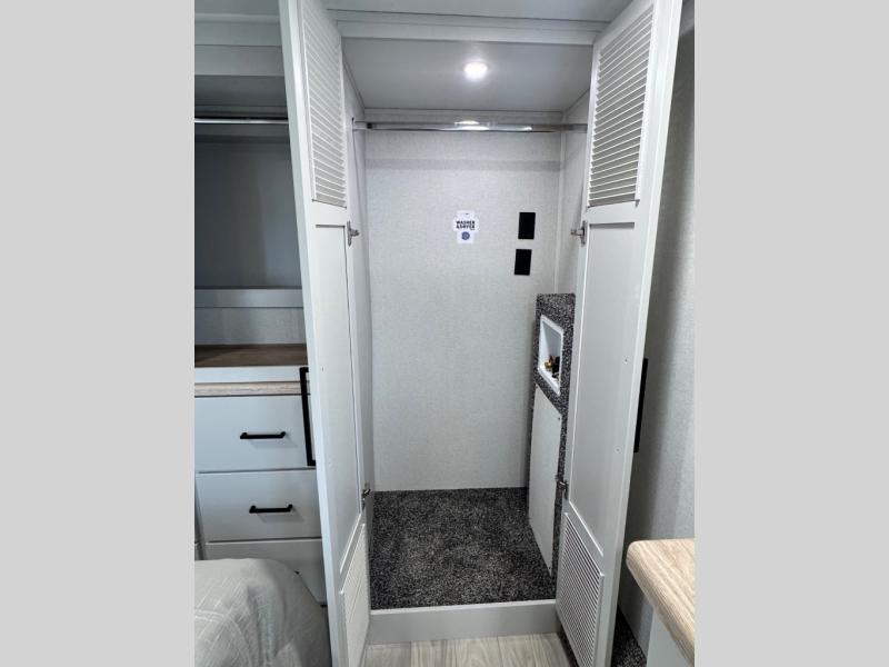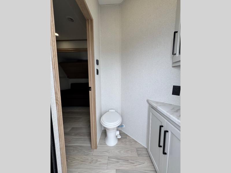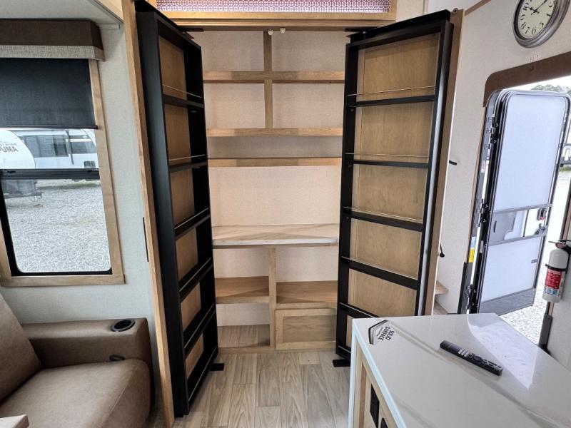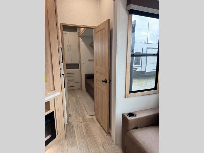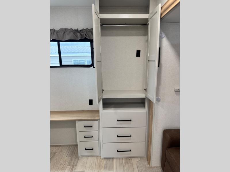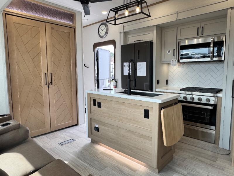 This spacious fifth wheel is designed for comfort and functionality from front to back. The front bedroom offers a king-size 72" x 80" bed, a dresser, and a wardrobe with shelves for all your storage needs. Adjacent to the bedroom is a full bathroom featuring a one-piece fiberglass shower, linen shelves, overhead cabinet, and a medicine cabinet. In the center, the main living area includes a large sofa in the expansive slide-out, perfect for relaxing or gathering, along with a kitchen island, a 3-burner range, a 16-cu. ft. refrigerator, and a butler pantry for added storage. At the rear, the bunkhouse provides generous sleeping space with two 32" x 74" bunks and a table on one side, a flip-up bunk and tri-fold sofa on the other, plus a built-in desk and wardrobe. This space also features its own half bath and a second entry door for added convenience.