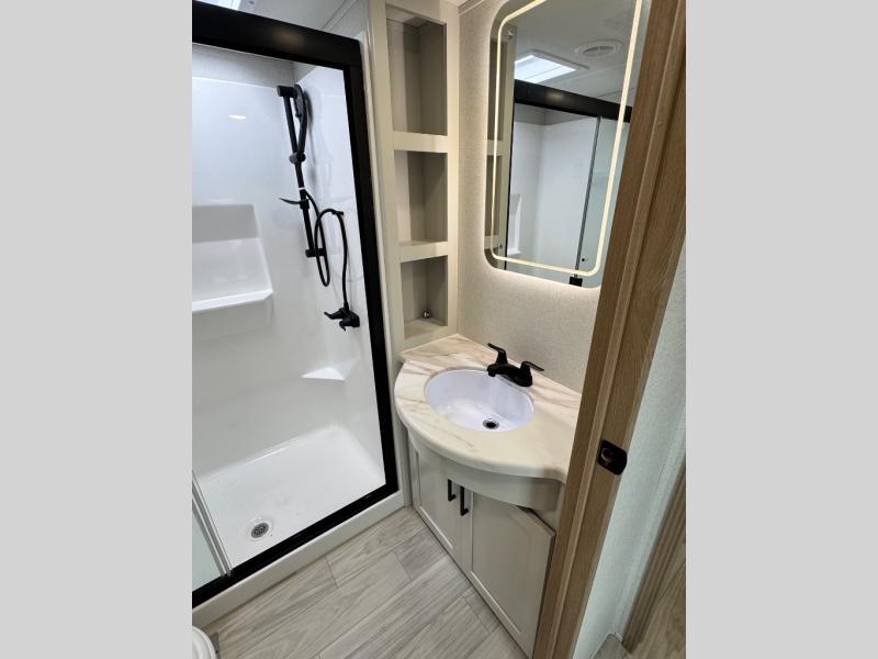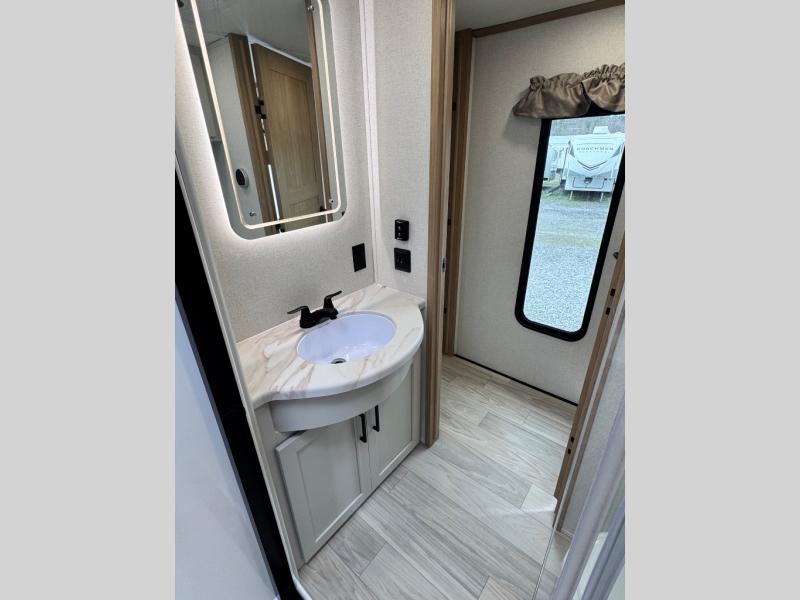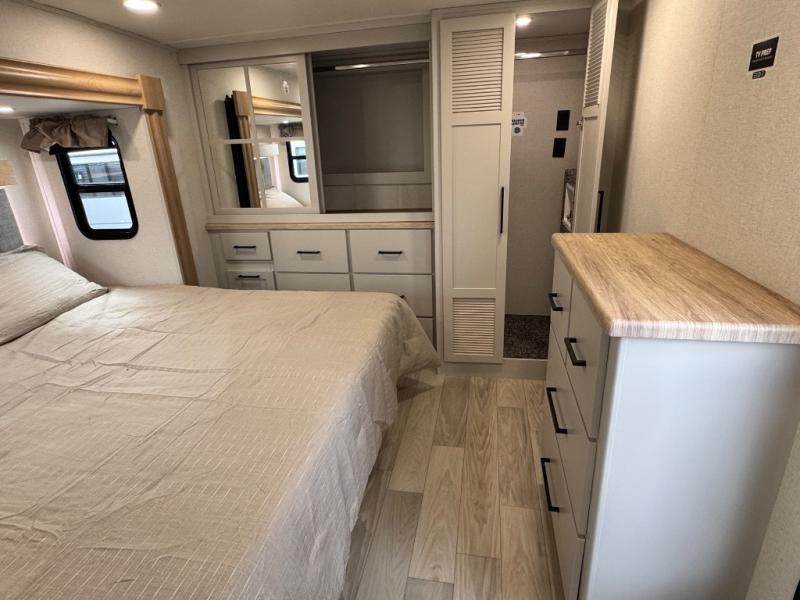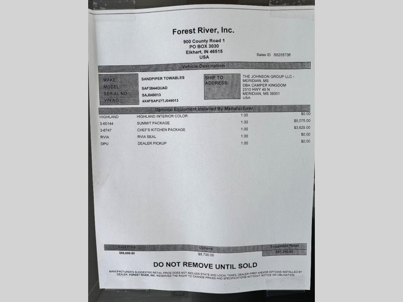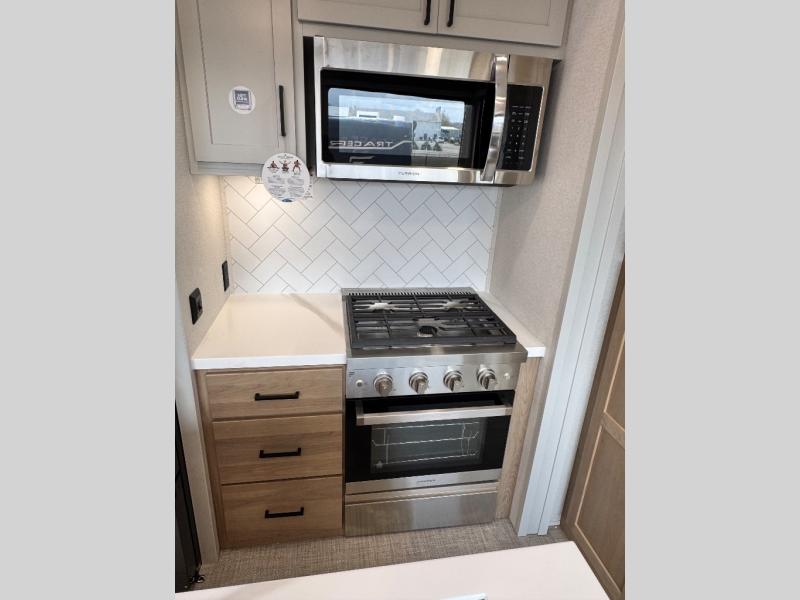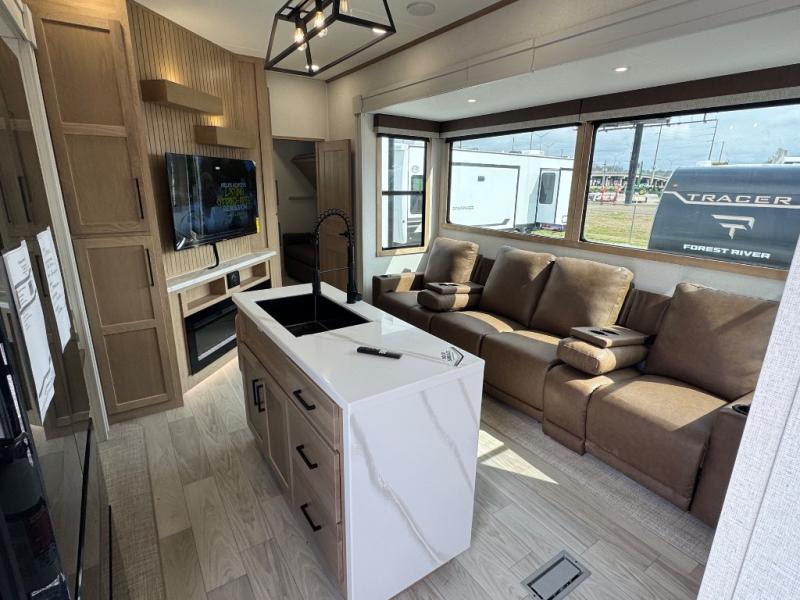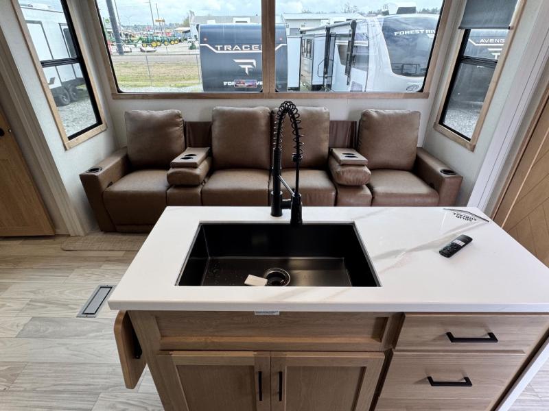 You will find the perfect balance of size, space, features, and luxury with any one of these Forest River Sandpiper fifth wheels! They have a cambered powder coated frame with rust prohibitor, and a fully enclosed underbelly for added protection against the elements. Also, the power front jacks with spring-loaded pins enhance the convenience, speed, and safety. The large, tinted windows come with a 80/20 UV prohibitors. Some hassle-free amenities include a 60k BTU on-demand water heater, porcelain foot flush toilet(s), tire pressure monitor system, and an electric leveling system! Inside, you'll enjoy stainless steel kitchen package, solid surface kitchen countertops, Beachside Sundance Congoleum linoleum, recessed residential lighting, and many more comforts!
