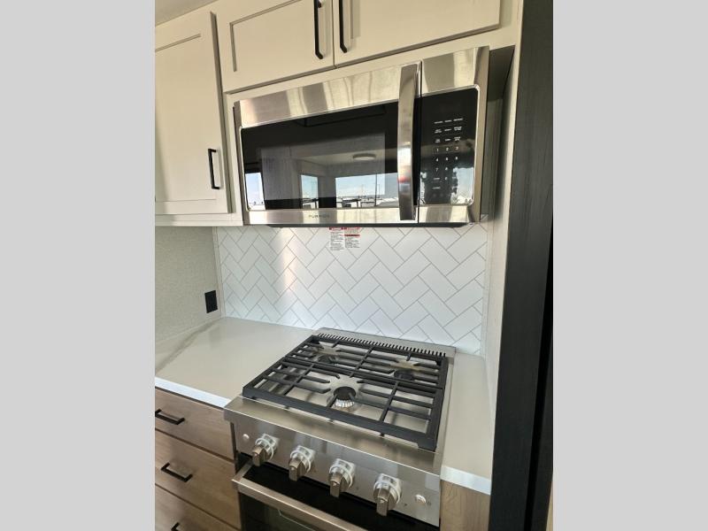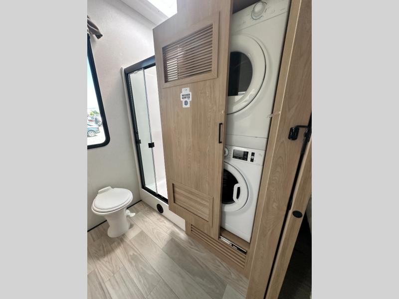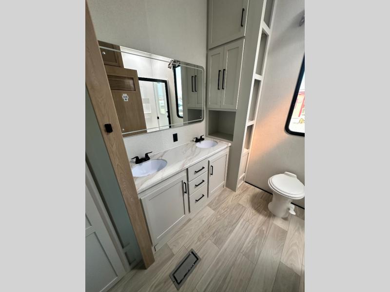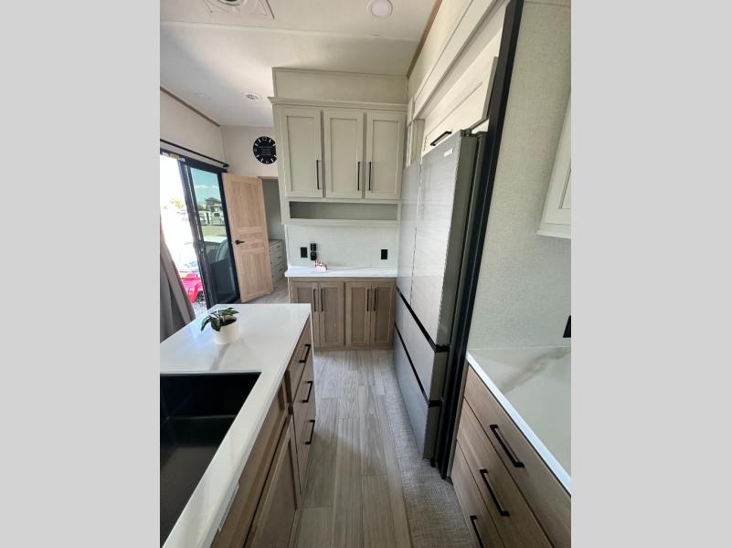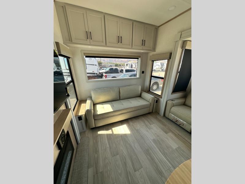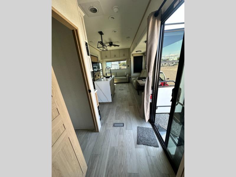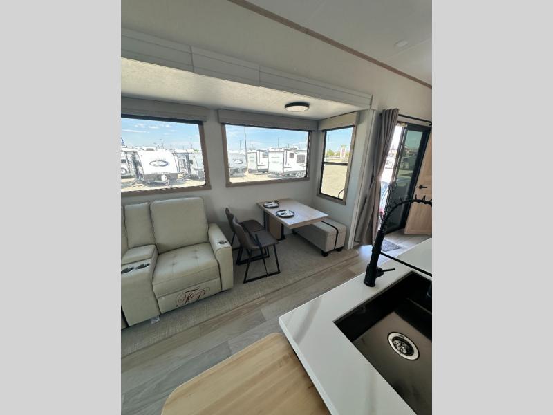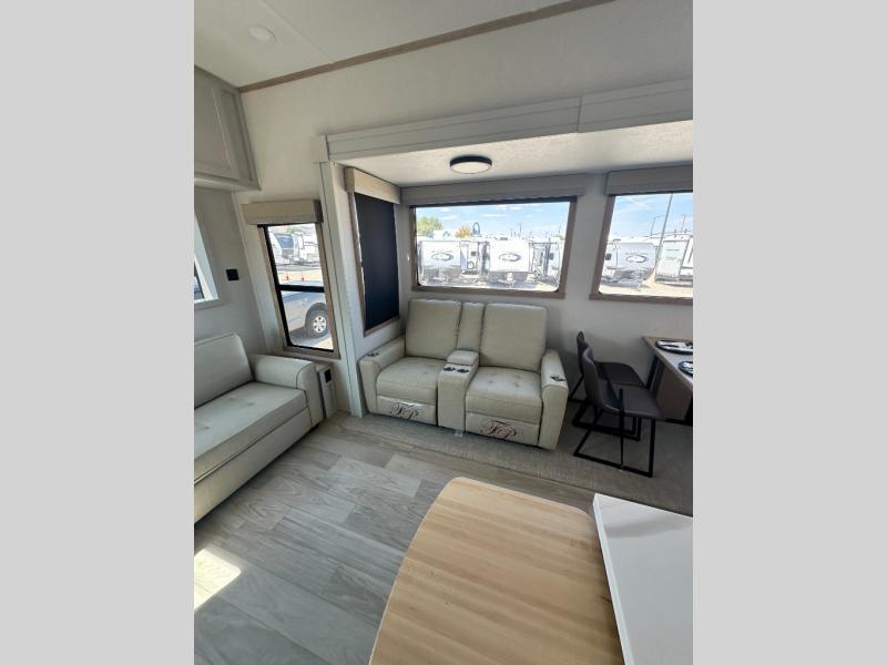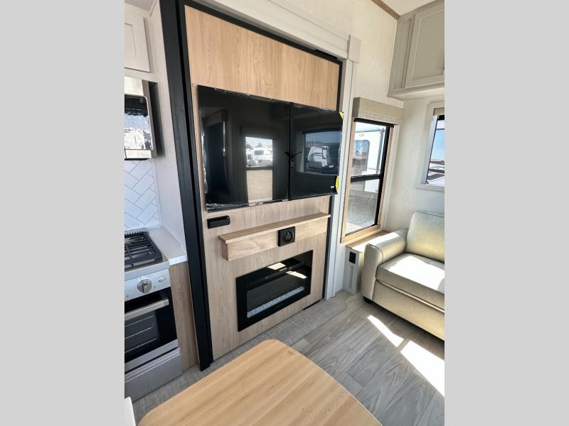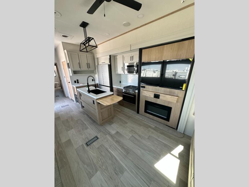 The 2026 Sandpiper Destination Trailer 389HBFL is a luxurious, residential-style retreat designed for extended stays and family comfort. This unique front living floorplan features a spacious living area with dual tri-fold sofas, theater seating, and a large entertainment center with a fireplace, creating a cozy space for relaxing or entertaining. The center kitchen is equipped with residential appliances, a large island, pantry, and premium finishes, making meal prep a breeze. A private bunk room with its own half bath offers the perfect space for guests or kids, while the rear master suite provides a peaceful escape with a king bed, wardrobe storage, washer/dryer prep, and a full bath just steps away. With high ceilings, large windows, and upscale amenities throughout, the 389HBFL combines all the comforts of home with the beauty of your favorite destination.