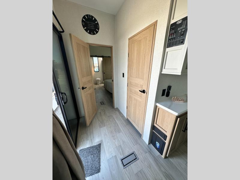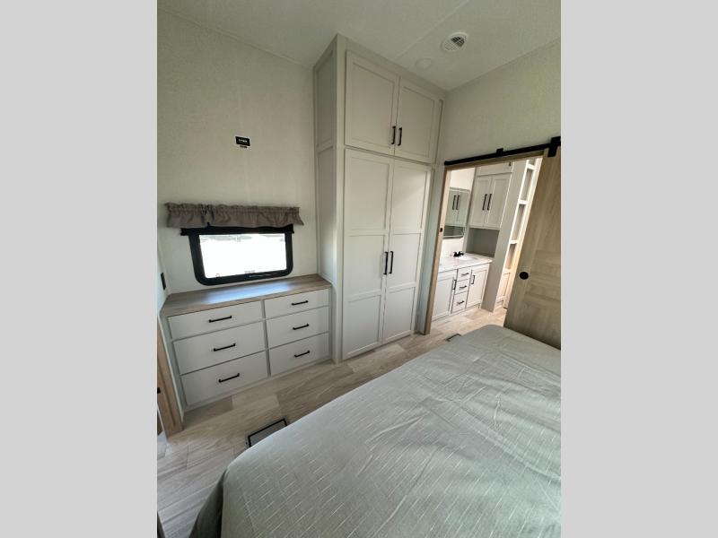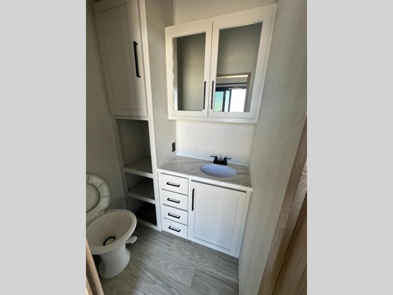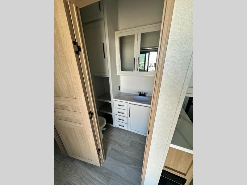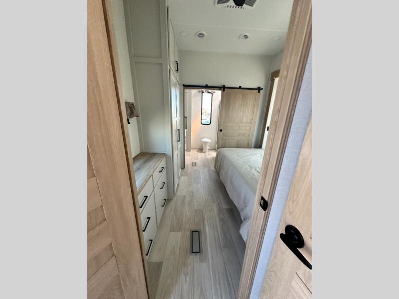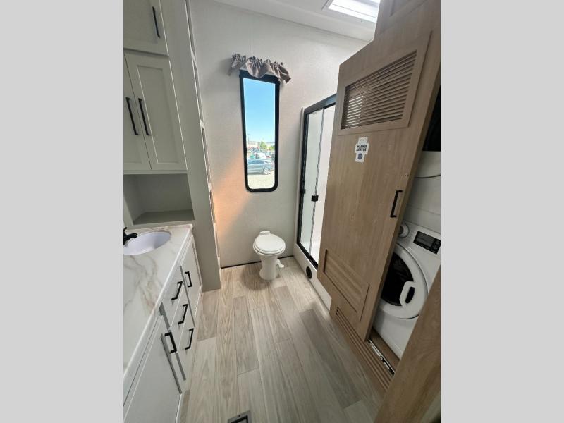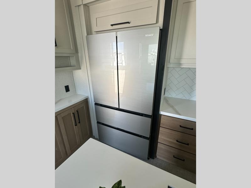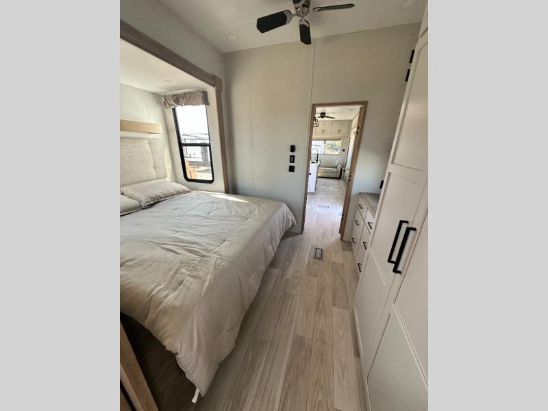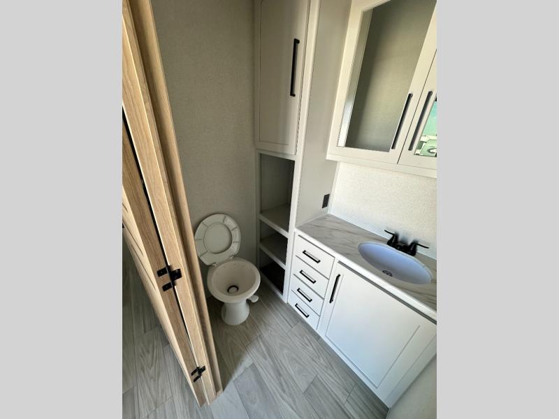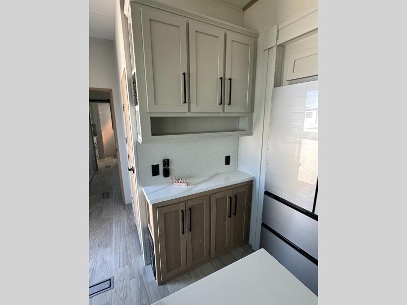 The 2026 Sandpiper Destination Trailer 389HBFL is a luxurious, residential-style retreat designed for extended stays and family comfort. This unique front living floorplan features a spacious living area with dual tri-fold sofas, theater seating, and a large entertainment center with a fireplace, creating a cozy space for relaxing or entertaining. The center kitchen is equipped with residential appliances, a large island, pantry, and premium finishes, making meal prep a breeze. A private bunk room with its own half bath offers the perfect space for guests or kids, while the rear master suite provides a peaceful escape with a king bed, wardrobe storage, washer/dryer prep, and a full bath just steps away. With high ceilings, large windows, and upscale amenities throughout, the 389HBFL combines all the comforts of home with the beauty of your favorite destination.