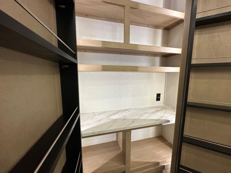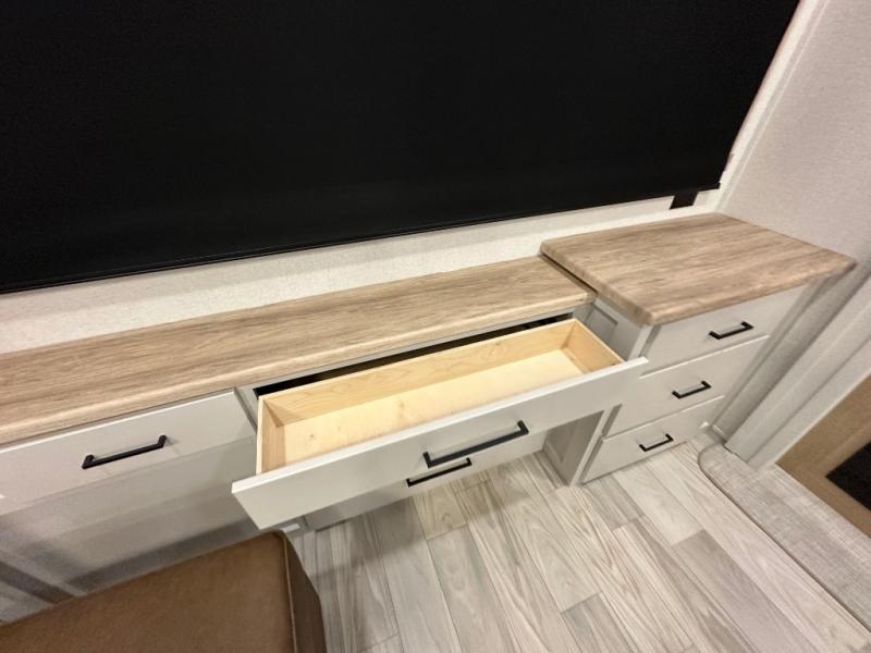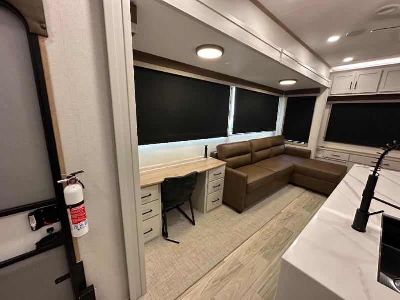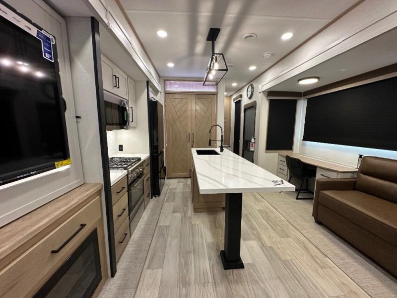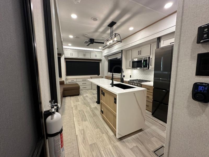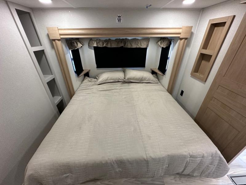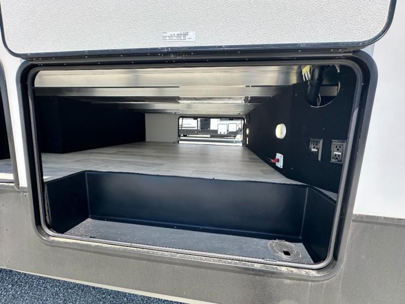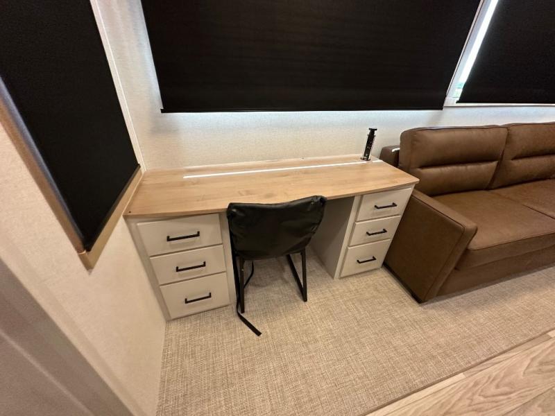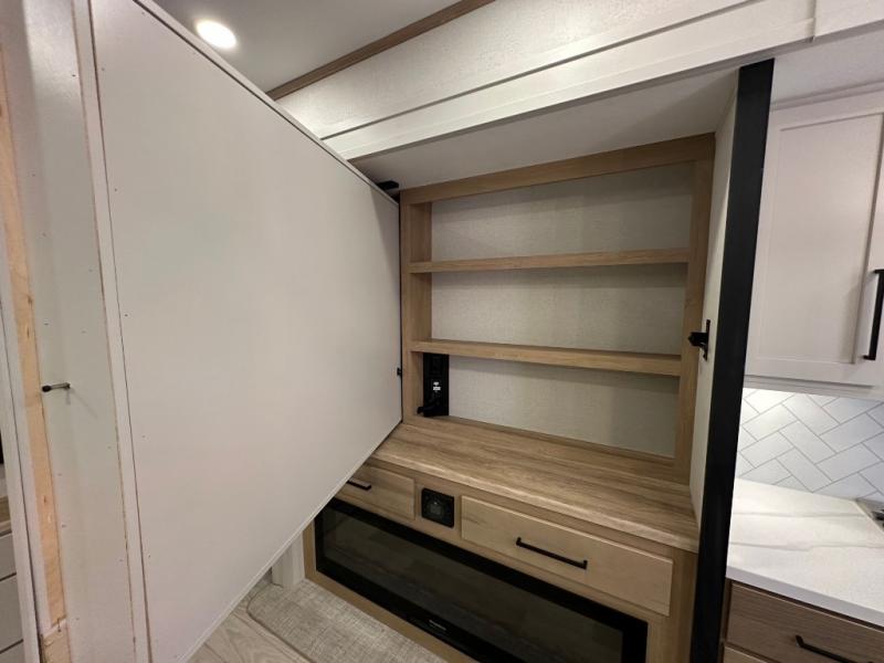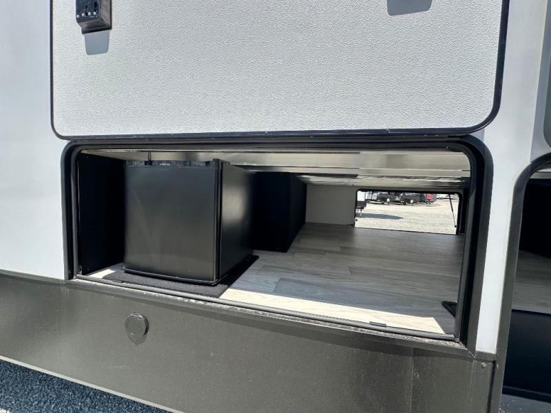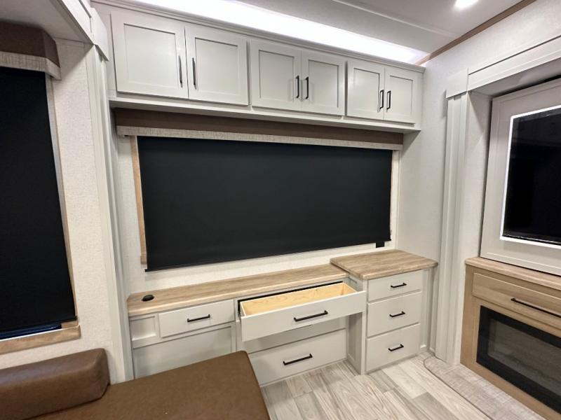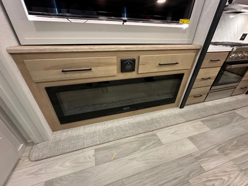 It will be easier than ever to enjoy camping trips in this triple slide out fifth wheel, or even go full-time! The combined kitchen and living area features dual opposing slides for ample space, an L-shaped sofa with a chaise lounge, and a fireplace with a hidden pantry behind for snacks! A desk with a chair and a USB port will provide a place to work if you need to send some emails, and the large kitchen island will give you ample room to prep dinner when you get hungry. There are also pendant lights here, along with a waterfall edge and barstools for dining space. The mid-coach half bath includes a toilet, sink, plus washer and dryer prep, giving you the option to make this the perfect laundry room! The master bedroom up front may be your favorite place to unwind in this unit. There is a king bed slide, a small dresser plus a tall dresser, and a TV hookup if you want the option to watch movies in bed. And you'll be wowed by the front master bedroom with its fiberglass shower with a seat, dual bath sinks, and large walk-in closet!