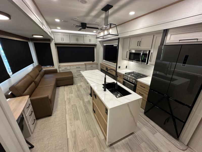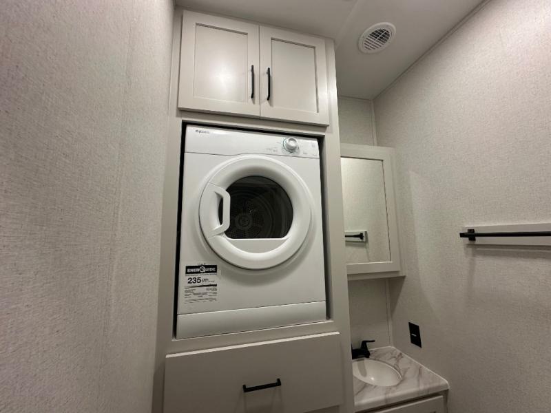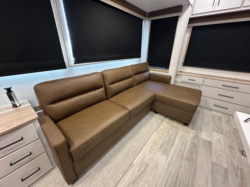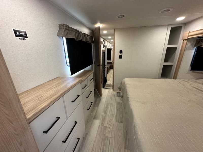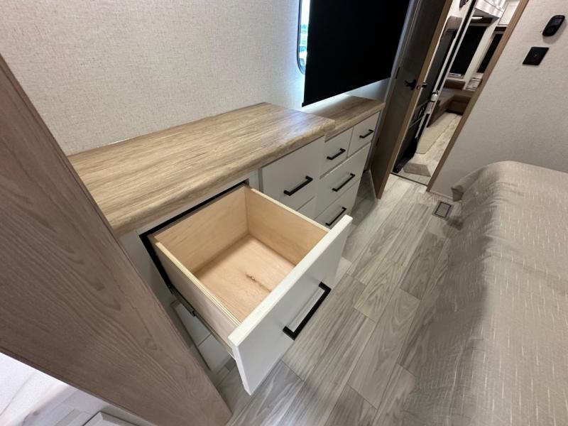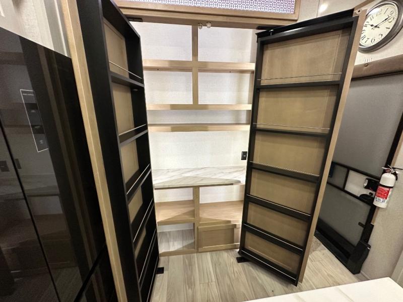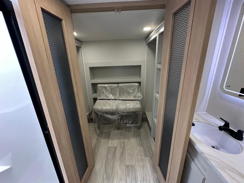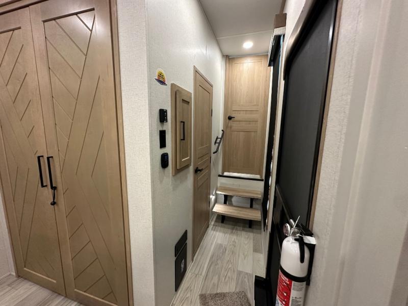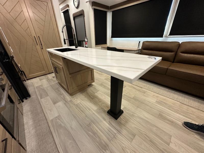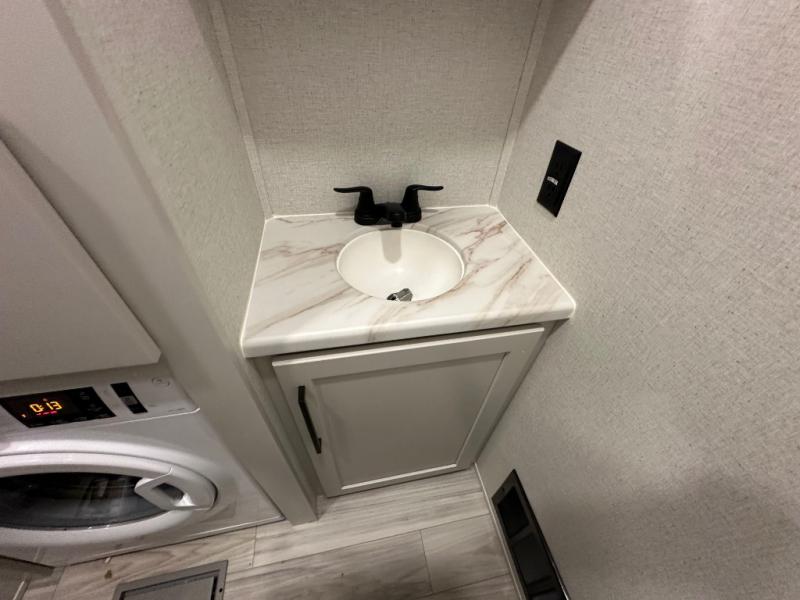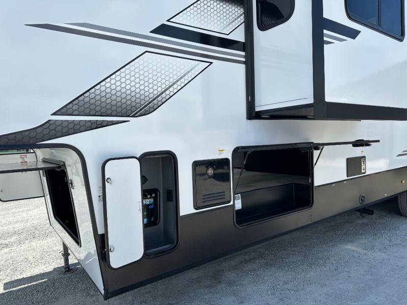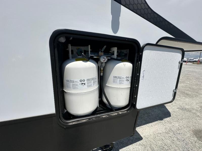 It will be easier than ever to enjoy camping trips in this triple slide out fifth wheel, or even go full-time! The combined kitchen and living area features dual opposing slides for ample space, an L-shaped sofa with a chaise lounge, and a fireplace with a hidden pantry behind for snacks! A desk with a chair and a USB port will provide a place to work if you need to send some emails, and the large kitchen island will give you ample room to prep dinner when you get hungry. There are also pendant lights here, along with a waterfall edge and barstools for dining space. The mid-coach half bath includes a toilet, sink, plus washer and dryer prep, giving you the option to make this the perfect laundry room! The master bedroom up front may be your favorite place to unwind in this unit. There is a king bed slide, a small dresser plus a tall dresser, and a TV hookup if you want the option to watch movies in bed. And you'll be wowed by the front master bedroom with its fiberglass shower with a seat, dual bath sinks, and large walk-in closet!