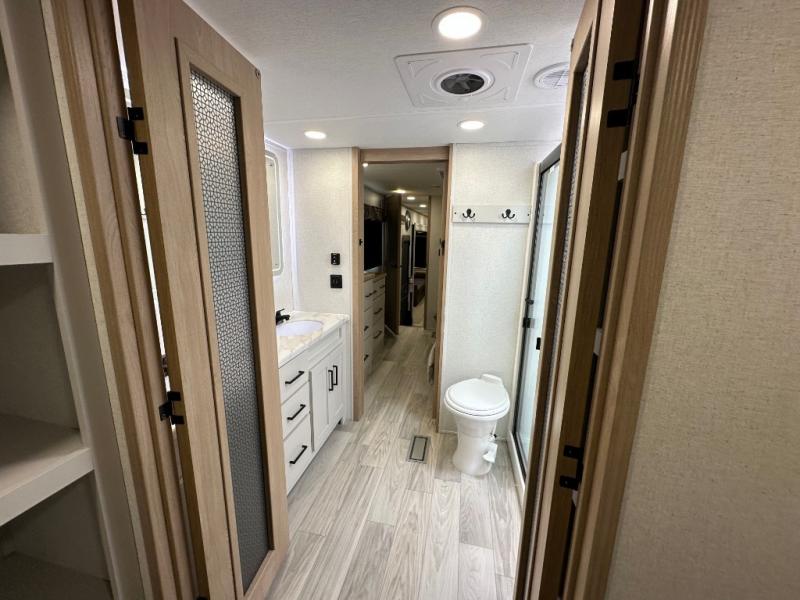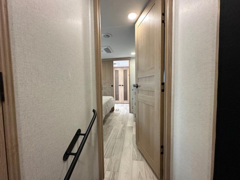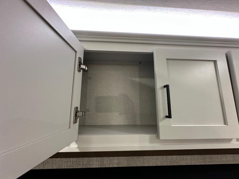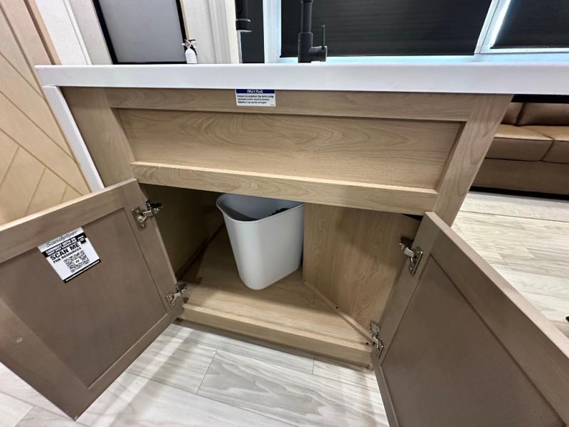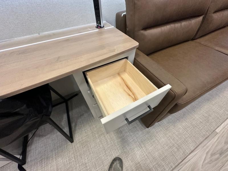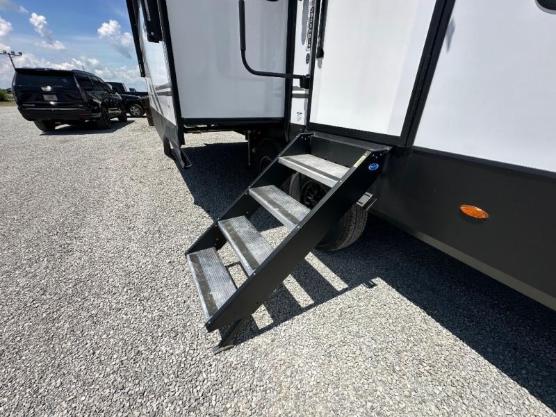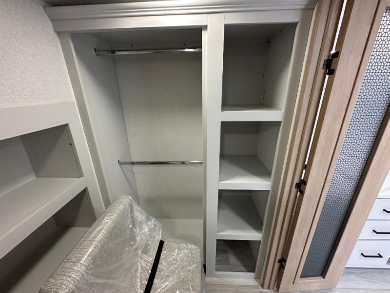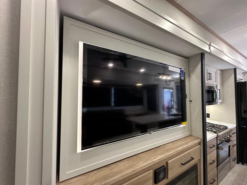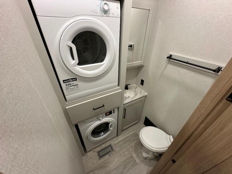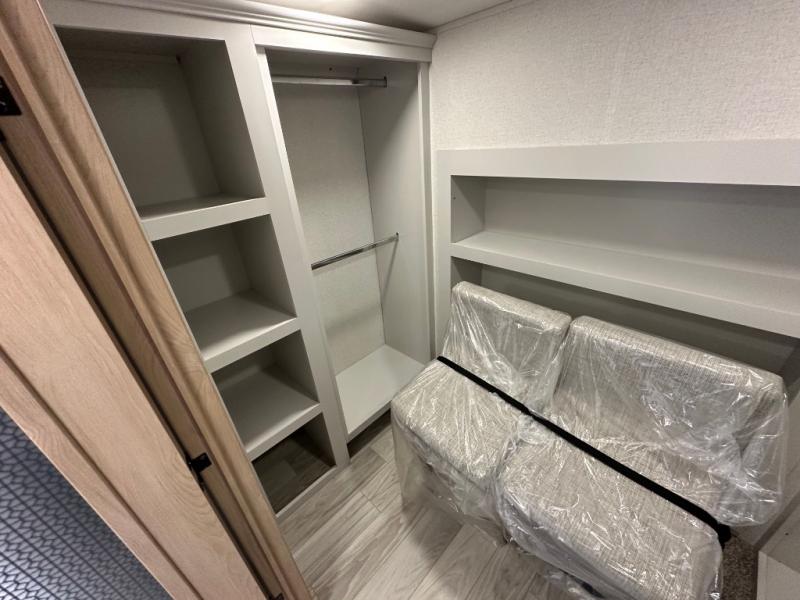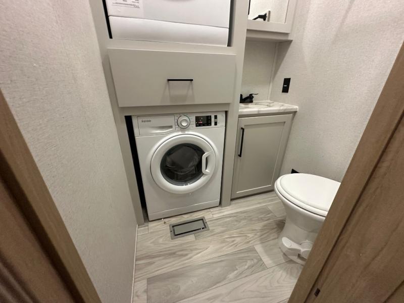 It will be easier than ever to enjoy camping trips in this triple slide out fifth wheel, or even go full-time! The combined kitchen and living area features dual opposing slides for ample space, an L-shaped sofa with a chaise lounge, and a fireplace with a hidden pantry behind for snacks! A desk with a chair and a USB port will provide a place to work if you need to send some emails, and the large kitchen island will give you ample room to prep dinner when you get hungry. There are also pendant lights here, along with a waterfall edge and barstools for dining space. The mid-coach half bath includes a toilet, sink, plus washer and dryer prep, giving you the option to make this the perfect laundry room! The master bedroom up front may be your favorite place to unwind in this unit. There is a king bed slide, a small dresser plus a tall dresser, and a TV hookup if you want the option to watch movies in bed. And you'll be wowed by the front master bedroom with its fiberglass shower with a seat, dual bath sinks, and large walk-in closet!
