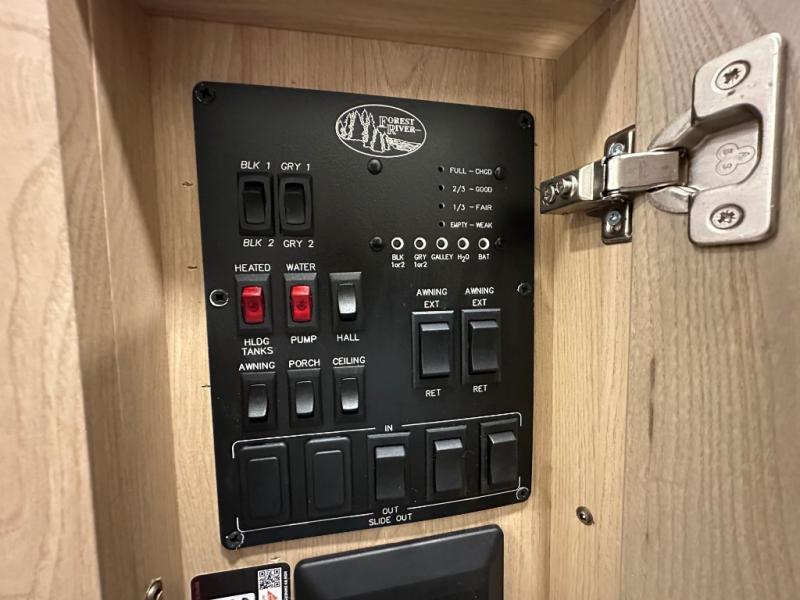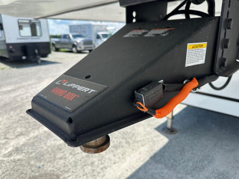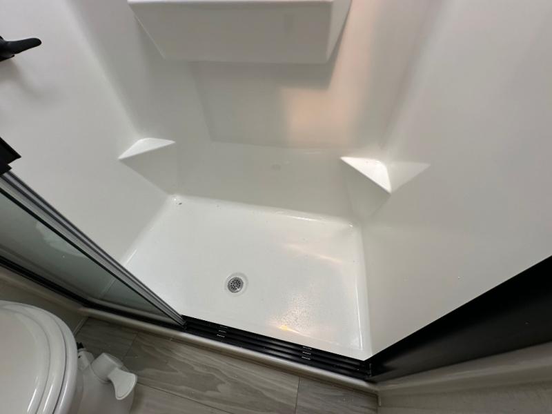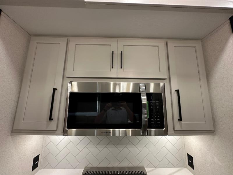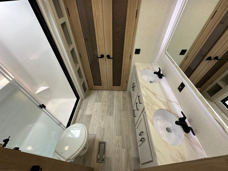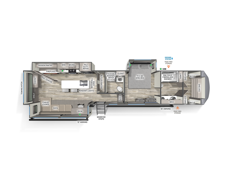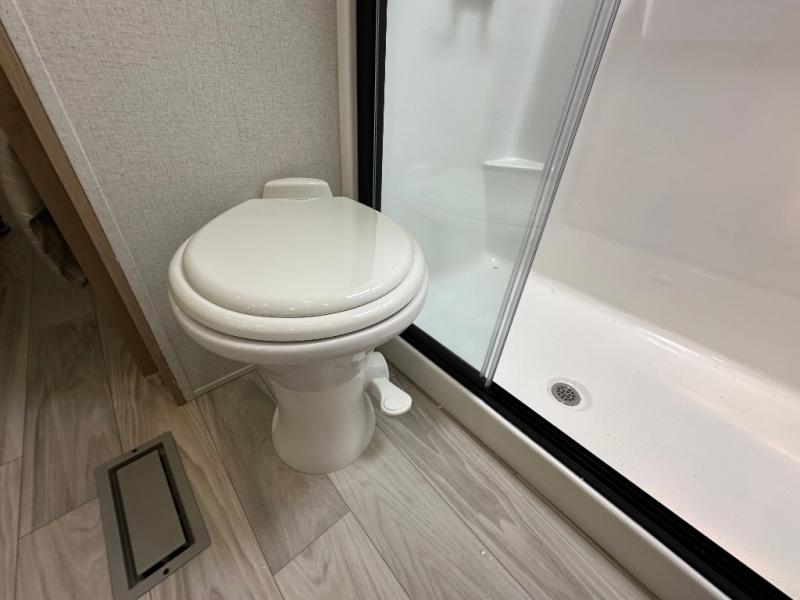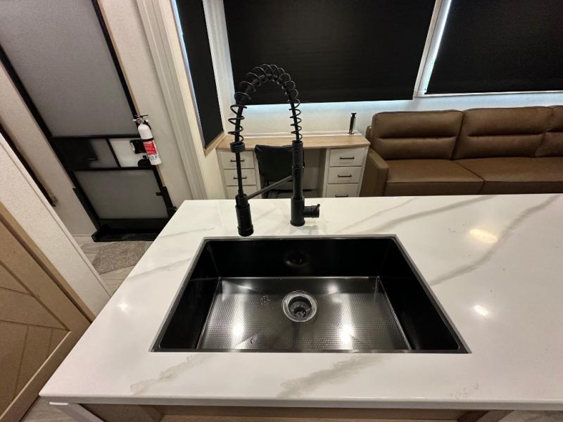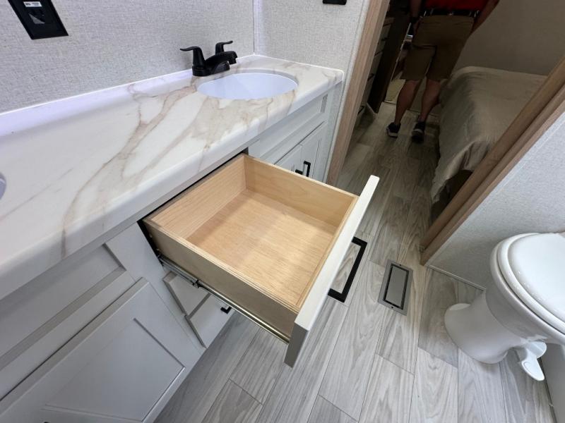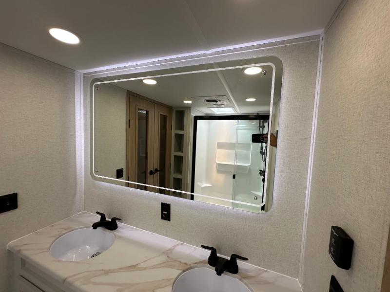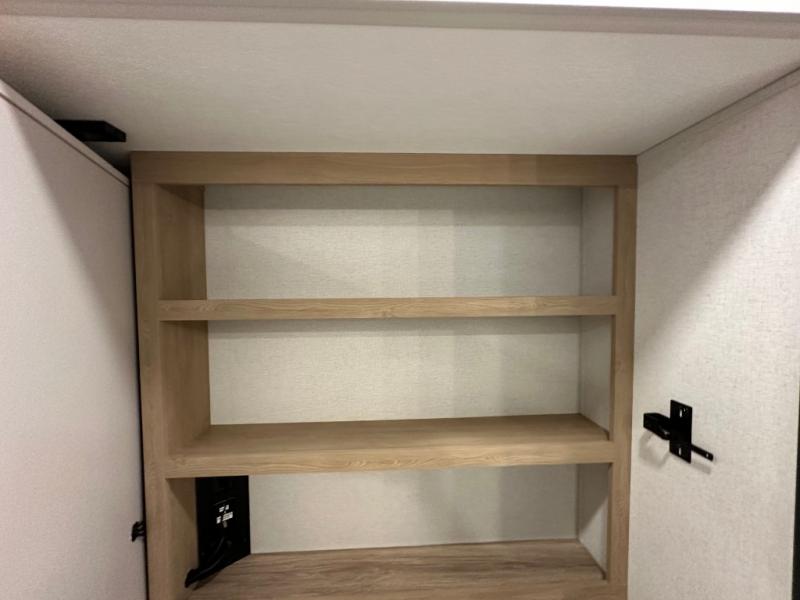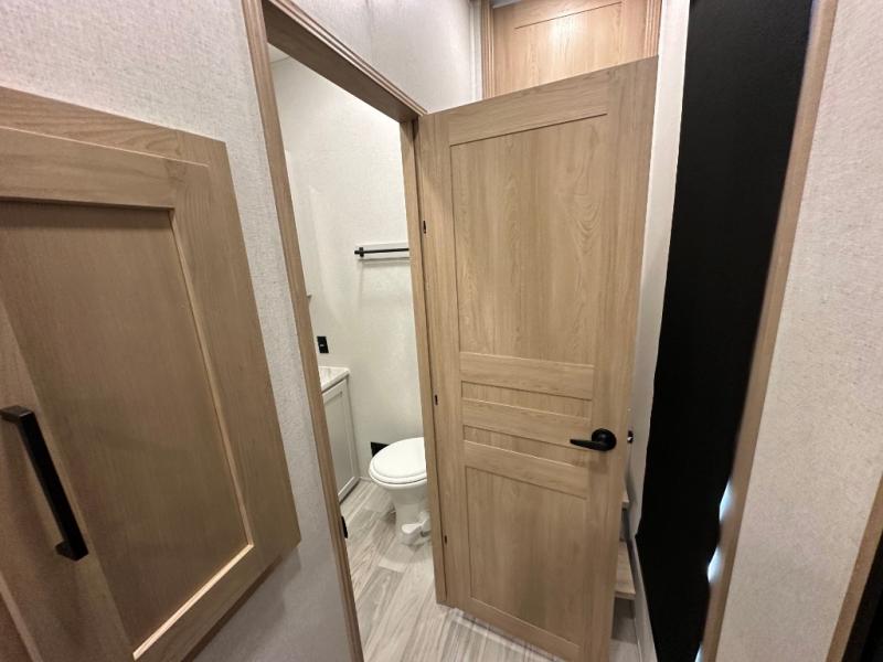 It will be easier than ever to enjoy camping trips in this triple slide out fifth wheel, or even go full-time! The combined kitchen and living area features dual opposing slides for ample space, an L-shaped sofa with a chaise lounge, and a fireplace with a hidden pantry behind for snacks! A desk with a chair and a USB port will provide a place to work if you need to send some emails, and the large kitchen island will give you ample room to prep dinner when you get hungry. There are also pendant lights here, along with a waterfall edge and barstools for dining space. The mid-coach half bath includes a toilet, sink, plus washer and dryer prep, giving you the option to make this the perfect laundry room! The master bedroom up front may be your favorite place to unwind in this unit. There is a king bed slide, a small dresser plus a tall dresser, and a TV hookup if you want the option to watch movies in bed. And you'll be wowed by the front master bedroom with its fiberglass shower with a seat, dual bath sinks, and large walk-in closet!