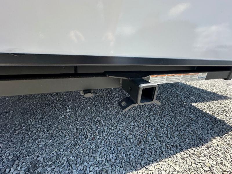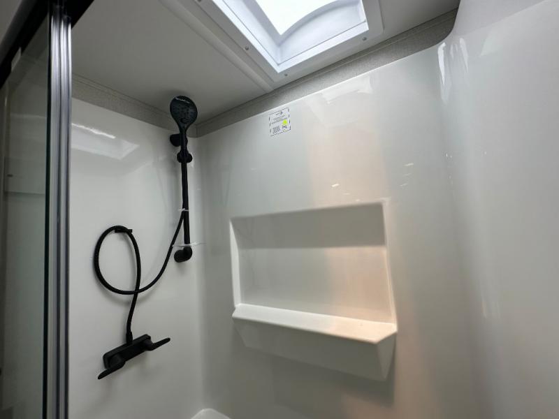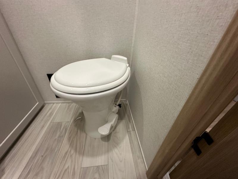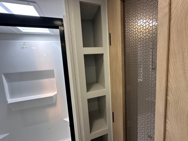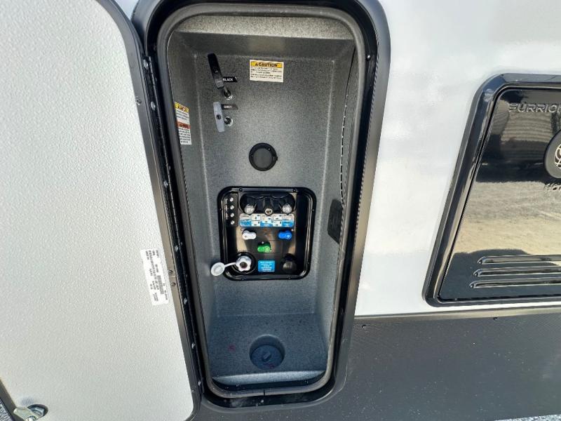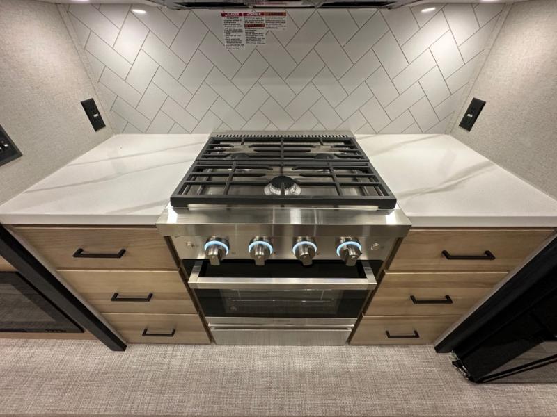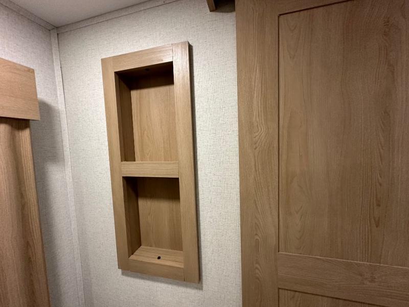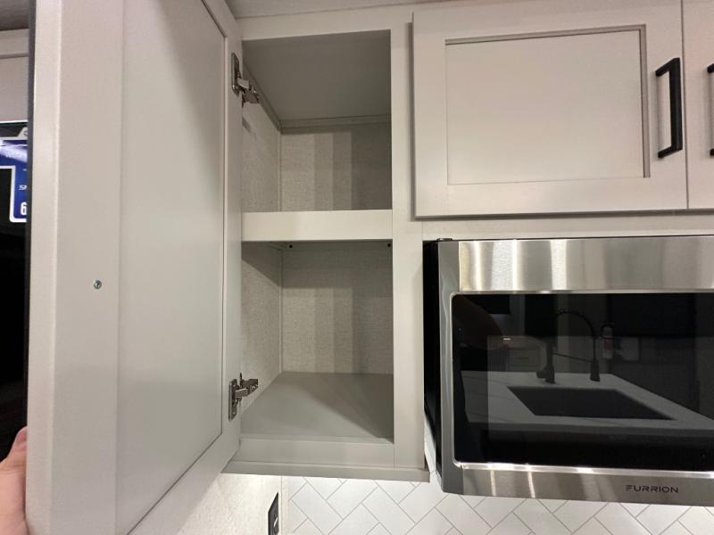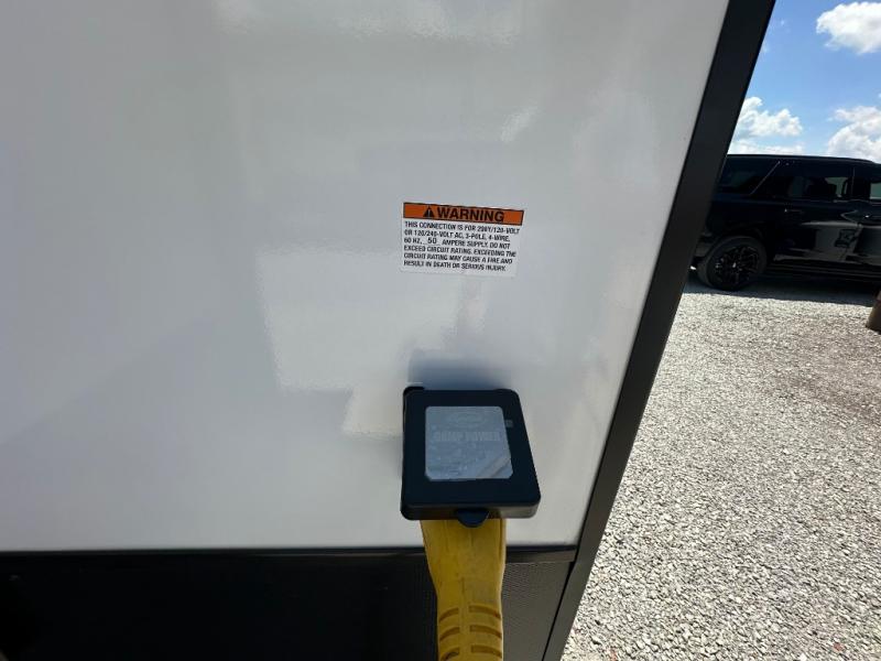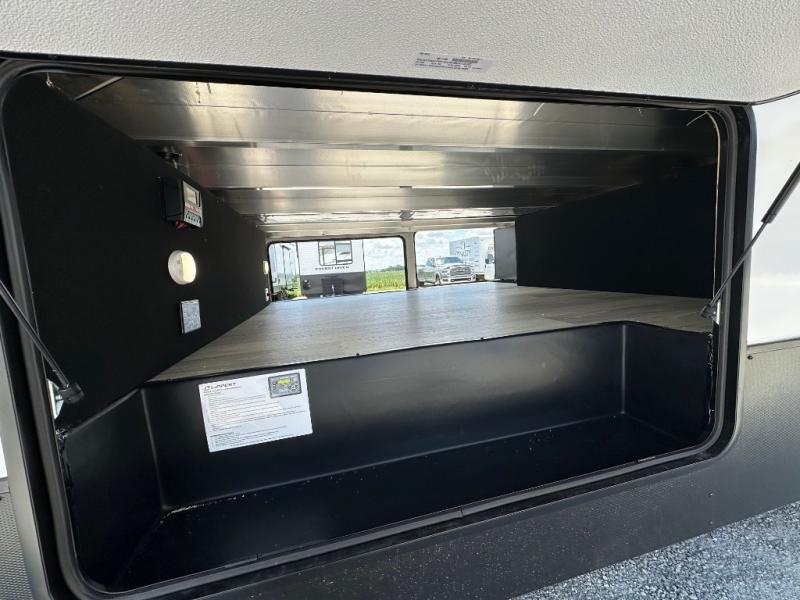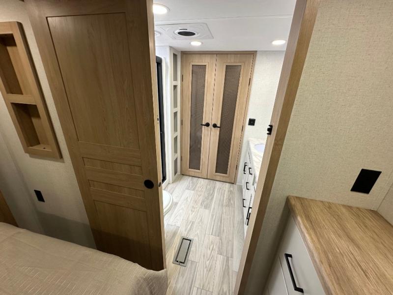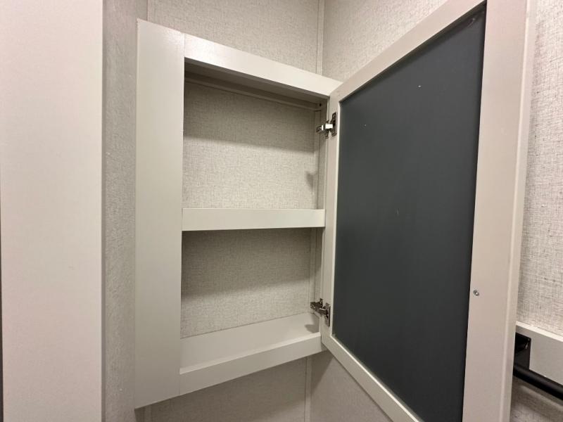 It will be easier than ever to enjoy camping trips in this triple slide out fifth wheel, or even go full-time! The combined kitchen and living area features dual opposing slides for ample space, an L-shaped sofa with a chaise lounge, and a fireplace with a hidden pantry behind for snacks! A desk with a chair and a USB port will provide a place to work if you need to send some emails, and the large kitchen island will give you ample room to prep dinner when you get hungry. There are also pendant lights here, along with a waterfall edge and barstools for dining space. The mid-coach half bath includes a toilet, sink, plus washer and dryer prep, giving you the option to make this the perfect laundry room! The master bedroom up front may be your favorite place to unwind in this unit. There is a king bed slide, a small dresser plus a tall dresser, and a TV hookup if you want the option to watch movies in bed. And you'll be wowed by the front master bedroom with its fiberglass shower with a seat, dual bath sinks, and large walk-in closet!