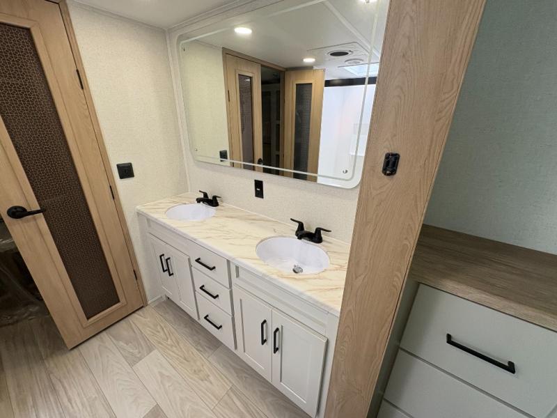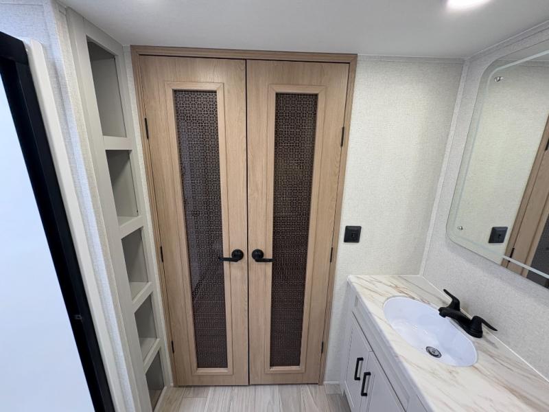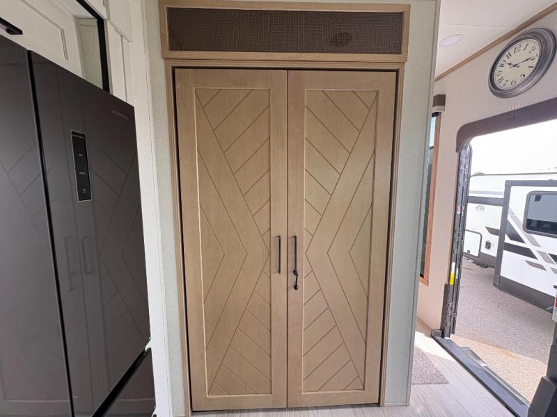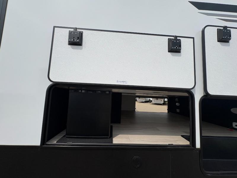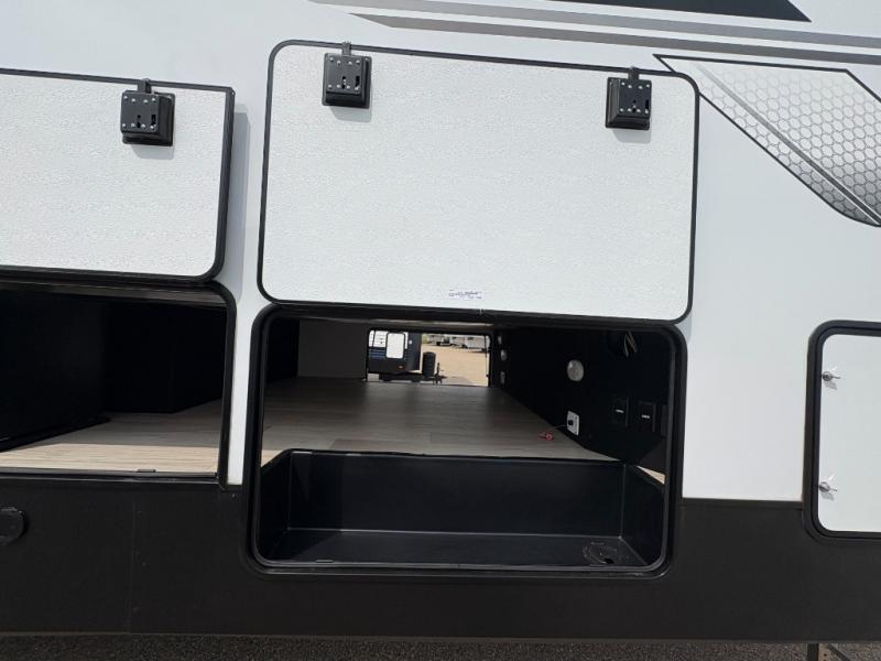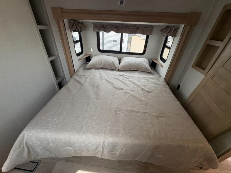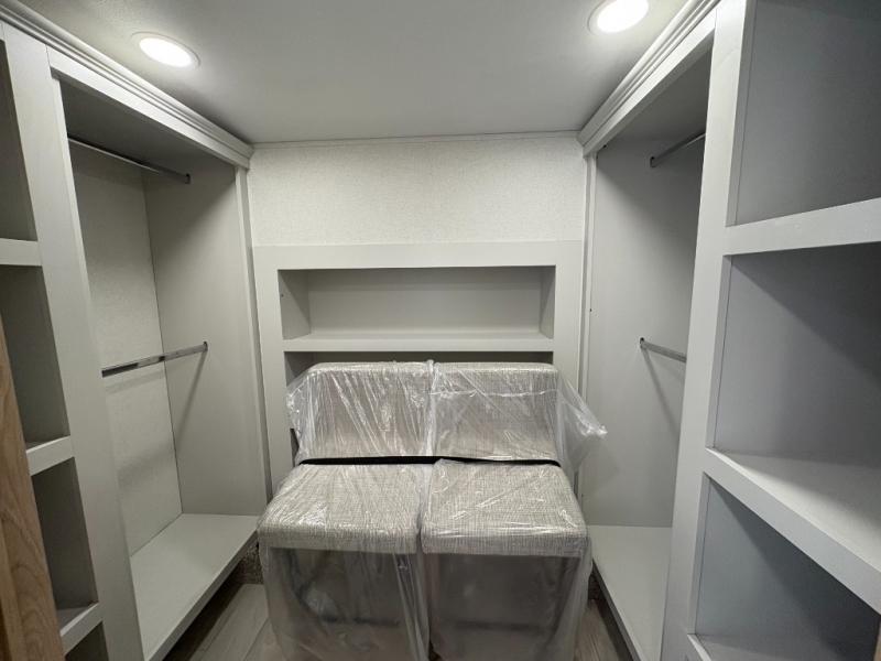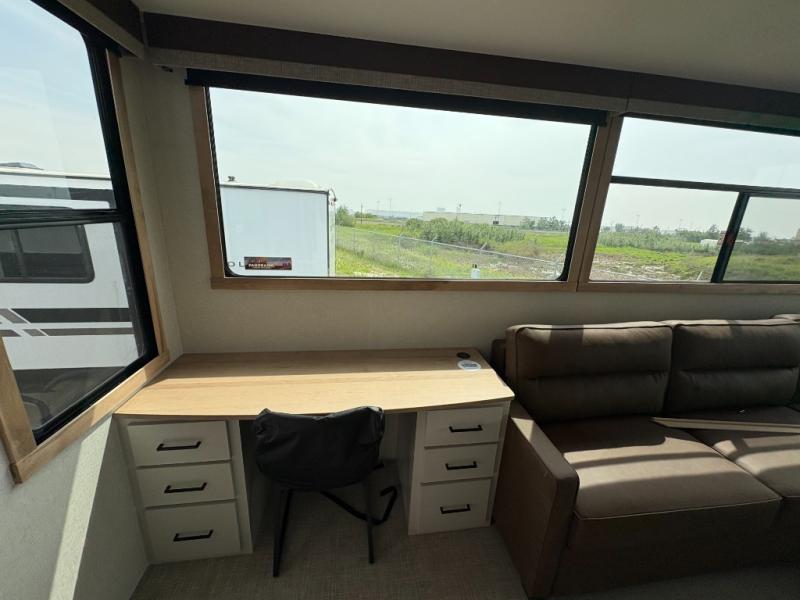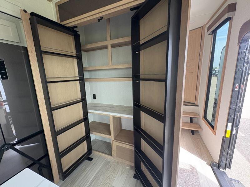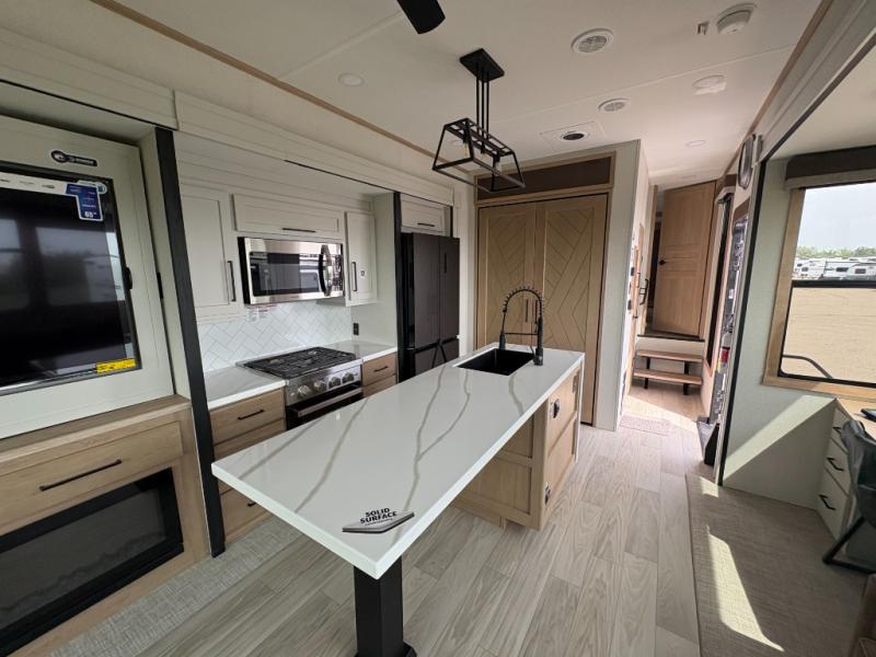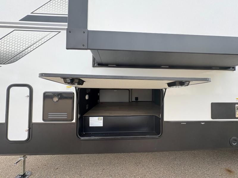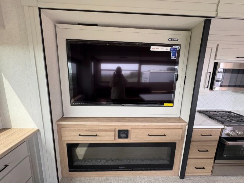 It will be easier than ever to enjoy camping trips in this triple slide out fifth wheel, or even go full-time! The combined kitchen and living area features dual opposing slides for ample space, an L-shaped sofa with a chaise lounge, and a fireplace with a hidden pantry behind for snacks! A desk with a chair and a USB port will provide a place to work if you need to send some emails, and the large kitchen island will give you ample room to prep dinner when you get hungry. There are also pendant lights here, along with a waterfall edge and barstools for dining space. The mid-coach half bath includes a toilet, sink, plus washer and dryer prep, giving you the option to make this the perfect laundry room! The master bedroom up front may be your favorite place to unwind in this unit. There is a king bed slide, a small dresser plus a tall dresser, and a TV hookup if you want the option to watch movies in bed. And you'll be wowed by the front master bedroom with its fiberglass shower with a seat, dual bath sinks, and large walk-in closet!