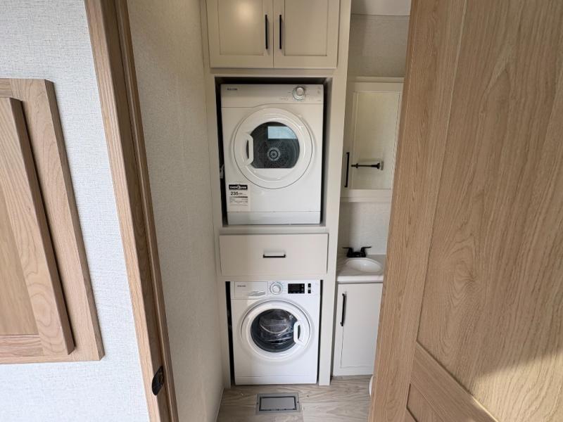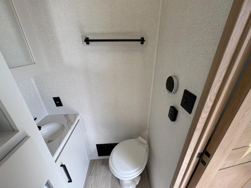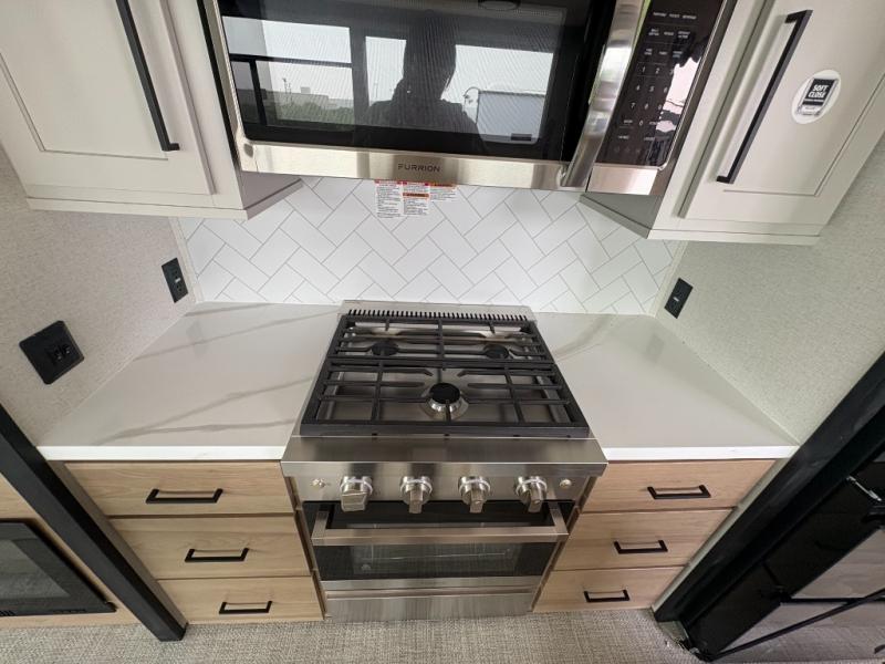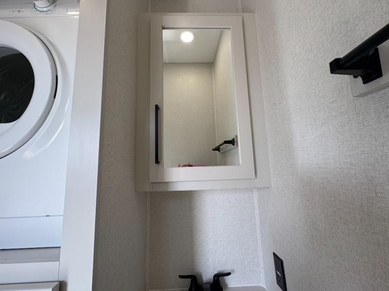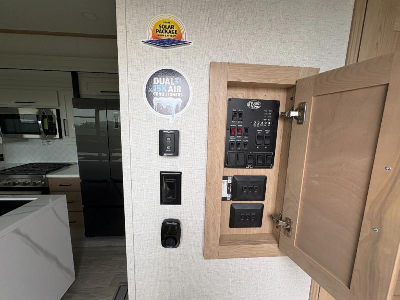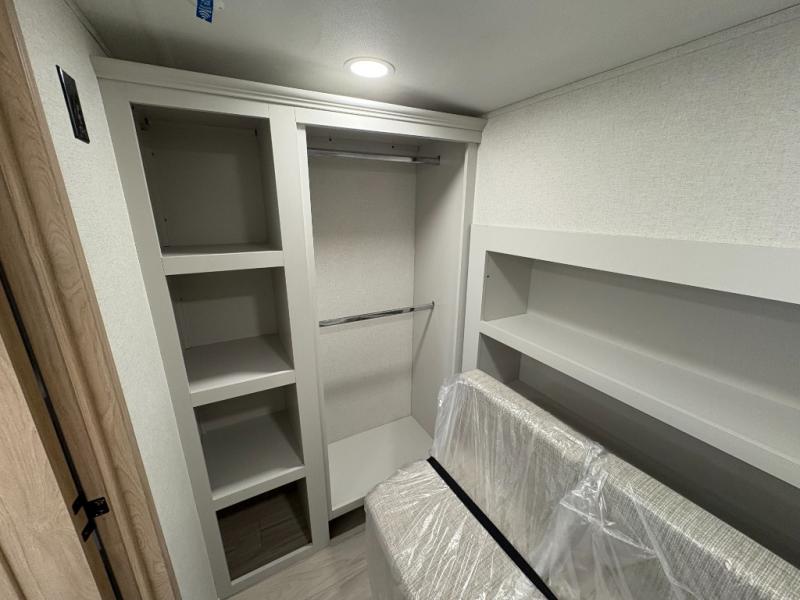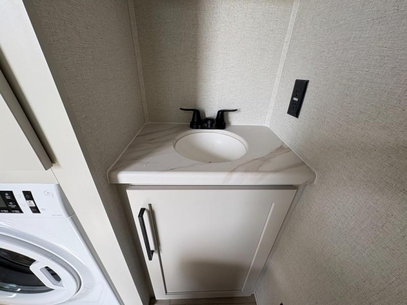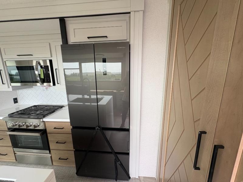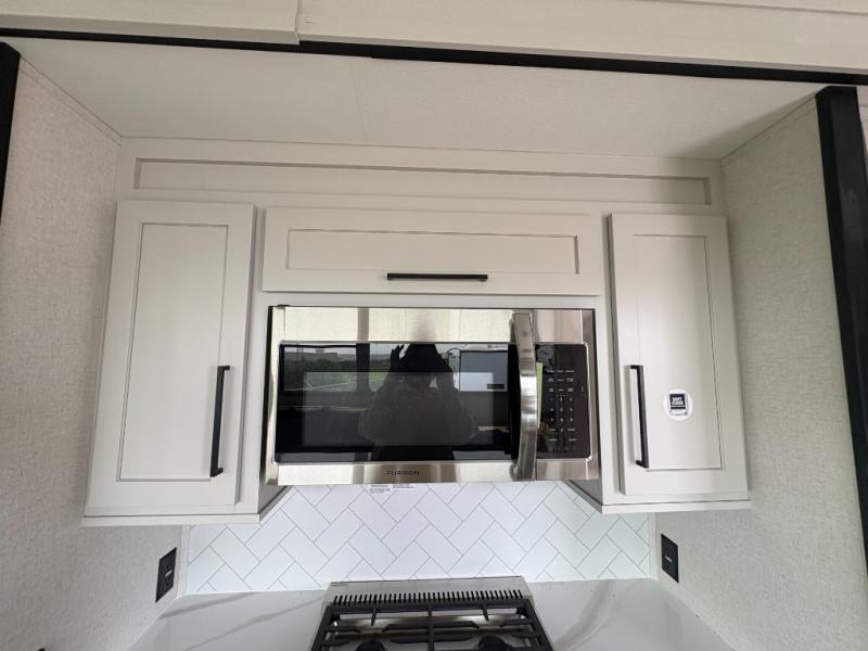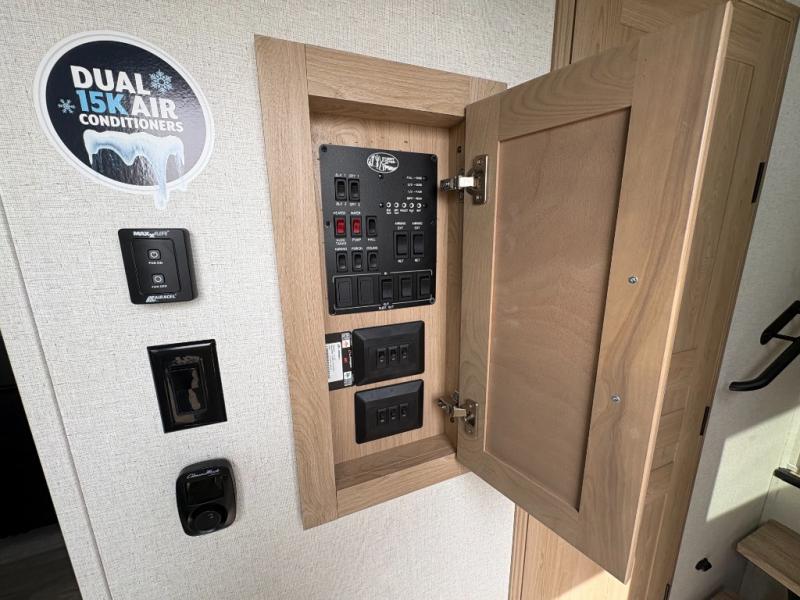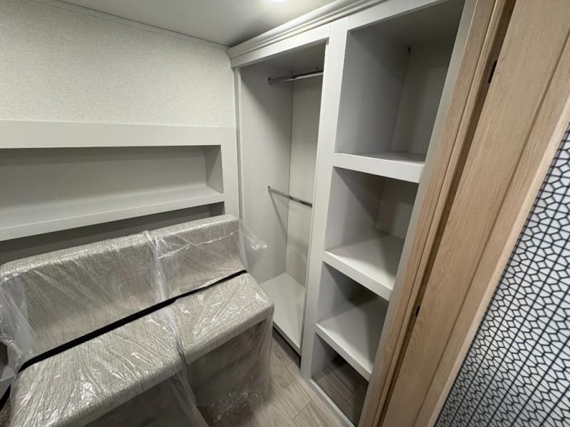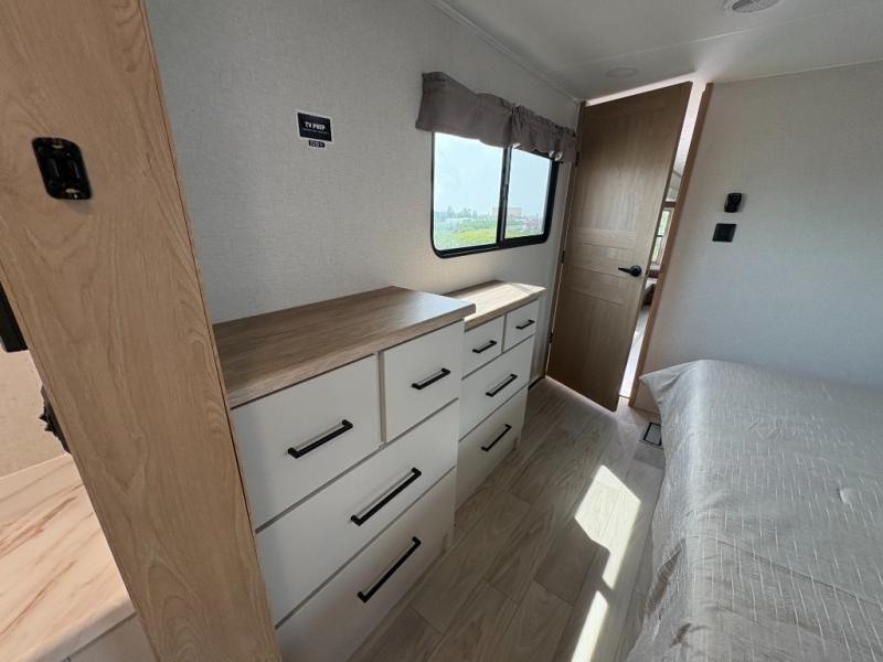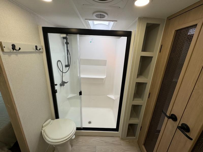 It will be easier than ever to enjoy camping trips in this triple slide out fifth wheel, or even go full-time! The combined kitchen and living area features dual opposing slides for ample space, an L-shaped sofa with a chaise lounge, and a fireplace with a hidden pantry behind for snacks! A desk with a chair and a USB port will provide a place to work if you need to send some emails, and the large kitchen island will give you ample room to prep dinner when you get hungry. There are also pendant lights here, along with a waterfall edge and barstools for dining space. The mid-coach half bath includes a toilet, sink, plus washer and dryer prep, giving you the option to make this the perfect laundry room! The master bedroom up front may be your favorite place to unwind in this unit. There is a king bed slide, a small dresser plus a tall dresser, and a TV hookup if you want the option to watch movies in bed. And you'll be wowed by the front master bedroom with its fiberglass shower with a seat, dual bath sinks, and large walk-in closet!
