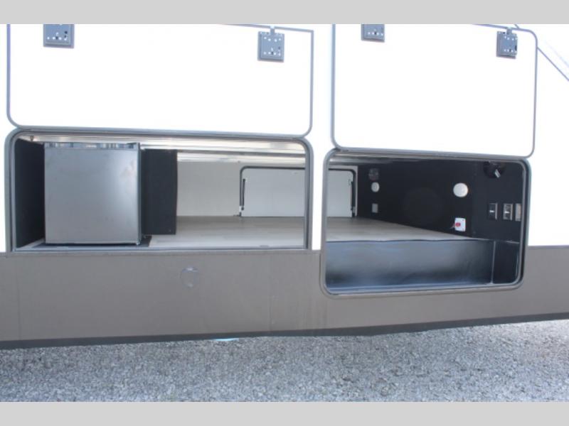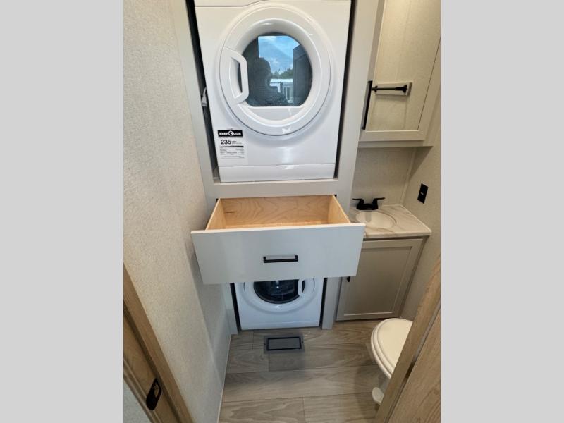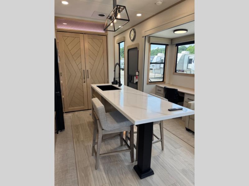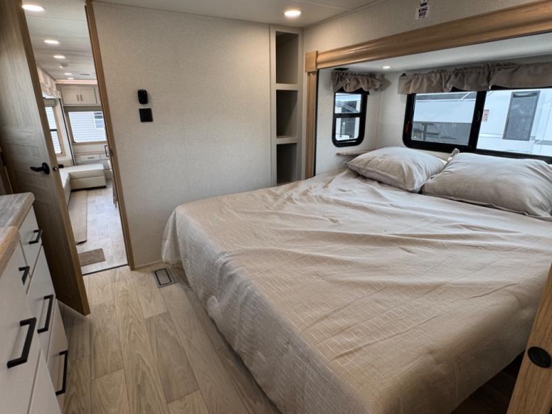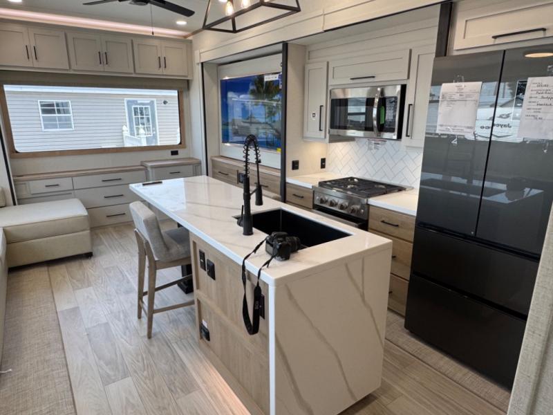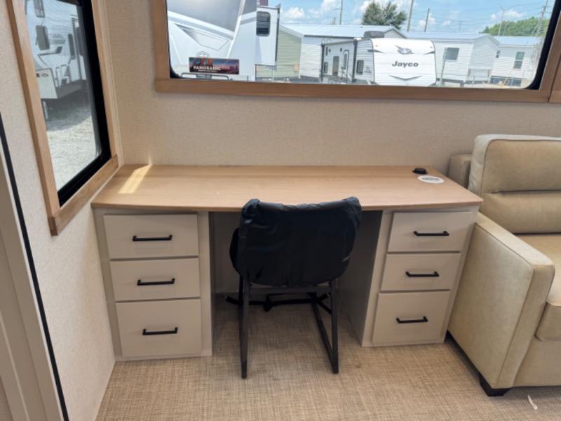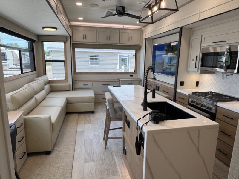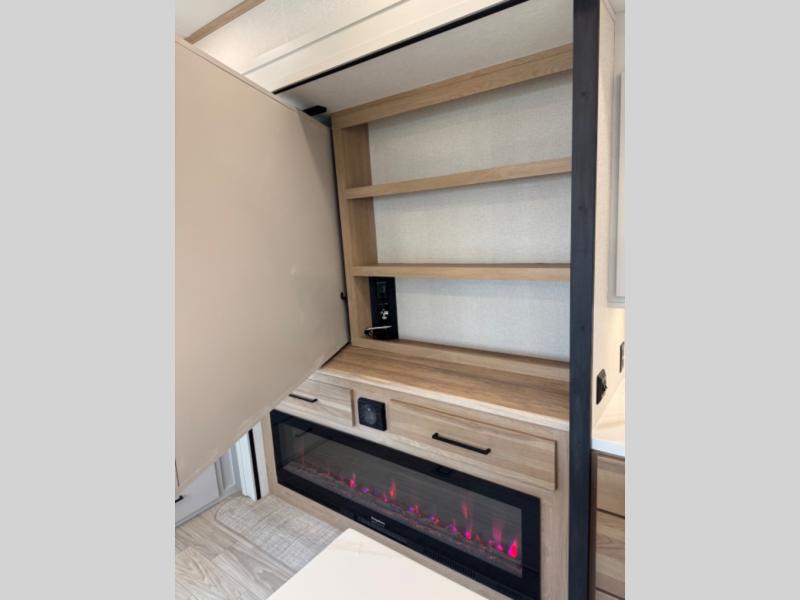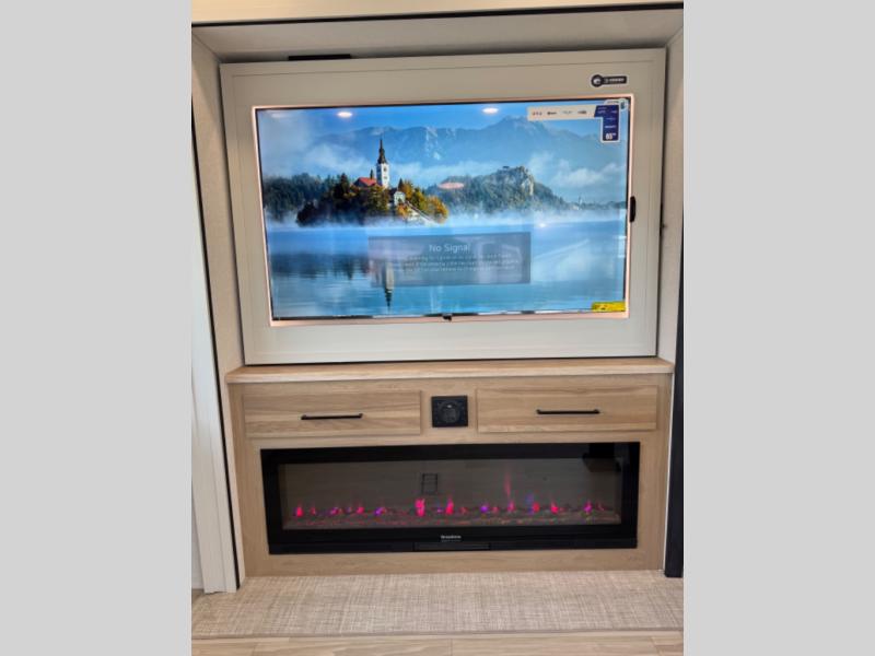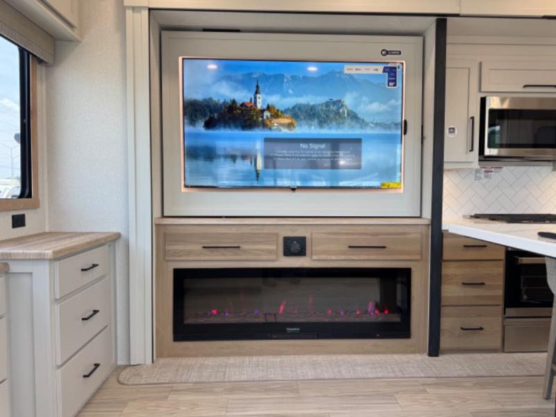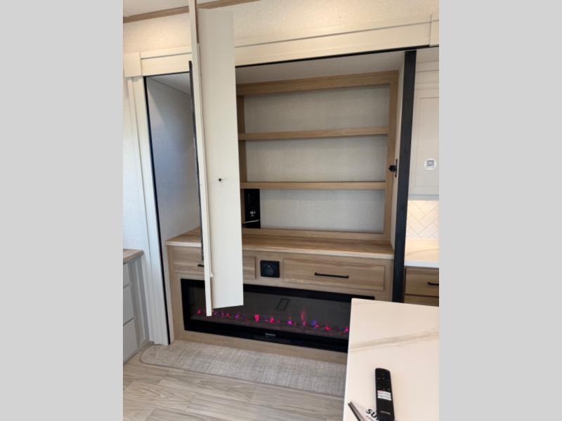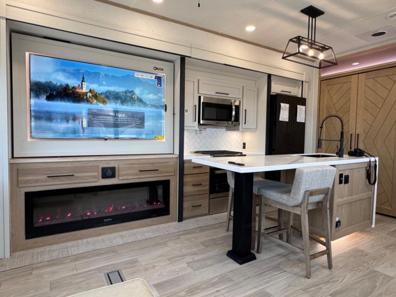 It will be easier than ever to enjoy camping trips in this triple slide out fifth wheel, or even go full-time! The combined kitchen and living area features dual opposing slides for ample space, an L-shaped sofa with a chaise lounge, and a fireplace with a hidden pantry behind for snacks! A desk with a chair and a USB port will provide a place to work if you need to send some emails, and the large kitchen island will give you ample room to prep dinner when you get hungry. There are also pendant lights here, along with a waterfall edge and barstools for dining space. The mid-coach half bath includes a toilet, sink, plus washer and dryer prep, giving you the option to make this the perfect laundry room! The master bedroom up front may be your favorite place to unwind in this unit. There is a king bed slide, a small dresser plus a tall dresser, and a TV hookup if you want the option to watch movies in bed. And you'll be wowed by the front master bedroom with its fiberglass shower with a seat, dual bath sinks, and large walk-in closet!