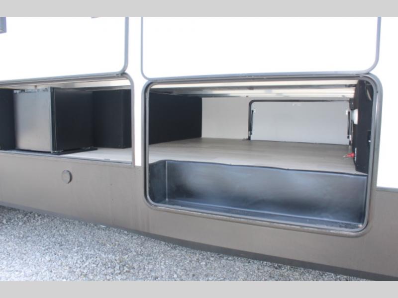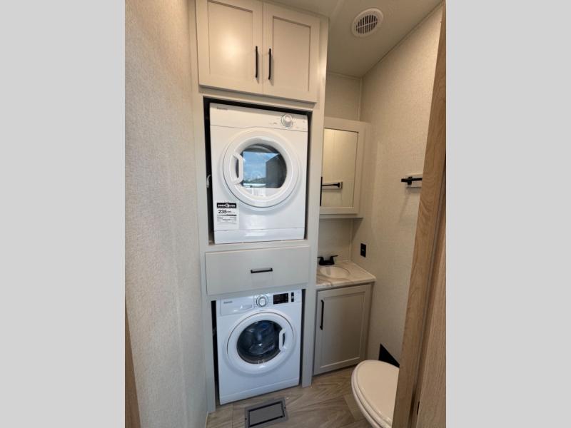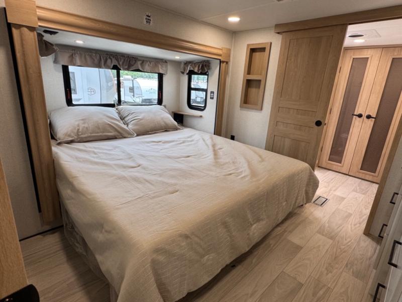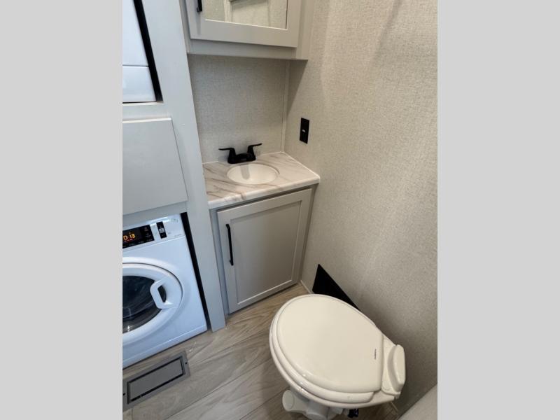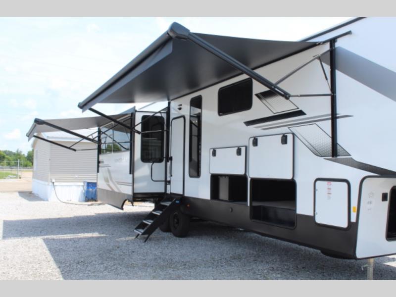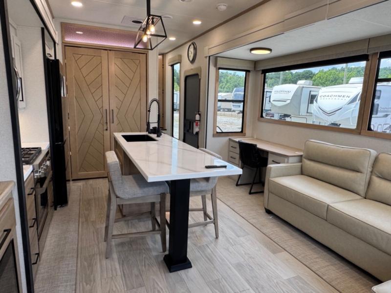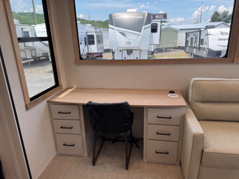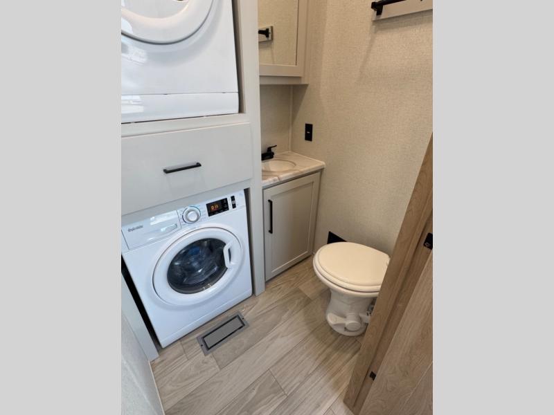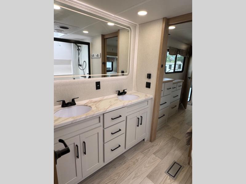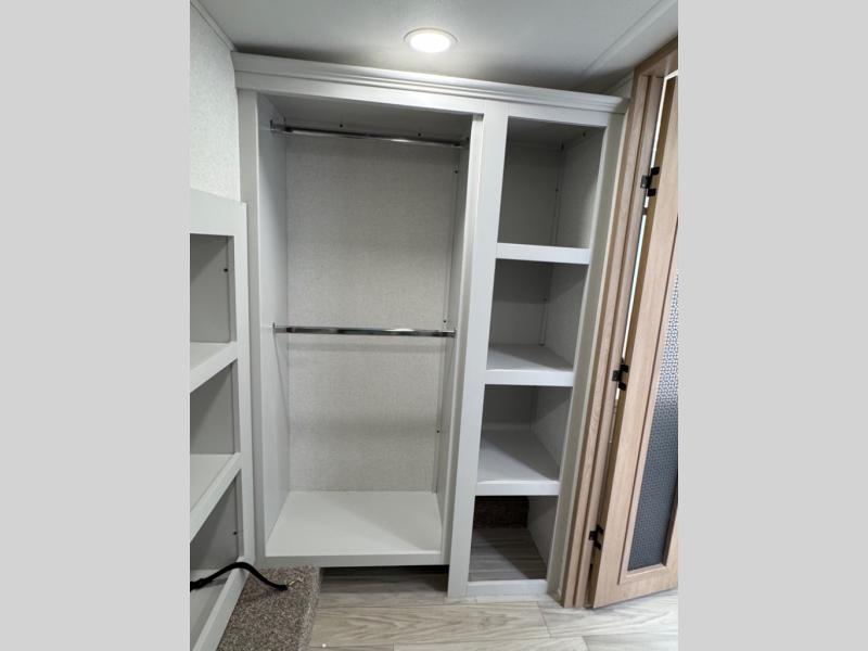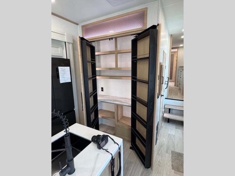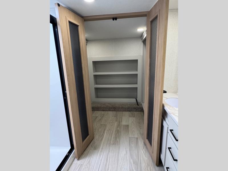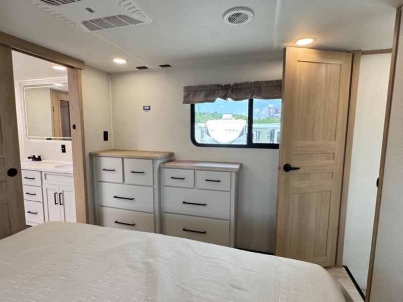 It will be easier than ever to enjoy camping trips in this triple slide out fifth wheel, or even go full-time! The combined kitchen and living area features dual opposing slides for ample space, an L-shaped sofa with a chaise lounge, and a fireplace with a hidden pantry behind for snacks! A desk with a chair and a USB port will provide a place to work if you need to send some emails, and the large kitchen island will give you ample room to prep dinner when you get hungry. There are also pendant lights here, along with a waterfall edge and barstools for dining space. The mid-coach half bath includes a toilet, sink, plus washer and dryer prep, giving you the option to make this the perfect laundry room! The master bedroom up front may be your favorite place to unwind in this unit. There is a king bed slide, a small dresser plus a tall dresser, and a TV hookup if you want the option to watch movies in bed. And you'll be wowed by the front master bedroom with its fiberglass shower with a seat, dual bath sinks, and large walk-in closet!